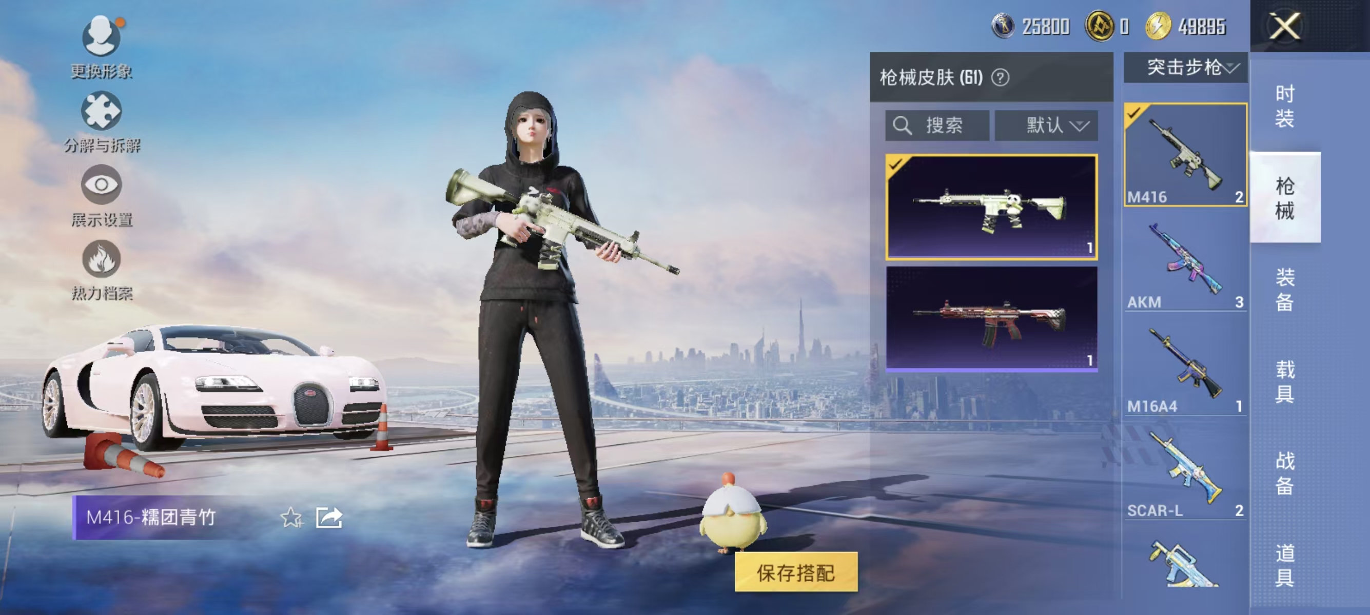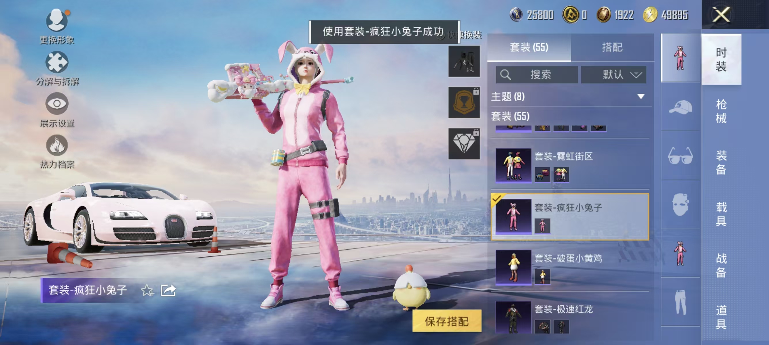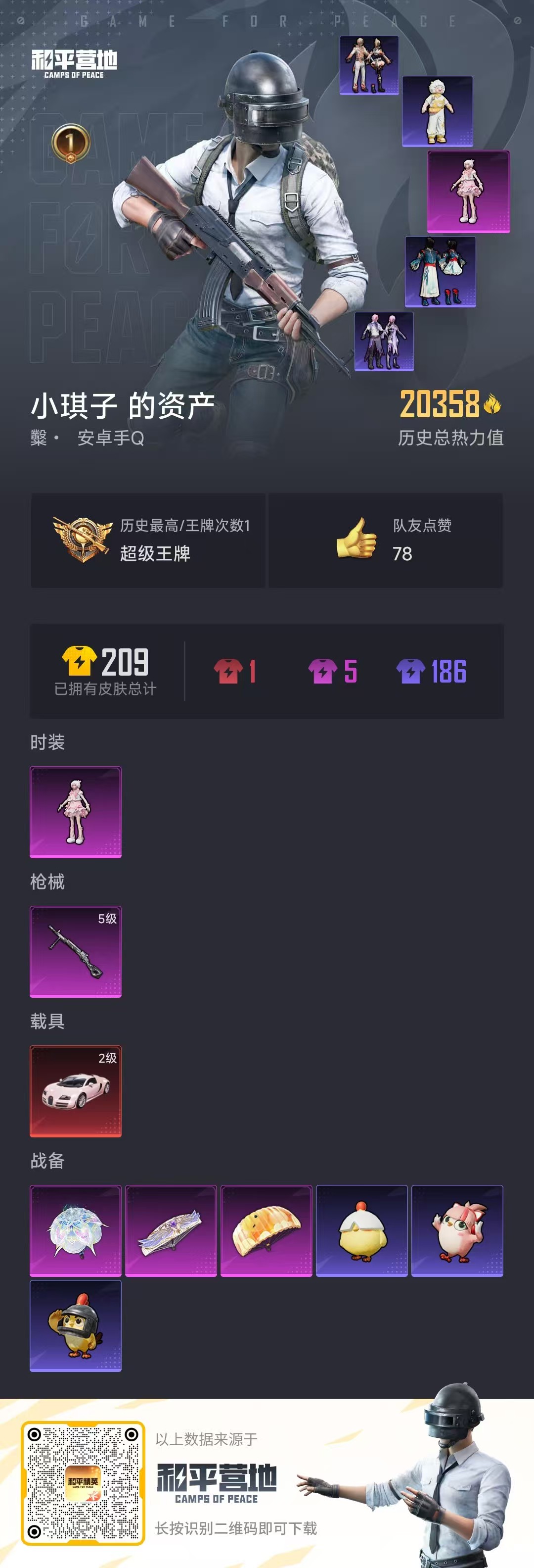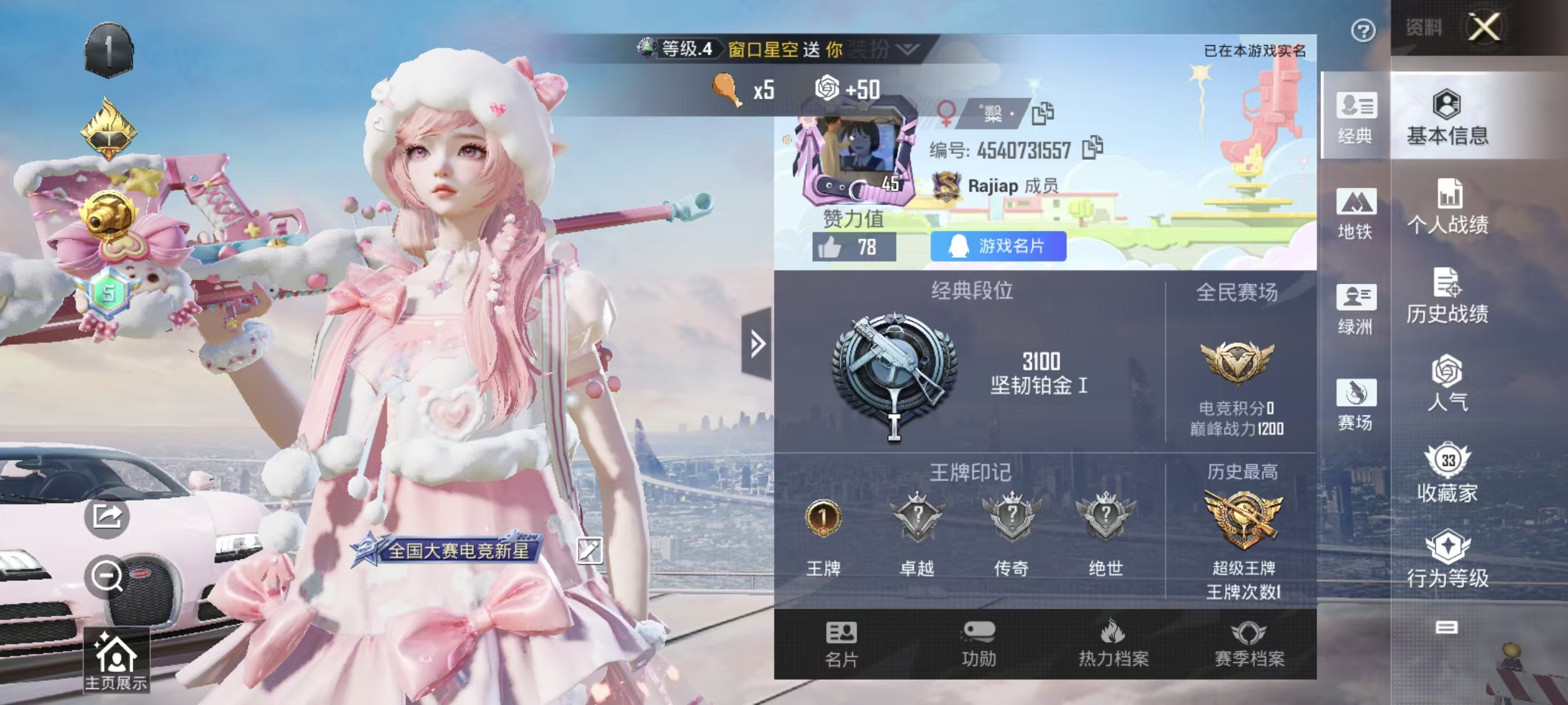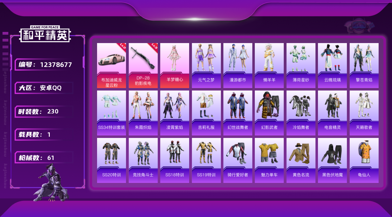 [12378677]实名: 可修改 时装数: 230 载具数: 1 枪械数: 61 战备数: 36 热门装扮: 羊梦糖心 载具: 布加迪威龙(星云粉) 稀有枪皮: DP-28-豹影疾电