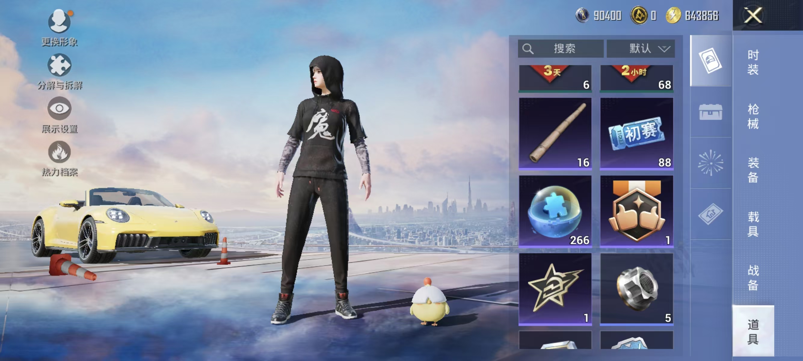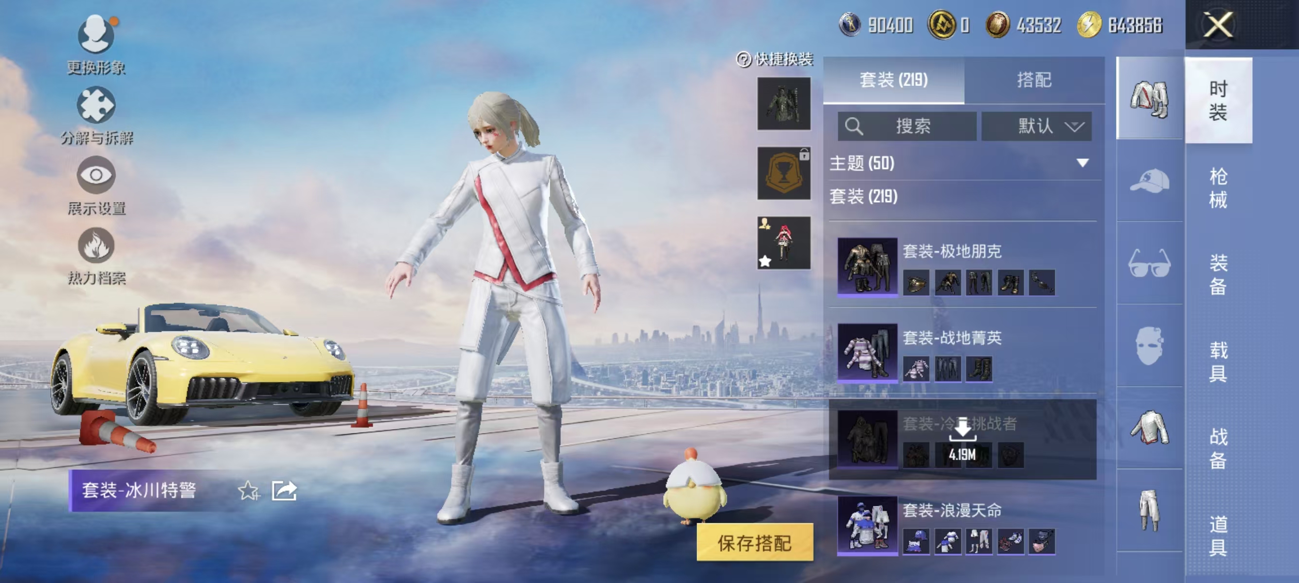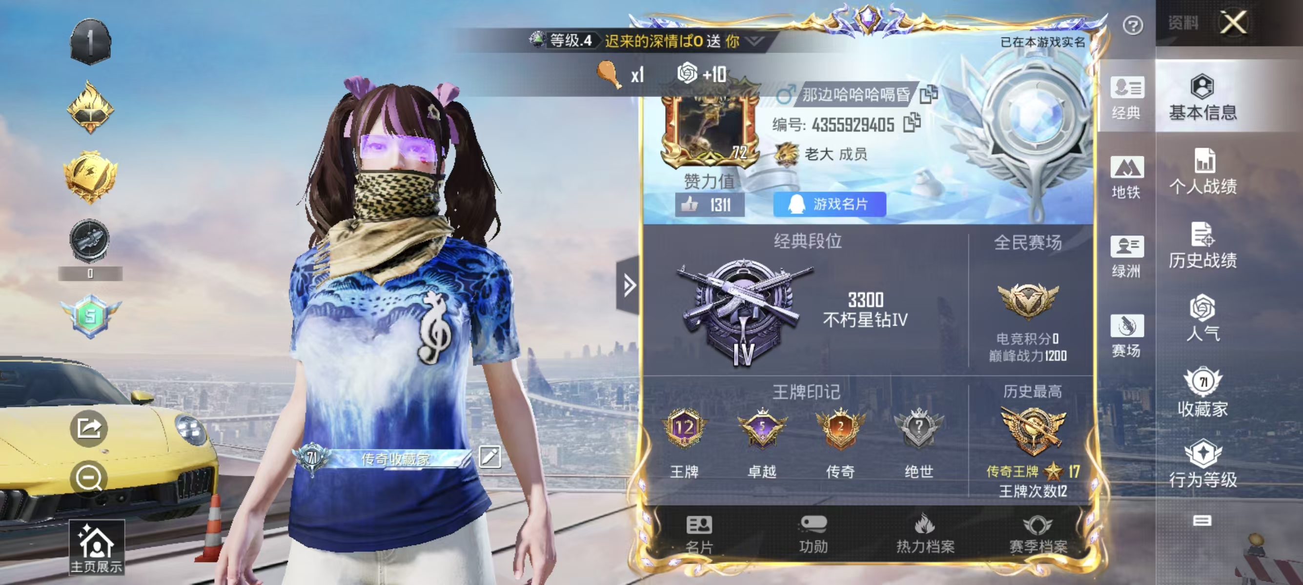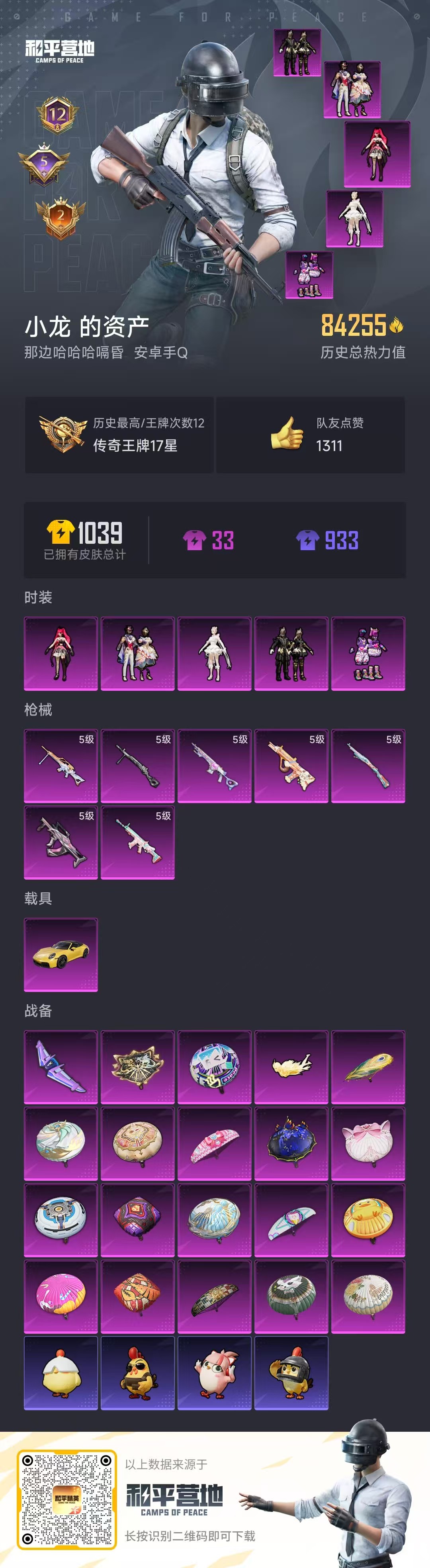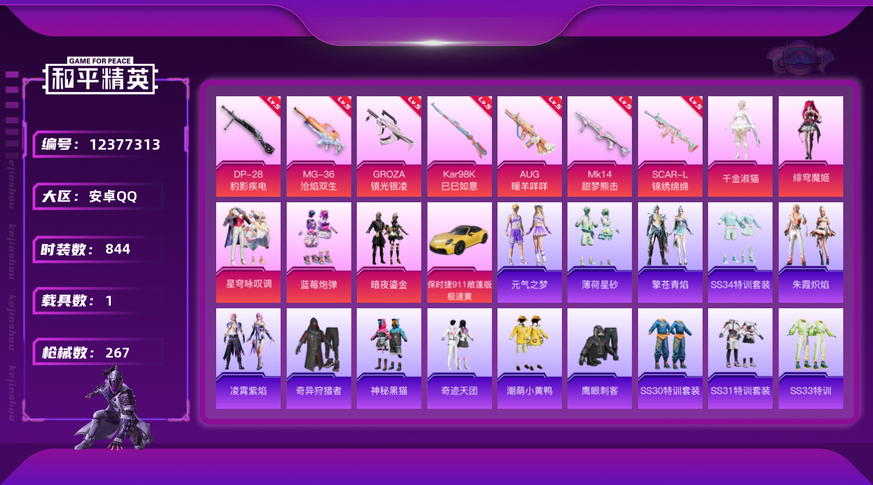 [12377313]实名: 可修改 时装数: 844 载具数: 1 枪械数: 267 战备数: 210 热门装扮: 奇异狩猎者,鹰眼刺客,蓝莓炮弹,潮萌小黄鸭,奇迹天团,神秘黑猫,暗夜鎏金,千金淑猫,星穹咏叹调,绯穹魔姬 载具: 保时捷911敞篷版(极速黄) 稀有枪皮: SCAR-L-锦绣绵绵,GROZA-镜光银凌,Kar98K-巳巳如意,AUG-暖羊咩咩,MK14-甜梦熊击,DP-28-豹影疾电,MG-36-沧焰双生