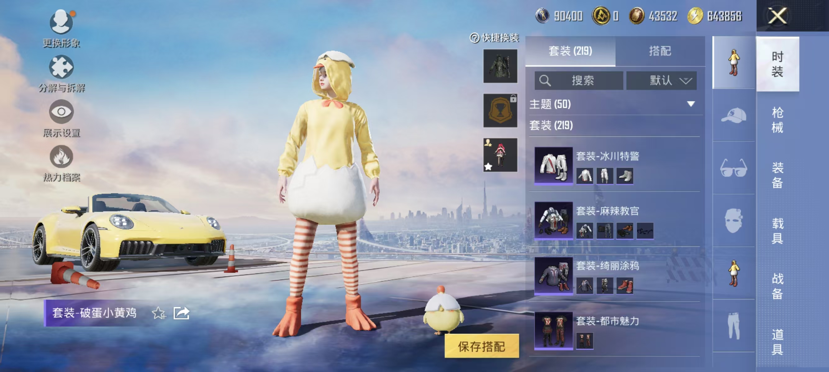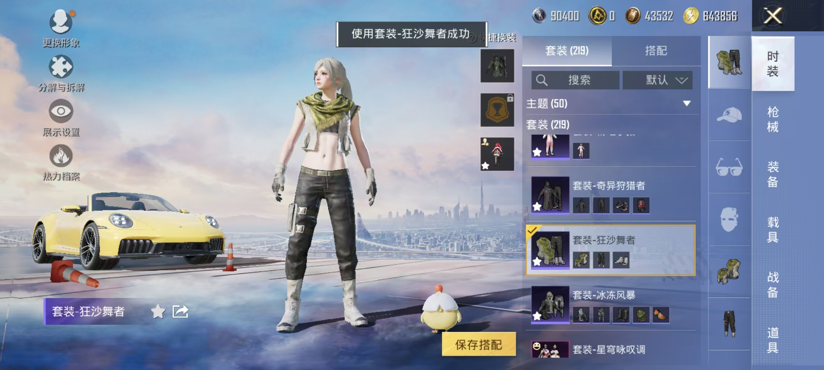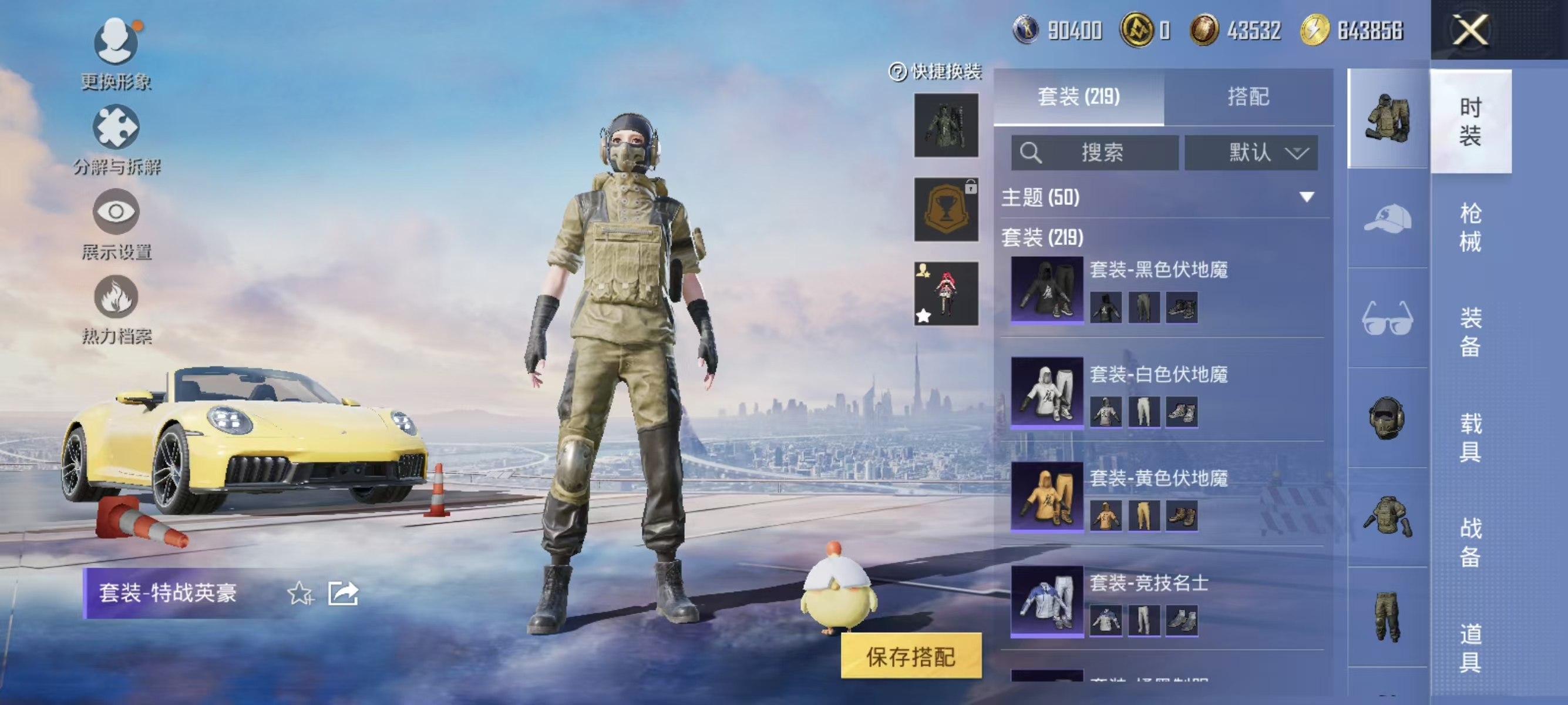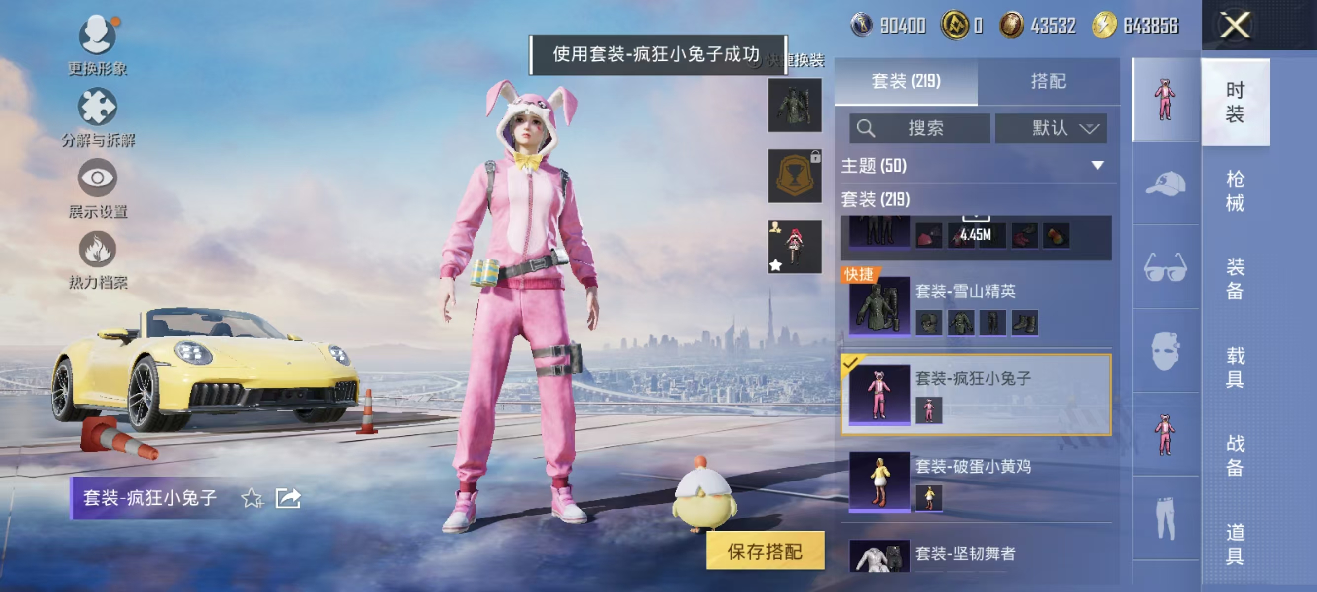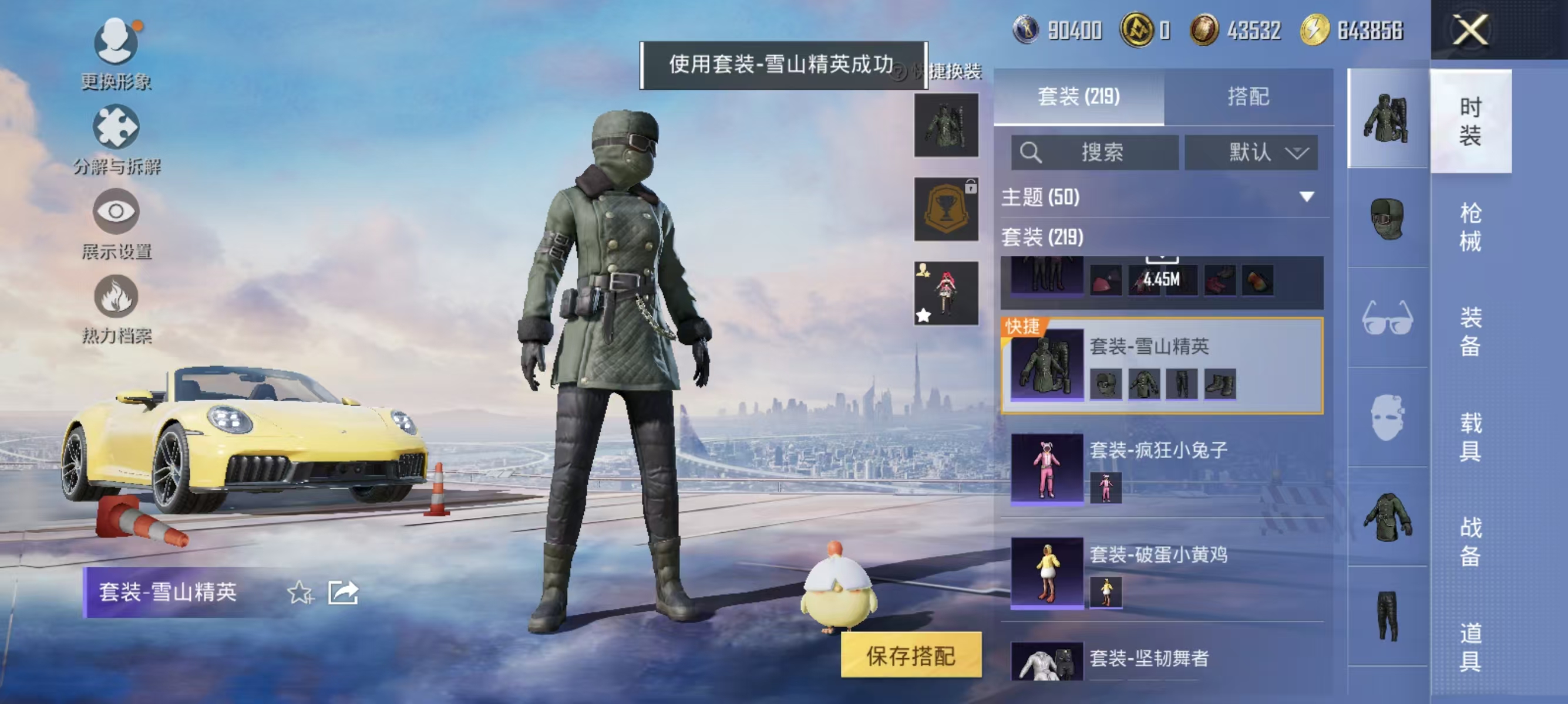 [12377313]实名: 可修改 时装数: 844 载具数: 1 枪械数: 267 战备数: 210 热门装扮: 奇异狩猎者,鹰眼刺客,蓝莓炮弹,潮萌小黄鸭,奇迹天团,神秘黑猫,暗夜鎏金,千金淑猫,星穹咏叹调,绯穹魔姬 载具: 保时捷911敞篷版(极速黄) 稀有枪皮: SCAR-L-锦绣绵绵,GROZA-镜光银凌,Kar98K-巳巳如意,AUG-暖羊咩咩,MK14-甜梦熊击,DP-28-豹影疾电,MG-36-沧焰双生
