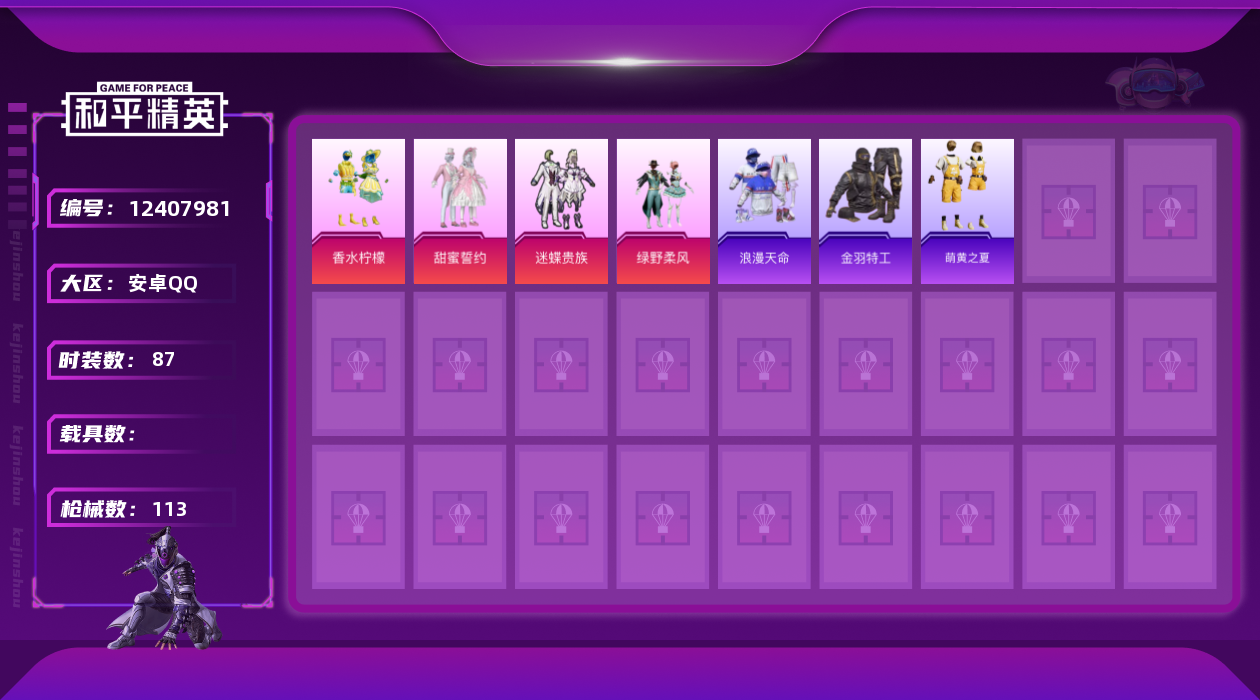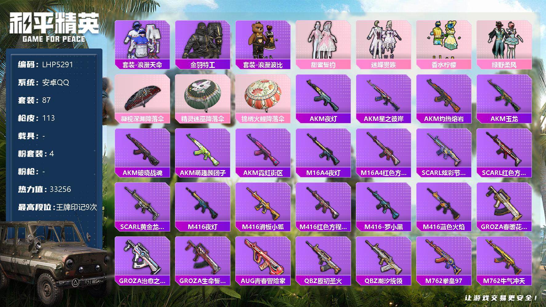 [12407981]【特价急出/详情看图】:安卓 手Q-4粉装-3.3w热力值-9王牌印记-87套装-113枪皮【热门品类】:套装-浪漫天命,套装-金羽特工,套装-浪漫波比【粉色套装】:粉装-甜蜜誓约,粉装-迷蝶贵族,粉装-香水柠檬,粉装-绿野柔风