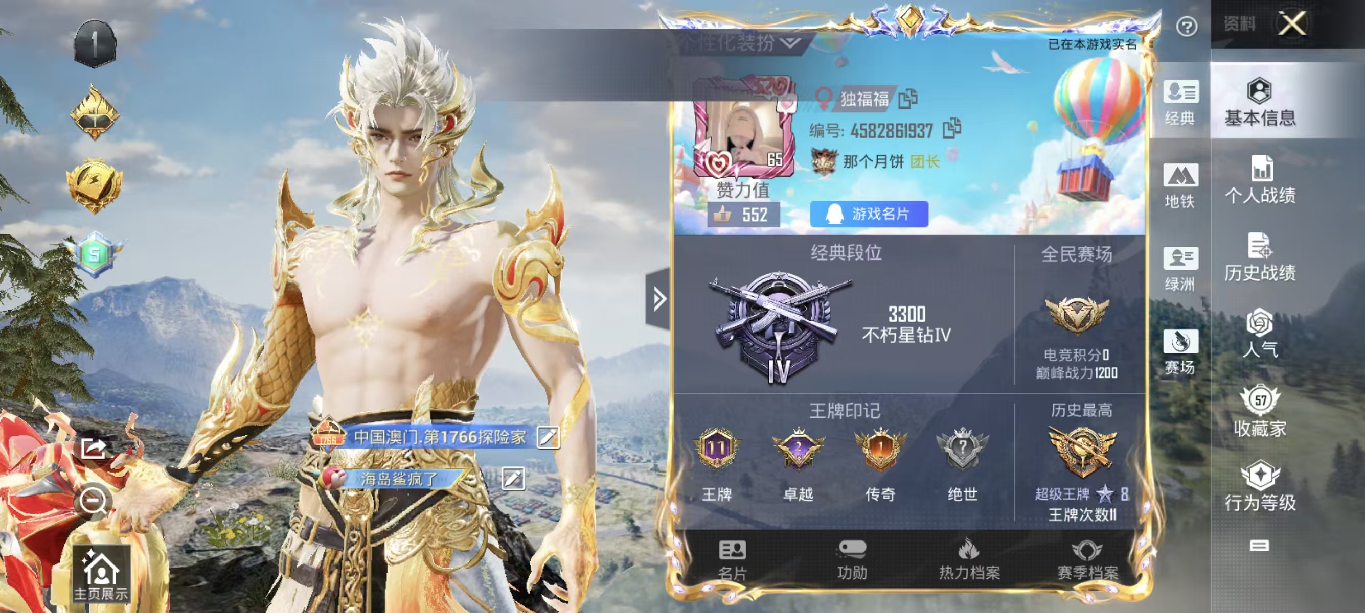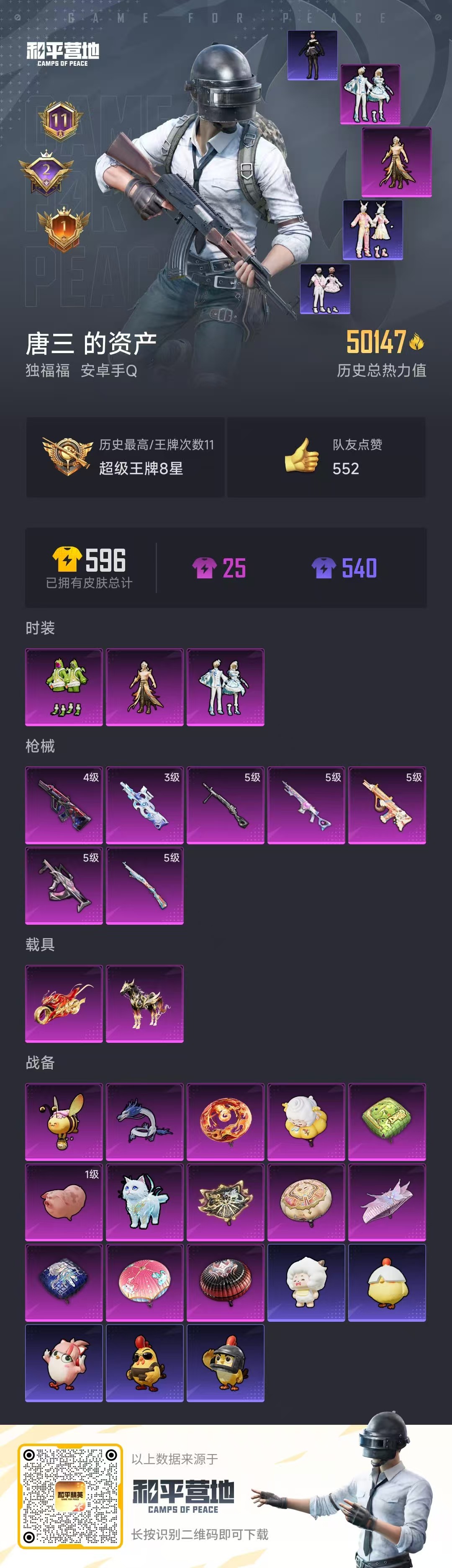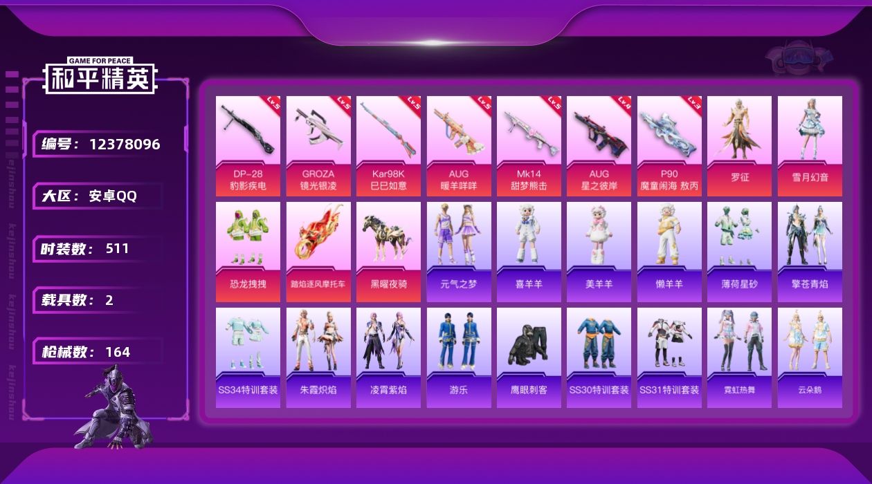 [12378096]实名: 可修改 时装数: 511 载具数: 2 枪械数: 164 战备数: 114 热门装扮: 鹰眼刺客,恐龙拽拽,雪月幻音,罗征 载具: 黑曜夜骑,踏焰逐风摩托车 稀有枪皮: AUG星之彼岸,GROZA-镜光银凌,Kar98K-巳巳如意,AUG-暖羊咩咩,MK14-甜梦熊击,DP-28-豹影疾电,P90-魔童闹海 敖丙