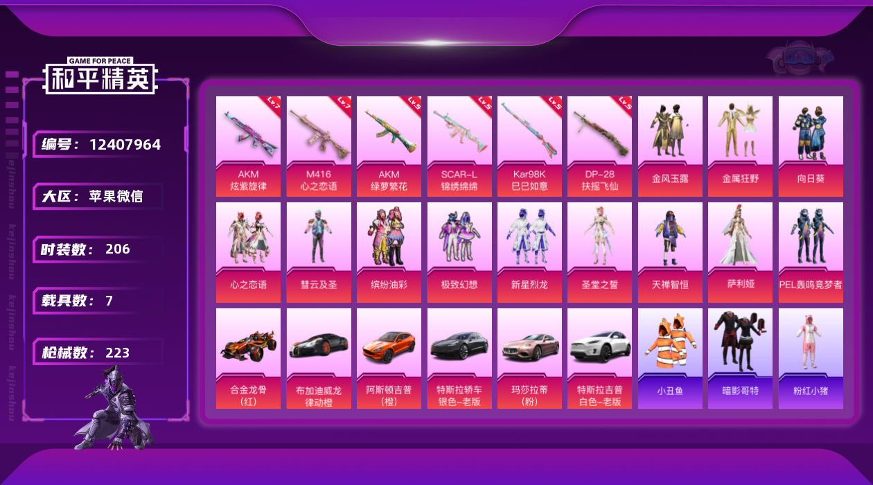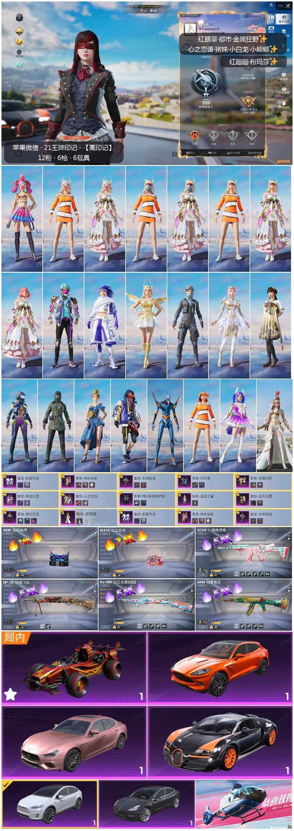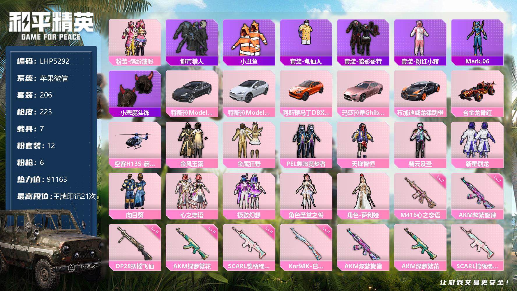 [12407964]素材身法号【特价急出/详情看图】:苹果 微信-12粉装-6特效枪-7载具-5粉色飞行器-9.1w热力值-21王牌印记-206套装-223枪皮【热门品类】:粉装-缤纷油彩,套装-都市猎人,套装-小丑鱼,套装-龟仙人,套装-暗影哥特,套装-粉红小猪,角色-Mark.06,小恶魔头饰【粉色载具】:特斯拉Model 3(冷光银),特斯拉Model X(珍珠白),阿斯顿马丁DBX(橙),玛莎拉蒂Ghibli(粉),布加迪威龙(律动橙),合金龙骨(红),空客H135-蔚蓝之翼【粉色套装】:粉装-金风玉露,粉装-金属狂野,粉装-缤纷油彩,粉装-PEL轰鸣竞梦者,粉装-天禅智恒,粉装-彗云及圣,粉装-新星烈龙,粉装-向日葵,粉装-心之恋语,粉装-极致幻想,角色-圣堂之誓,角色-萨利娅【粉色枪皮等级】:AKM-炫紫旋律(七级),AKM-绿萝繁花(五级),SCAR-L-锦绣绵绵(五级),M416-心之恋语(七级),Kar98K-巳巳如意(五级),DP-28-扶摇飞仙(五级)【粉色飞行器】:深海曼妙飞行器,炫紫旋律飞行器,神秘黑猫飞行器,心之恋语飞行翼