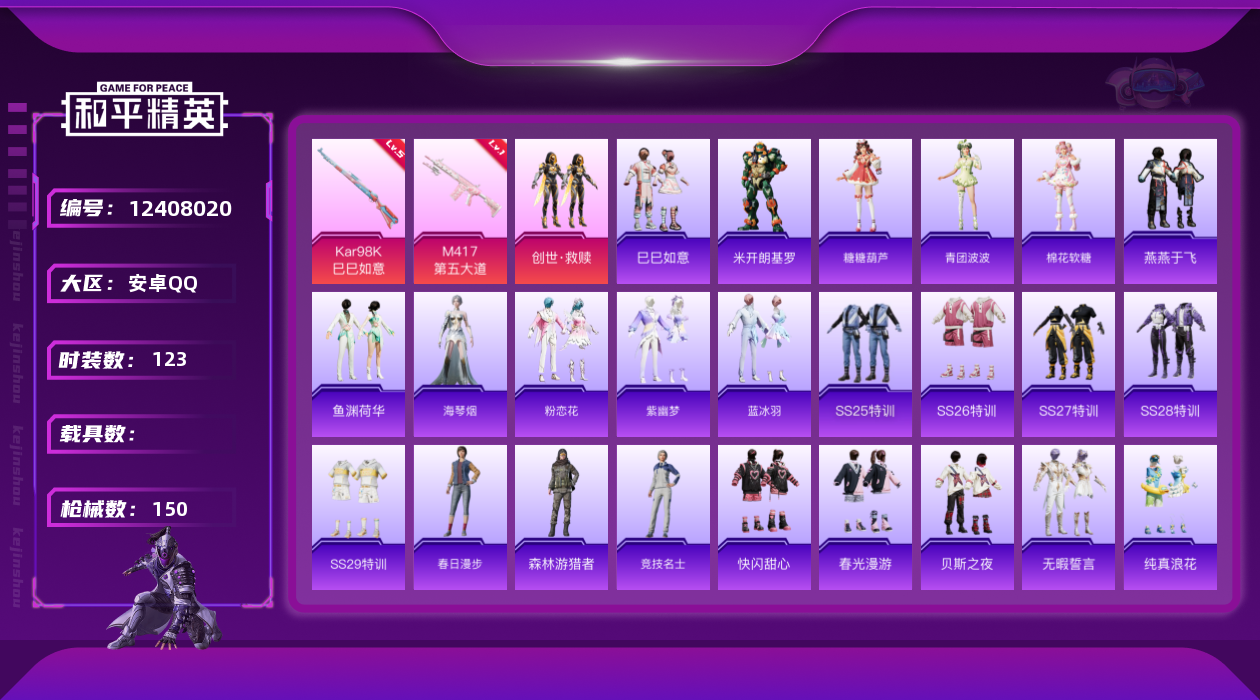 [12408020]地铁满天赋【特价急出/详情看图】:安卓 手Q-1粉装-3特效枪-1粉色飞行器-3.9w热力值-3王牌印记-123套装-150枪皮【热门品类】:套装-龟仙人【粉色套装】:套装-创世·救赎【粉色枪皮等级】:Kar98K-巳巳如意(五级),M417-第五大道(一级),DP-28-豹影疾电(五级)【粉色飞行器】:齐天大圣飞行器