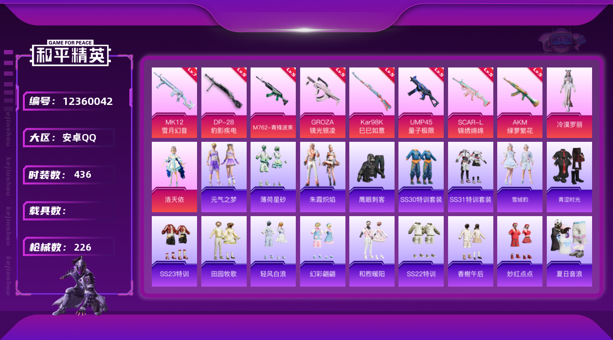 [12360042]实名: 可修改 时装数: 436 枪械数: 226 战备数: 135 热门装扮: 鹰眼刺客,洛天依,冷漠罗丽 稀有枪皮: AKM绿萝繁花,SCAR-L-锦绣绵绵,UMP45量子极限,M762-青锋波束,GROZA-镜光银凌,Kar98K-巳巳如意,MK12-雪月幻音,DP-28-豹影疾电