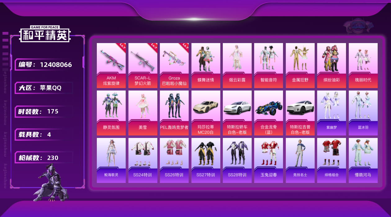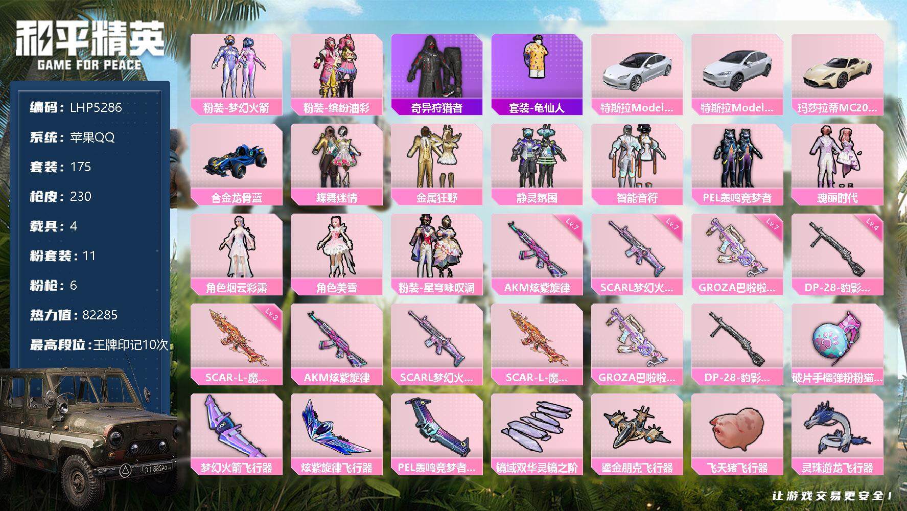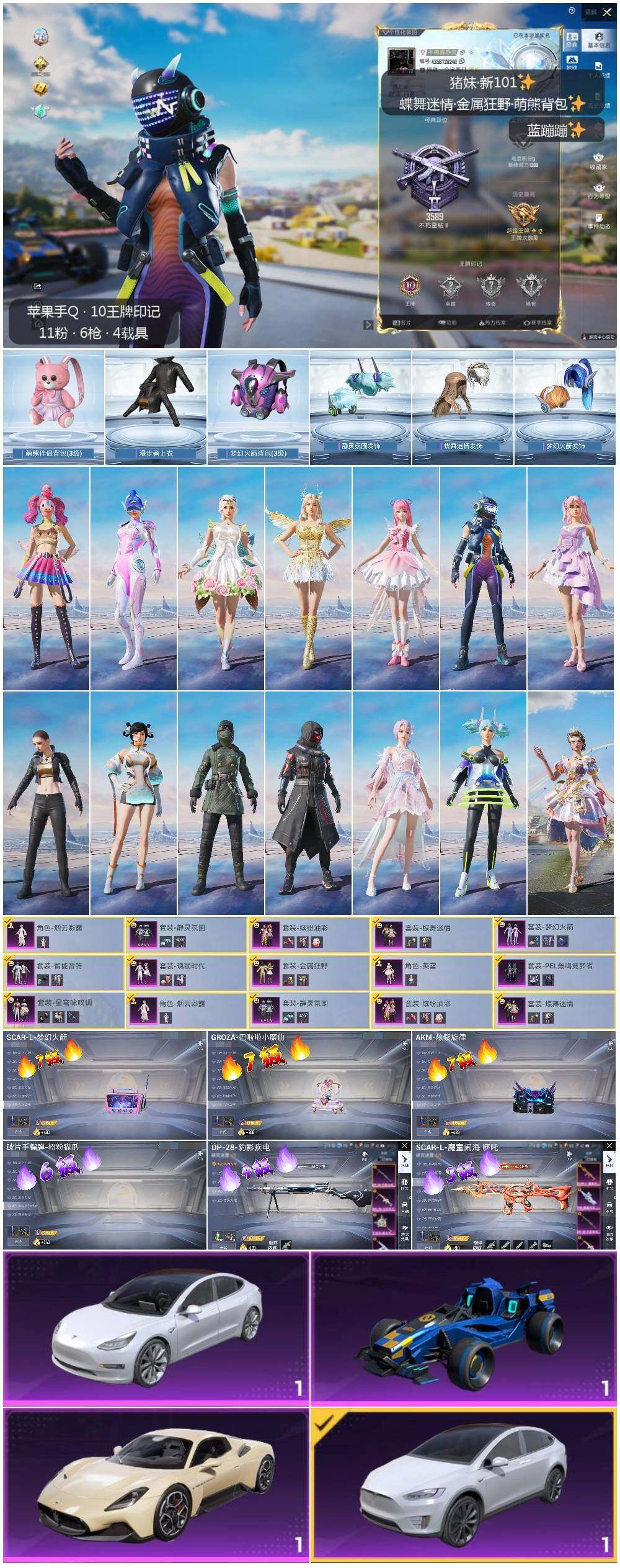 [12408066]素材身法号【特价急出/详情看图】:苹果 手Q-11粉装-6特效枪-4载具-7粉色飞行器-8.2w热力值-10王牌印记-175套装-230枪皮【热门品类】:粉装-梦幻火箭,粉装-缤纷油彩,套装-奇异狩猎者,套装-龟仙人【粉色载具】:特斯拉Model 3(珍珠白),特斯拉Model X(珍珠白),玛莎拉蒂MC20(星石白),合金龙骨(蓝)【粉色套装】:粉装-蝶舞迷情,粉装-梦幻火箭,粉装-金属狂野,粉装-静灵氛围,粉装-智能音符,粉装-缤纷油彩,粉装-PEL轰鸣竞梦者,粉装-瑰丽时代,角色-烟云彩露,角色-美雪,粉装-星穹咏叹调【粉色枪皮等级】:AKM-炫紫旋律(七级),SCAR-L-梦幻火箭(七级),SCAR-L-魔童闹海 哪吒(三级),GROZA-巴啦啦小魔仙(七级),DP-28-豹影疾电(四级)【粉色飞行器】:梦幻火箭飞行器,炫紫旋律飞行器,PEL轰鸣竞梦者飞行器,镜域双华-灵镜之阶,鎏金朋克飞行器,飞天猪飞行器,灵珠游龙飞行器