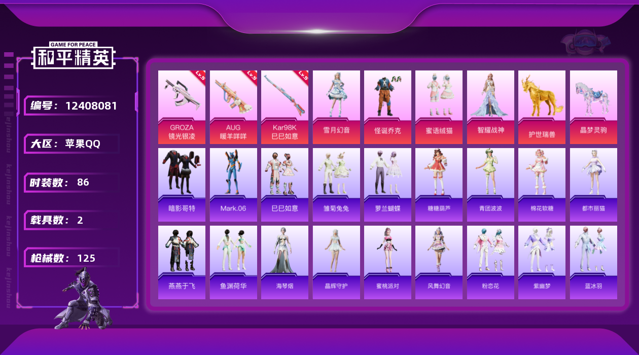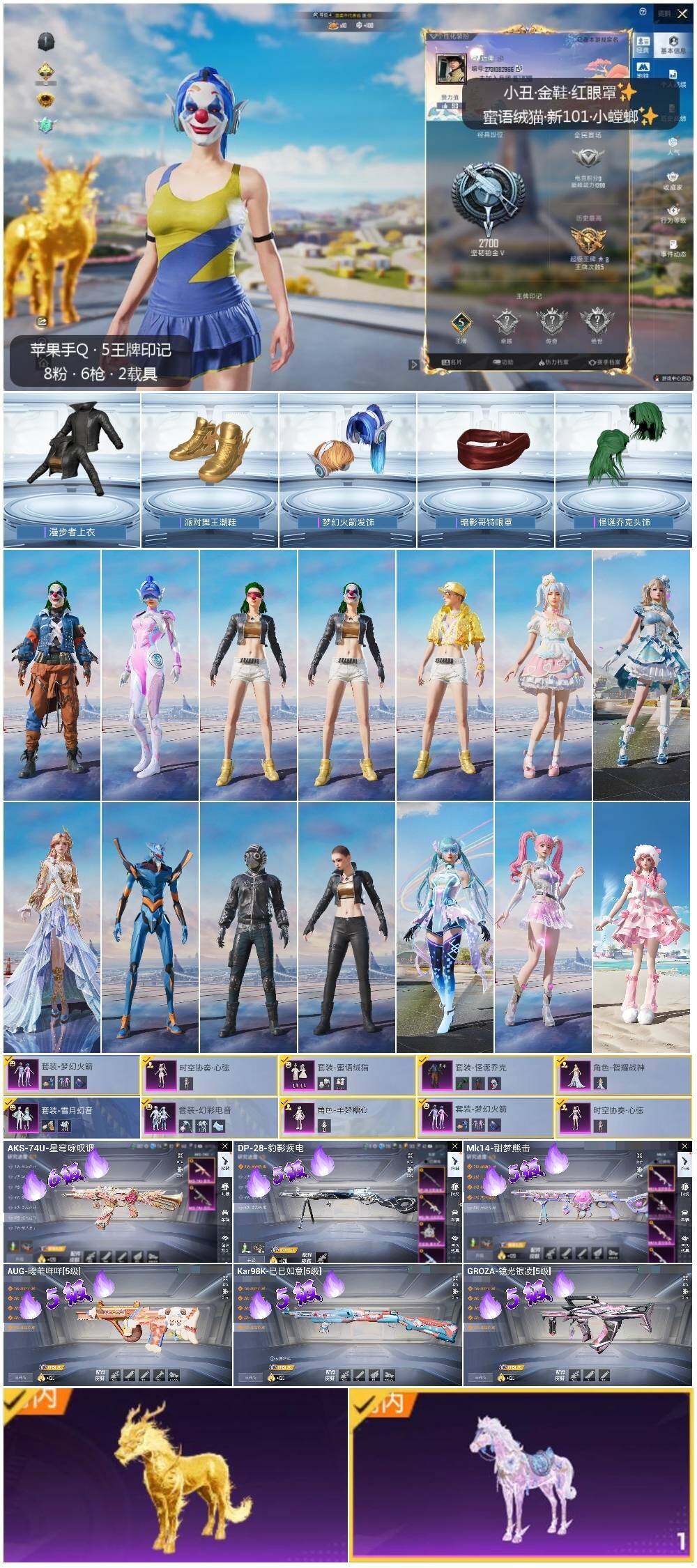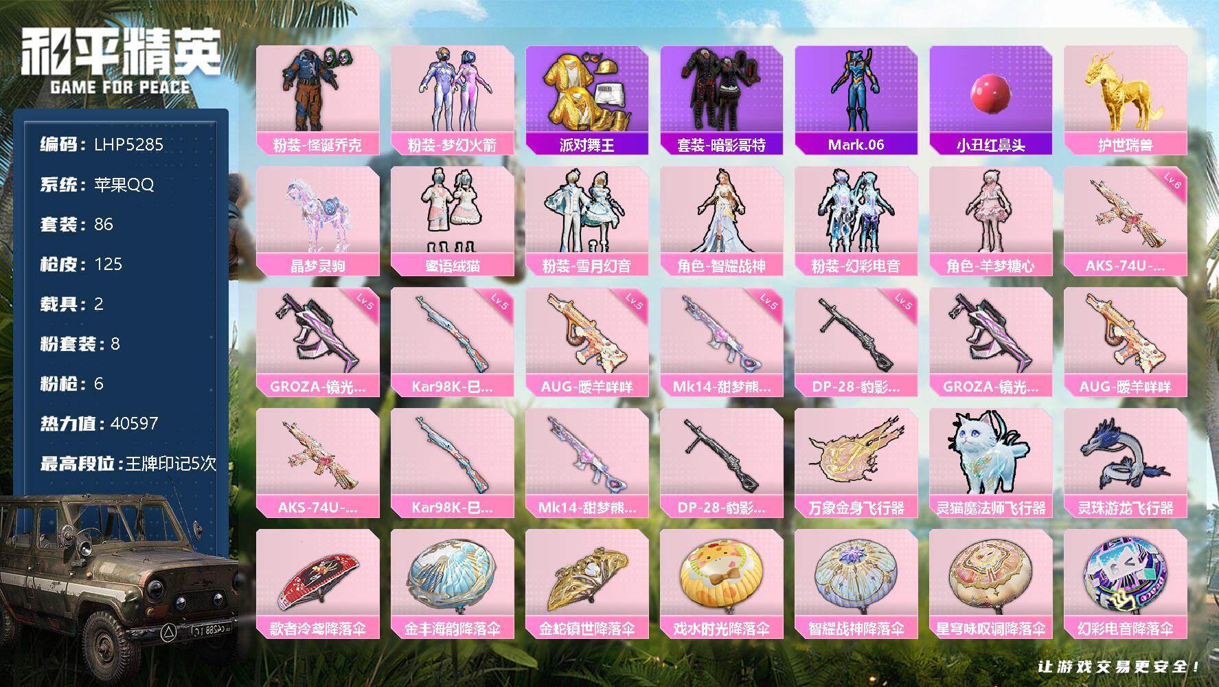 [12408081]素材身法号/地铁满天赋【特价急出/详情看图】:苹果 手Q-8粉装-6特效枪-2载具-3粉色飞行器-4w热力值-5王牌印记-86套装-125枪皮【热门品类】:粉装-怪诞乔克,粉装-梦幻火箭,套装-派对舞王,套装-暗影哥特,角色-Mark.06,小丑红鼻头【粉色载具】:护世瑞兽,晶梦灵驹【粉色套装】:粉装-怪诞乔克,粉装-梦幻火箭,粉装-蜜语绒猫,粉装-雪月幻音,角色-智耀战神,粉装-幻彩电音,角色-羊梦糖心【粉色枪皮等级】:GROZA-镜光银凌(五级),AUG-暖羊咩咩(五级),AKS-74U-星穹咏叹调(六级),Kar98K-巳巳如意(五级),Mk14-甜梦熊击(五级),DP-28-豹影疾电(五级)【粉色飞行器】:万象金身飞行器,灵猫魔法师飞行器,灵珠游龙飞行器