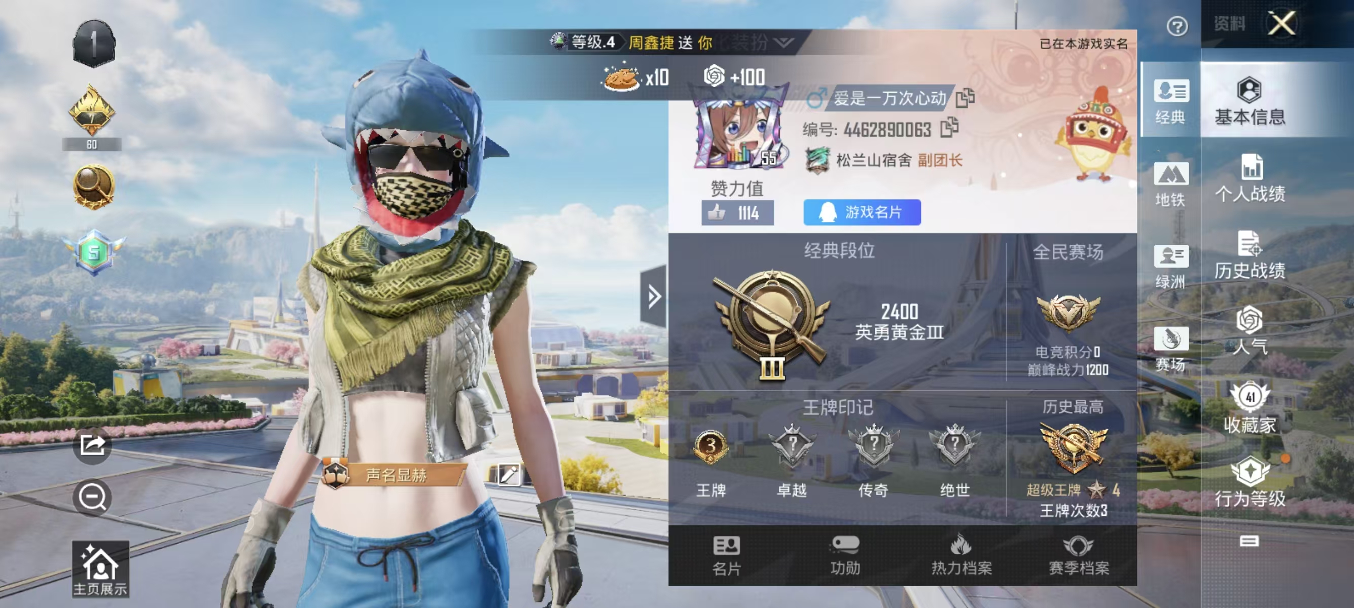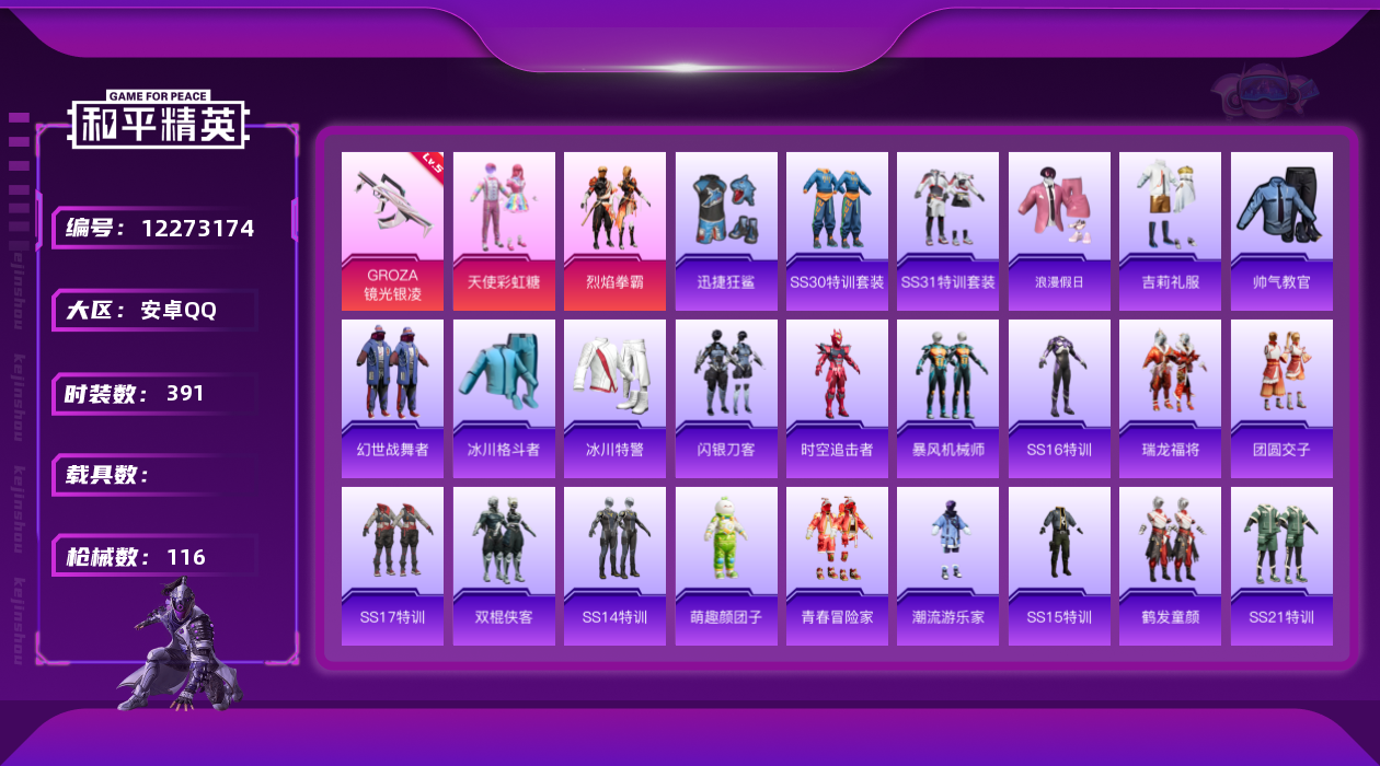 [12273174]实名: 可修改 时装数: 391 枪械数: 116 战备数: 73 热门装扮: 天使彩虹糖,迅捷狂鲨,烈焰拳霸 稀有枪皮: GROZA-镜光银凌