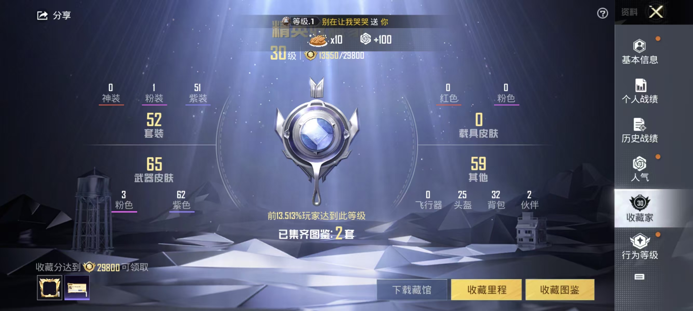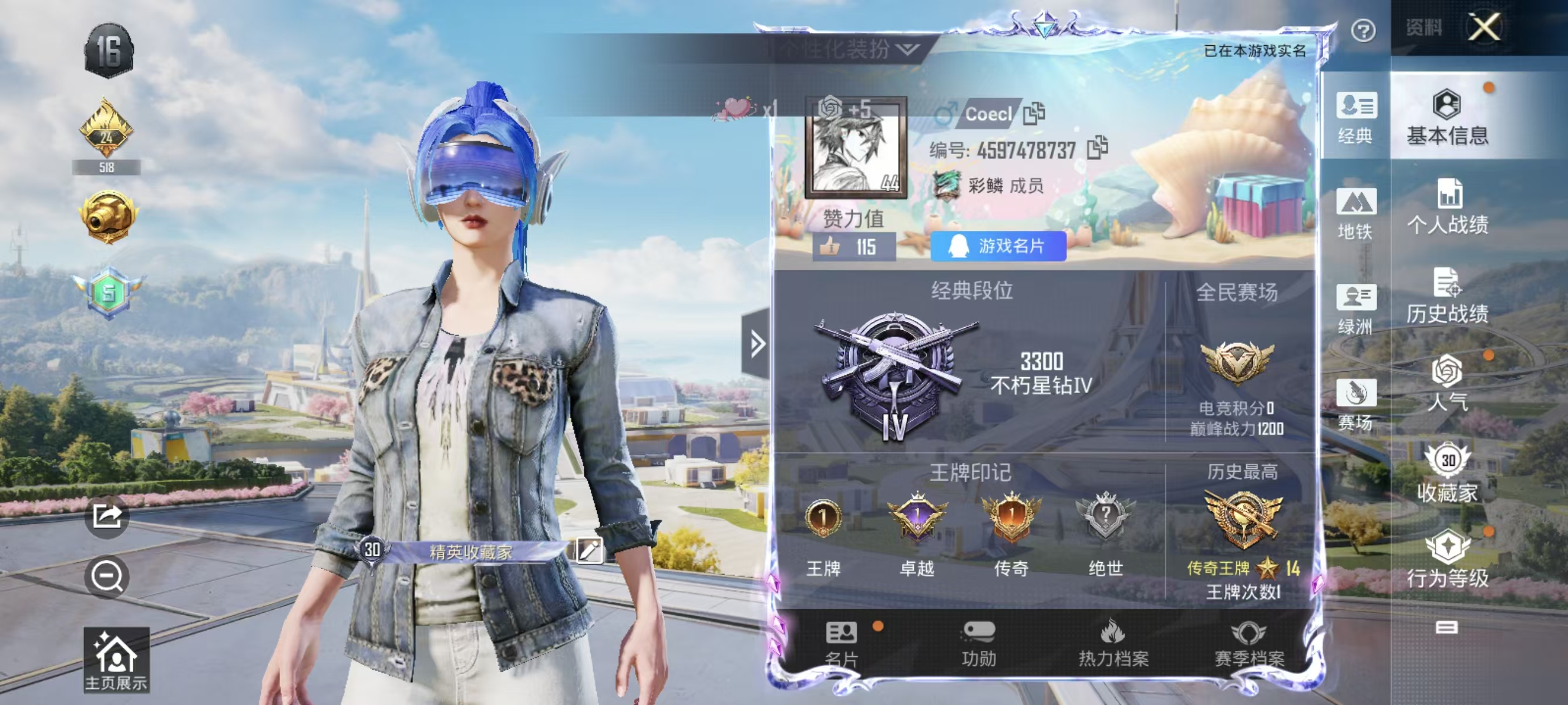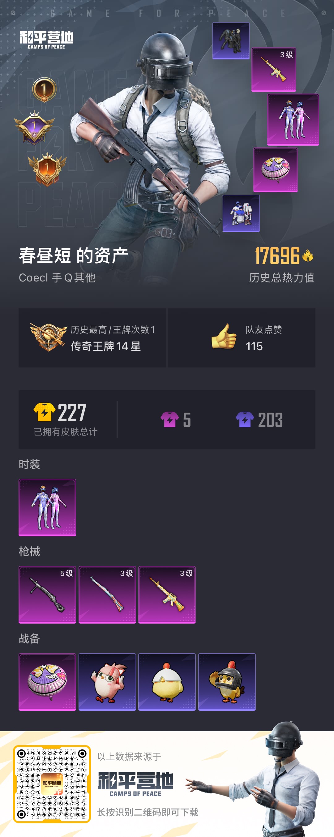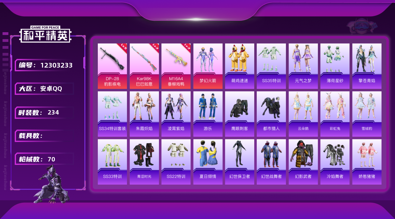 [12303233]实名: 可修改 时装数: 234 枪械数: 70 战备数: 45 热门装扮: 梦幻火箭(新101),鹰眼刺客,都市猎人 稀有枪皮: M16A4垂柳戏鸭,Kar98K-巳巳如意,DP-28-豹影疾电