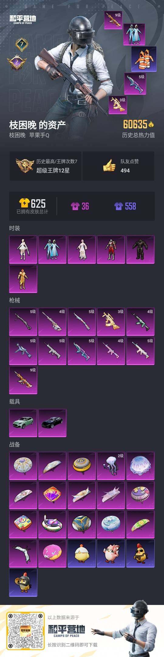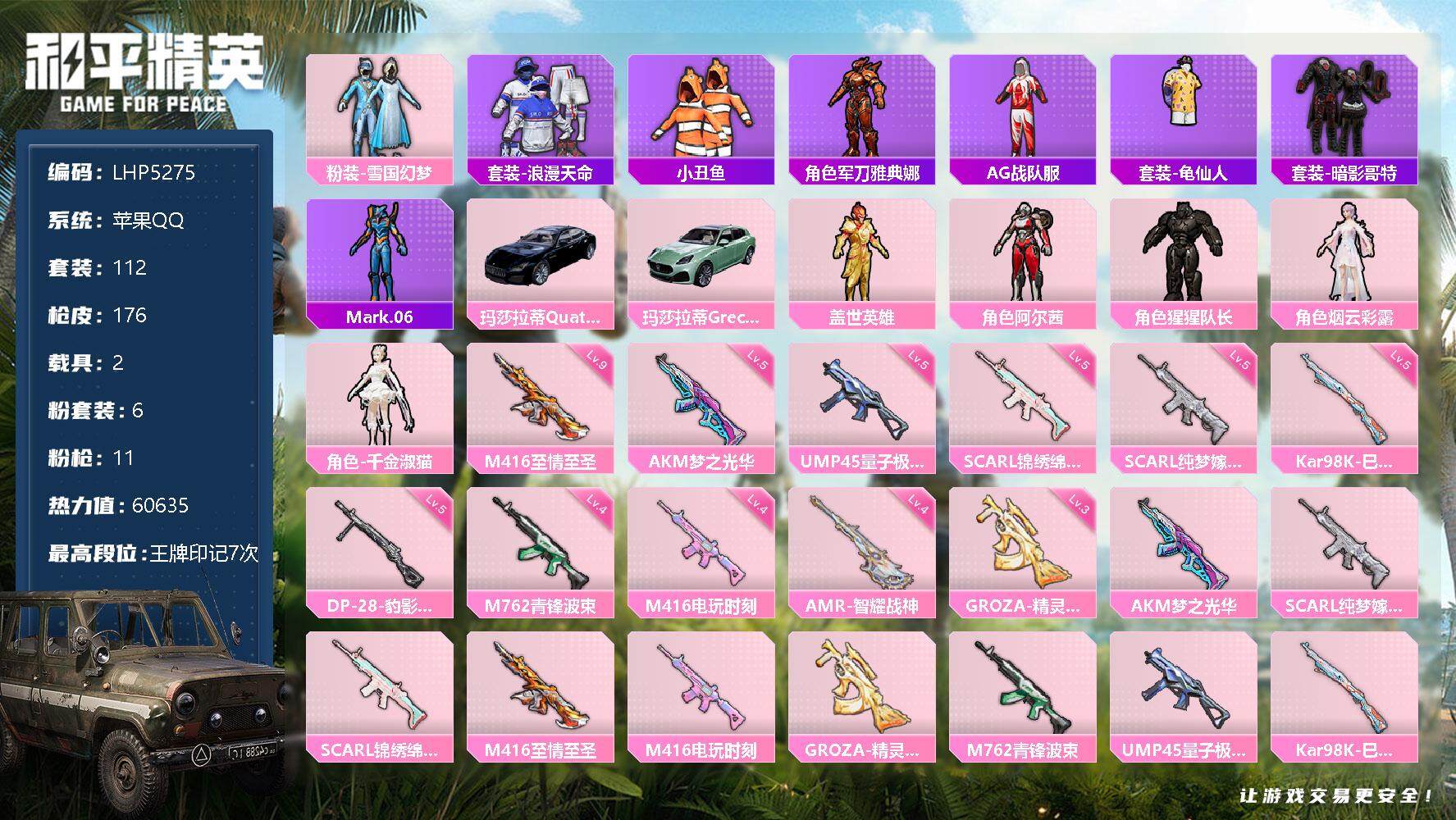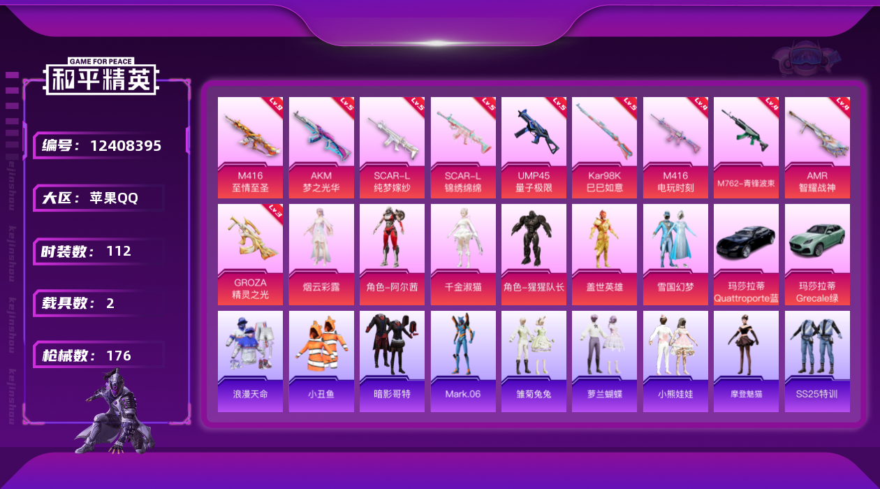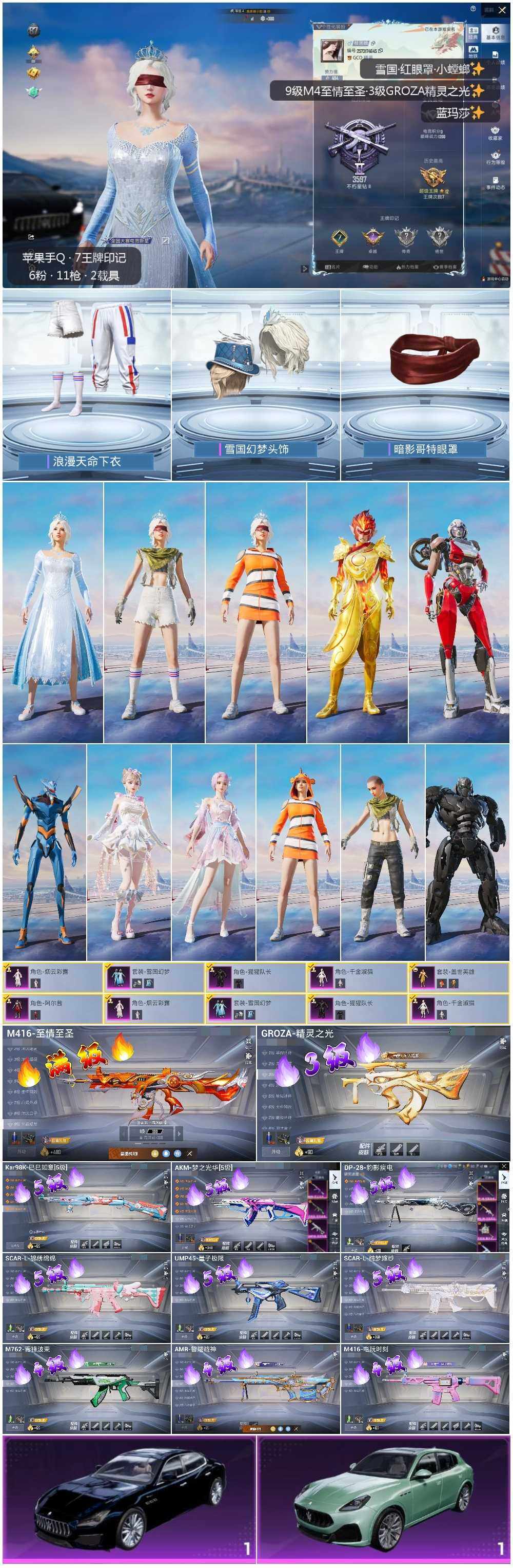 - [11676621]24粉装 8特效枪 3载具 13印记 可二次 可修改实名 身法装备:都市猎人,暗影哥特(红眼罩),沙漠守护者,萌熊伴侣背包(粉熊背包) 优质装备:怪诞乔克(小丑),雪国幻梦(冰雪女王),特斯拉Model 3(珍珠白),合金龙骨(绿),都市猎人,沙漠守护者(黑丝),萌熊伴侣背包(粉熊背包),M762甜蜜誓约,M416五爪金龙,SCAR-L梦幻火箭,奇异狩猎者,梦幻火箭(新101)(新火箭少女101粉色套装),幻影战神,宝贝奶油派,金属狂野,缤纷油彩(猪妹猪脸妹),向日葵(套装-向日葵先生),香水柠檬,天禅智恒,绚金战神,冰霜白皇,银刃赛罗,精灵迷巫,狩月元帅,星之彼岸,UMP45相思残雪(UMP45-相思残雪),AKM梦之光华,AWM焰龙焚天,洛天依,DP-28暗夜鎏金,七级AKM-梦之光华,七级UMP45-相思残雪,七级M762-甜蜜誓约,七级SCAR-L-梦幻火箭,七级M416-五爪金龙,冷漠罗丽,Kar98K-巳巳如意 热门装扮:林间仙鹿,彩虹鹿灵,山涧鹿灵,复仇流浪者,荒漠赏金,冰川红玫,阿尔茜,S1赛事上衣,沙漠守护者,兔兔白日梦,动感兔斯基,软萌银虎,奇迹天团,胖达圆圆,潮萌小黄鸭,仓鼠灰灰,迅捷狂鲨,鹰眼刺客,呆萌铁蟹,梦魇先生,爱崽白熊,深海小丑鱼,浪漫波比,都市猎人 载具:空客H135-蔚蓝之翼,双人摩托-梦幻火箭 五级特效枪:五级Kar98K-巳巳如意 四级特效枪:四级DP-28-暗夜鎏金,四级AWM-焰龙焚天 紫色装扮:岑岑玉浪,琉璃情波,田园牧歌,轻风白浪,和煦暖阳,SS22特训,SS23特训,幻彩翩翩,妙红点点,白兰地假日,苍岚星,娇憨猪猪,夏雨游龙,萌趣咩咩,SS21特训,SS31特训套装,SS2特训,SS3特训,SS4特训,SS5特训,人气偶像,军械专家,冰原使者,,冰川特警,决胜时刻,冷焰舞者,凛冬战士,刚毅裁决者,北国孤狼,千禧之恋,旭日情侣,云朵鹅,雪绒豹,SS33特训套装,顶瓜瓜,灵公主,SS20特训,赛罗奥特曼,青春冒险家,潮流游乐家,SS15特训,暗夜傀儡,蝎王蛇后,迪迦奥特曼,欧布奥特曼,时空追击者,暴风机械师,星辰守护者,SS16特训,爆裂葡萄,冰爽海盐,闪金天王,银白舞王,SS13特训,暗黑裁决,诡谋托雷基亚,浪漫樱花,星梦畅游,治愈之星,迅捷之星,科技之星,SS14特训,萌趣颜团子,特种颜团子,暖风夏荷,猎梦纪元,
