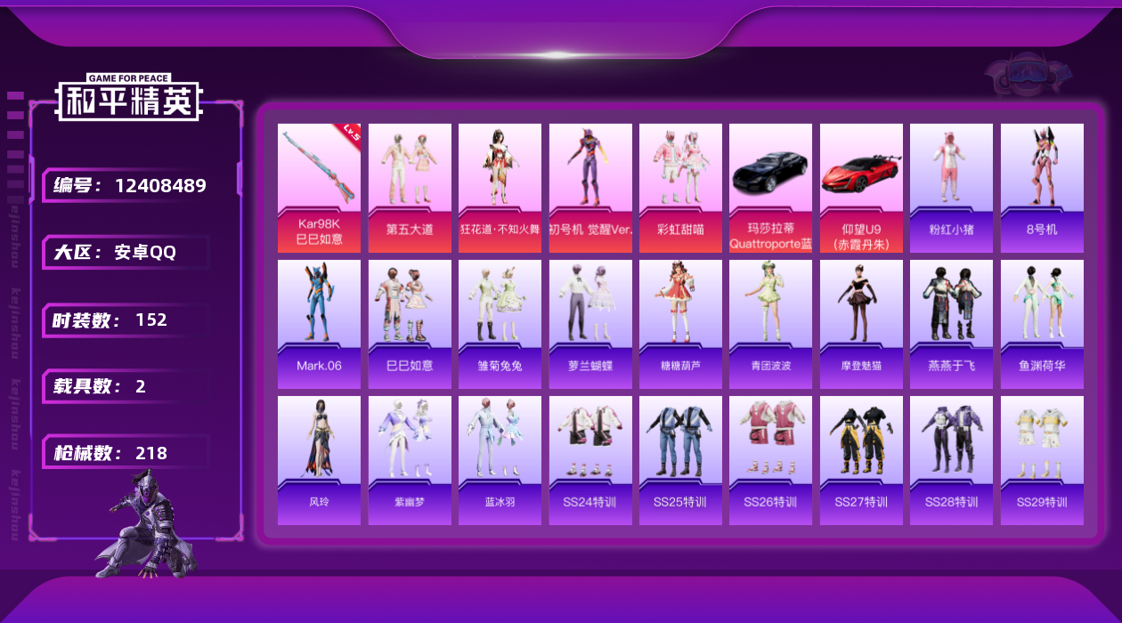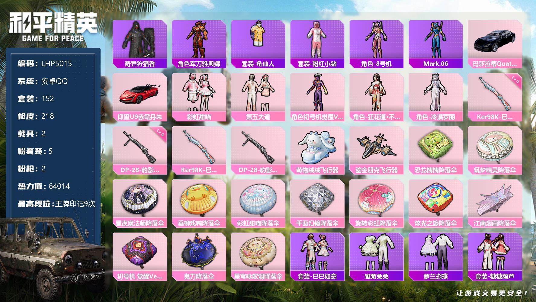 [12408489]素材身法号【特价急出/详情看图】:安卓 手Q-5粉装-2特效枪-2载具-2粉色飞行器-6.4w热力值-9王牌印记-152套装-218枪皮【热门品类】:套装-奇异狩猎者,角色-军刀雅典娜,套装-龟仙人,套装-粉红小猪,角色-8号机,角色-Mark.06【粉色载具】:玛莎拉蒂Quattroporte(夜幕蓝),仰望U9(赤霞丹朱)【粉色套装】:粉装-彩虹甜喵,粉装-第五大道,角色-初号机 觉醒Ver.,角色-狂花道·不知火舞,角色-冷漠罗丽【粉色枪皮等级】:Kar98K-巳巳如意(五级),DP-28-豹影疾电(五级)【粉色飞行器】:萌物绒绒飞行器,鎏金朋克飞行器
