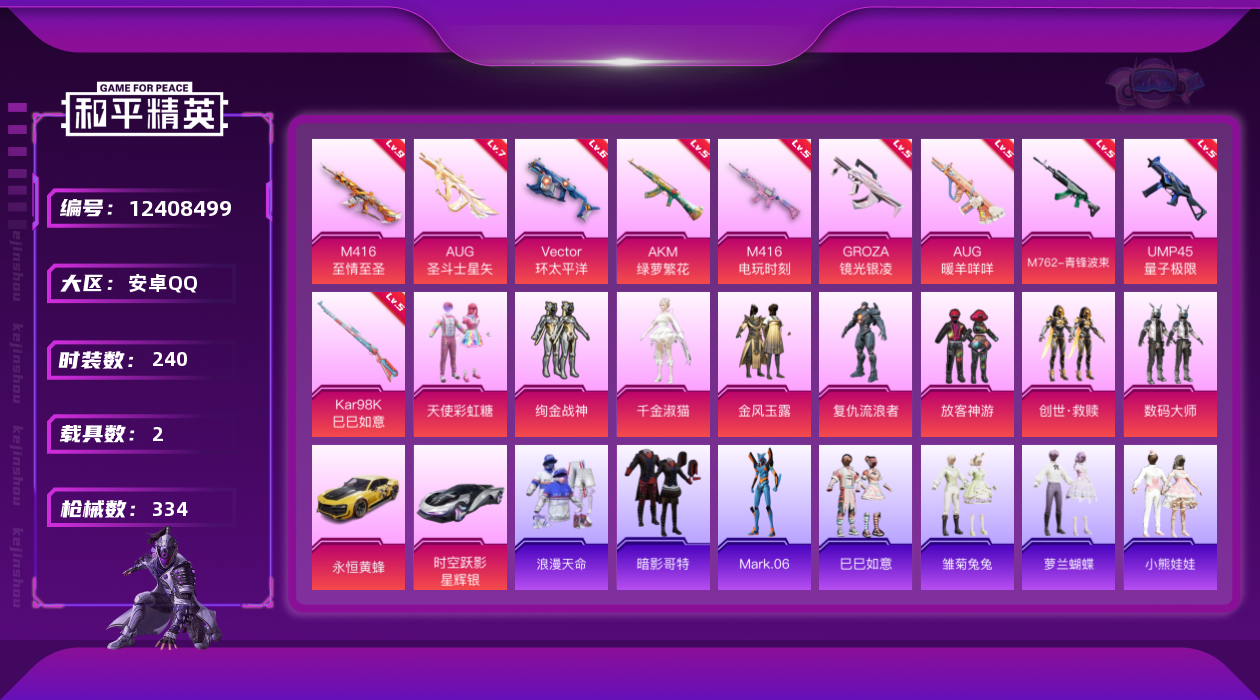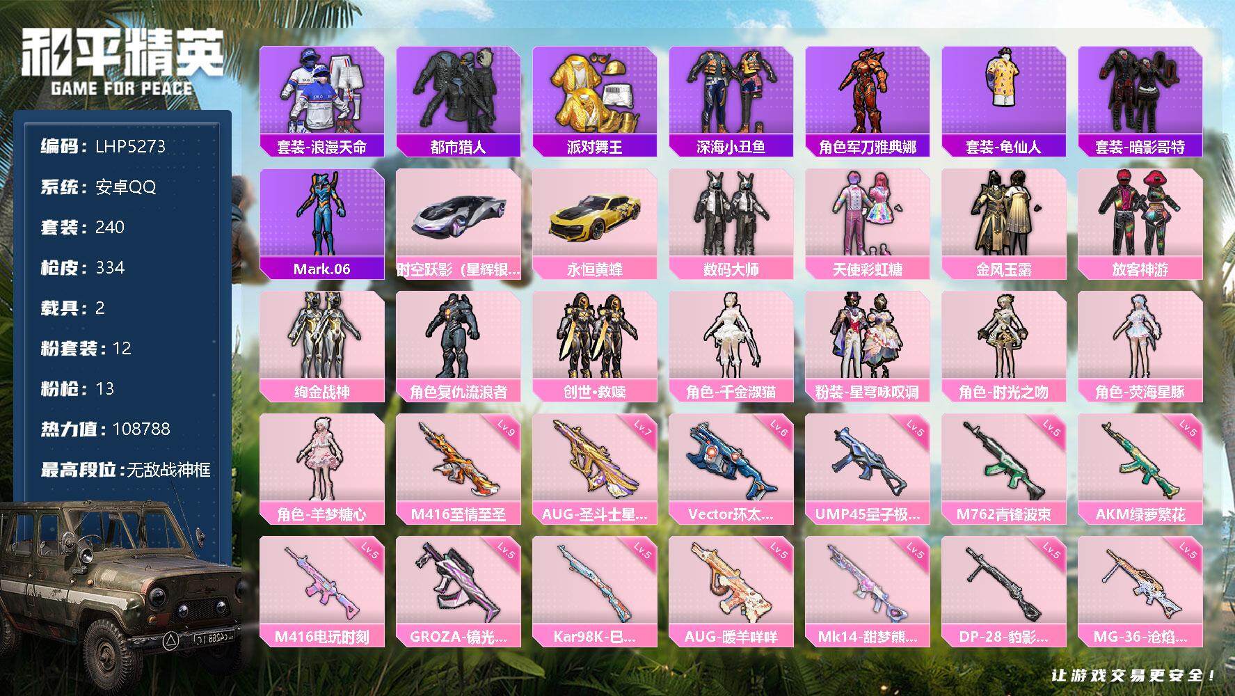 [12408499]素材身法号/无敌战神框1/绝世印记5/地铁满天赋/M416-至情至圣(九级)【特价急出/详情看图】:安卓 手Q-无敌战神框-12粉装-13特效枪-2载具-7粉色飞行器-10.8w热力值-18王牌印记-240套装-334枪皮【热门品类】:套装-浪漫天命,套装-都市猎人,套装-派对舞王,套装-深海小丑鱼,角色-军刀雅典娜,套装-龟仙人,套装-暗影哥特,角色-Mark.06【粉色载具】:时空跃影(星辉银),永恒黄蜂【粉色套装】:粉装-数码大师,粉装-天使彩虹糖,粉装-金风玉露,粉装-放客神游,粉装-绚金战神,角色-复仇流浪者,套装-创世·救赎,角色-千金淑猫,粉装-星穹咏叹调,角色-时光之吻,角色-荧海星豚,角色-羊梦糖心【粉色枪皮等级】:AKM-绿萝繁花(五级),M416-至情至圣(九级),M416-电玩时刻(五级),GROZA-镜光银凌(五级),AUG-暖羊咩咩(五级),AUG-圣斗士星矢(七级),M762-青锋波束(五级),UMP45-量子极限(五级),Vector-环太平洋(六级),Kar98K-巳巳如意(五级),Mk14-甜梦熊击(五级),DP-28-豹影疾电(五级),MG-36-沧焰双生(五级)【粉色飞行器】:梦幻火箭飞行器,星夜魔法师飞行翼,祥瑞锦鲤飞行器,星空武士飞行器,幻星舰长飞行器,灵珠游龙飞行器