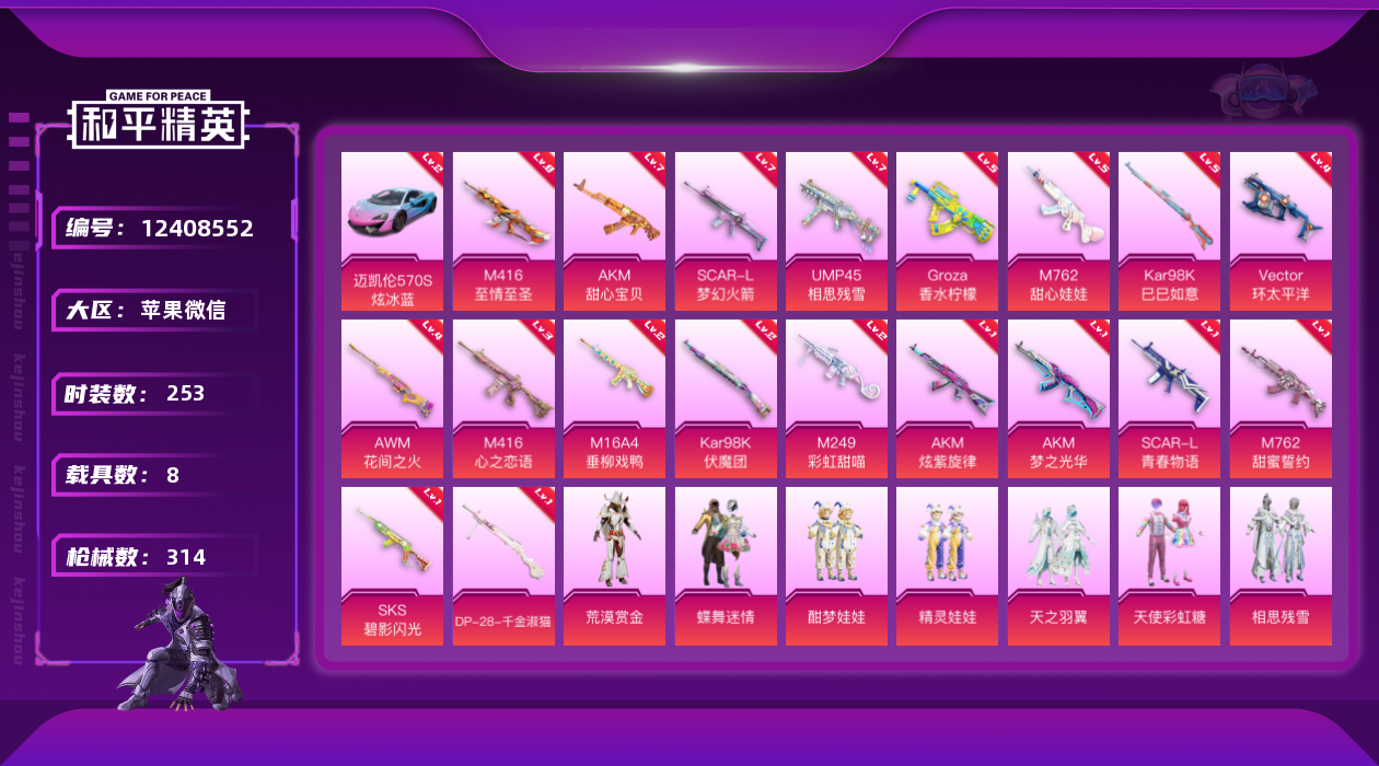 [12408552]老木乃伊/地铁满天赋【特价急出/详情看图】:苹果 微信-39粉装-20特效枪-8载具-6粉色飞行器-133479热力值-13王牌印记-253套装-314枪皮【红色载具】:迈凯伦570S(炫冰蓝)(二级)【热门品类】:粉装-雪国幻梦,粉装-梦幻火箭,粉装-童趣迷兔,粉装-音爆索尼克,粉装-缤纷油彩,套装-浪漫天命,套装-都市猎人,套装-冥河战士,套装-深海小丑鱼,套装-奇异狩猎者,角色-军刀雅典娜,套装-胖达团团,套装-金羽特工,套装-AG追光队服,套装-AG战队服,套装-龟仙人,套装-暗影哥特,套装-粉红小猪,小恶魔头饰【粉色载具】:兰博基尼Aventador SVJ(翡翠绿),兰博基尼URUS(明艳黄),玛莎拉蒂Quattroporte(夜幕蓝),玛莎拉蒂Ghibli(粉),迈凯伦570S(炫冰蓝),合金龙骨(绿),极速兔兔车,拉轰鸭鸭车,僚机-萌兔起飞【粉色套装】:粉装-极限特训,粉装-甜心巧克力,粉装-宝贝奶油派,粉装-天使彩虹糖,粉装-雪国幻梦,粉装-蝶舞迷情,粉装-梦幻火箭,粉装-星之信仰,粉装-缤纷油彩,粉装-放客神游,粉装-新星烈龙,粉装-潮汐统领,粉装-翡翠骑士,粉装-冰霜白皇,粉装-童趣迷兔,粉装-炙焰红王,粉装-香水柠檬,粉装-相思残雪,粉装-吟月归客,粉装-海渊国主,角色-2号机款机体服,粉装-甜心娃娃,粉装-精灵娃娃,粉装-酣梦娃娃,粉装-天之羽翼,粉装-焦糖拿铁,粉装-碧影闪光,粉装-荒漠赏金,角色-复仇流浪者,粉装-绒雪飘舞,粉装-傲雪凌霜,粉装-霁雪冰心,粉装-垂柳戏鸭,粉装-太空嘟嘟,粉装-彩虹甜喵,粉装-盖世英雄,粉装-音爆索尼克,粉装-心之回忆,粉装-炫光之旅【粉色枪皮等级】:AKM-甜心宝贝(七级),AKM-炫紫旋律(一级),AKM-梦之光华(一级),M16A4-垂柳戏鸭(二级),SCAR-L-梦幻火箭(七级),SCAR-L-青春物语(一级),M416-心之恋语(三级),M416-至情至圣(八级),GROZA-香水柠檬(五级),M762-甜蜜誓约(一级),M762-甜心娃娃(五级),UMP45-相思残雪(七级),Vector-环太平洋(四级),Kar98K-伏魔团(二级),Kar98K-巳巳如意(五级),AWM-花间之火(四级),SKS-碧影闪光(一级),M249-彩虹甜喵(二级),DP-28-千金淑猫(一级),DP-28-豹
