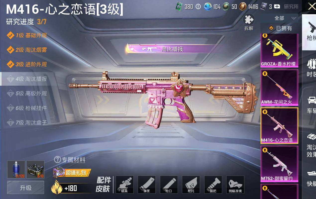 AKM-甜心宝贝,AKM-炫紫旋律,AKM-梦之光华,M16A4-垂柳戏鸭,SCAR-L-梦幻火箭,SCAR-L-青春物语,M416-心之恋语,M416-至情至圣,GROZA-香水柠檬,M762-甜蜜誓约,M762-甜心娃娃,UMP45-相思残雪,Vector-环太平洋,Kar98K-伏魔团,Kar98K-巳巳如意,AWM-花间之火,SKS-碧影闪光,M249-彩虹甜喵,DP-28-千金淑猫