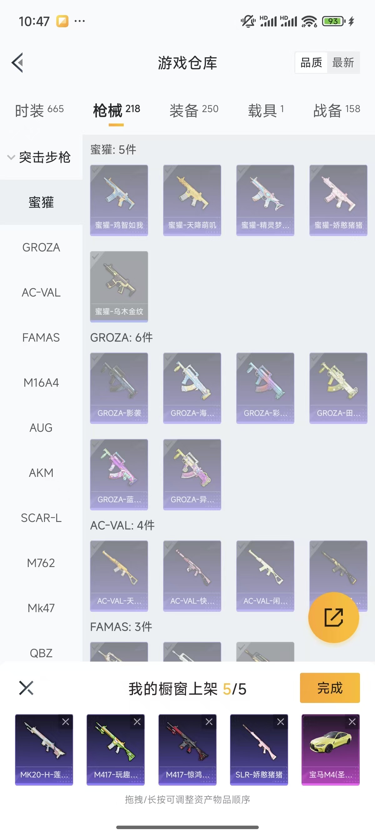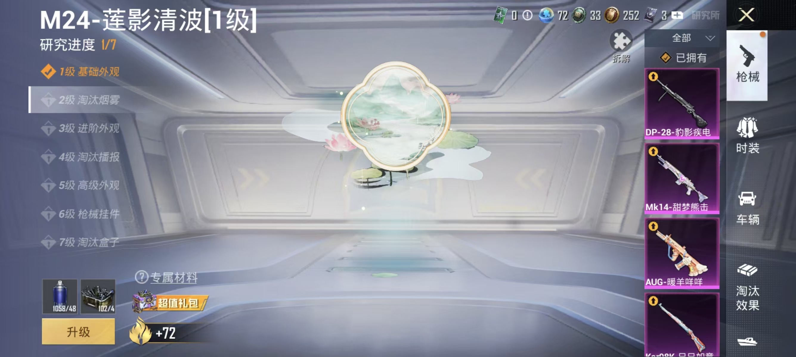 AUG-暖羊咩咩,Kar98K-巳巳如意,M416-电玩时刻,M24-莲影清波,AKM-绿萝繁花
