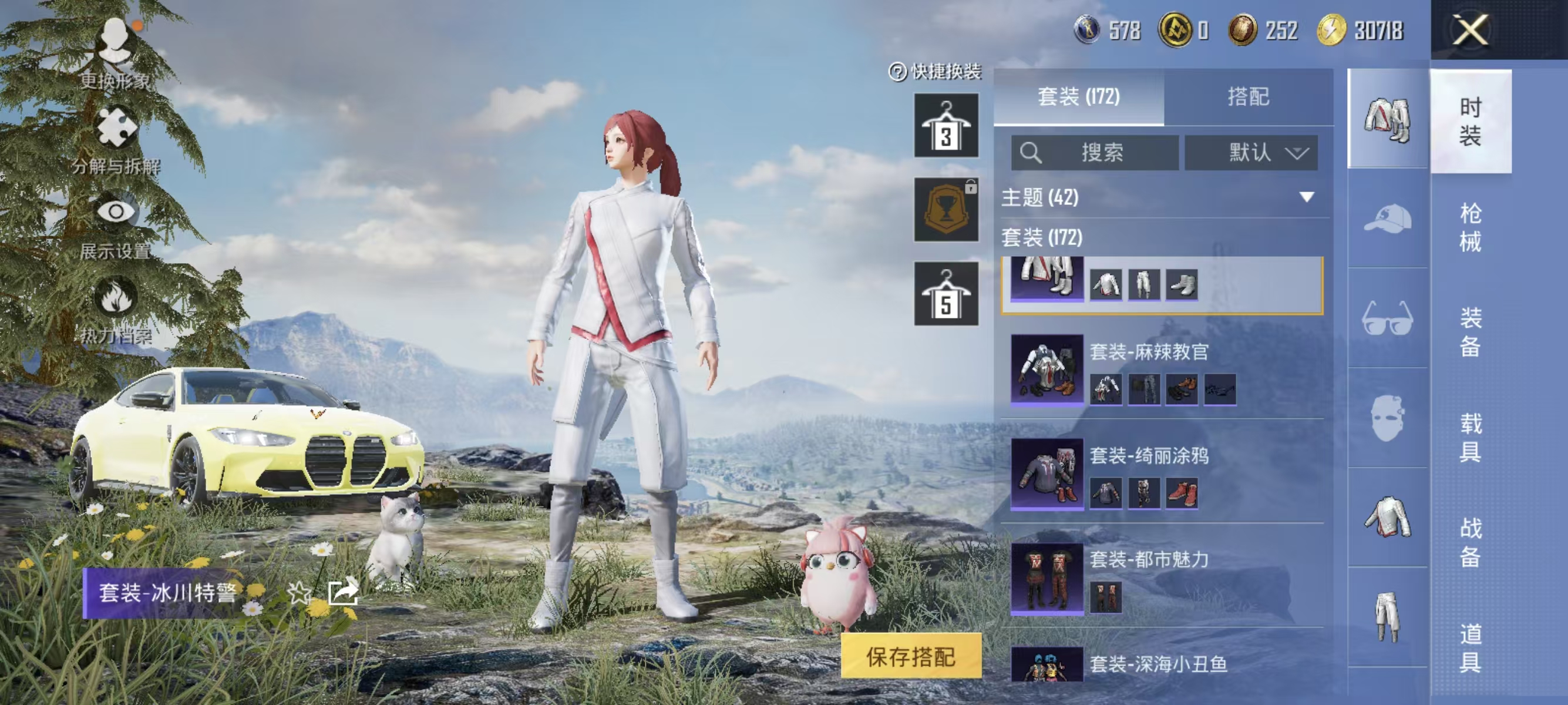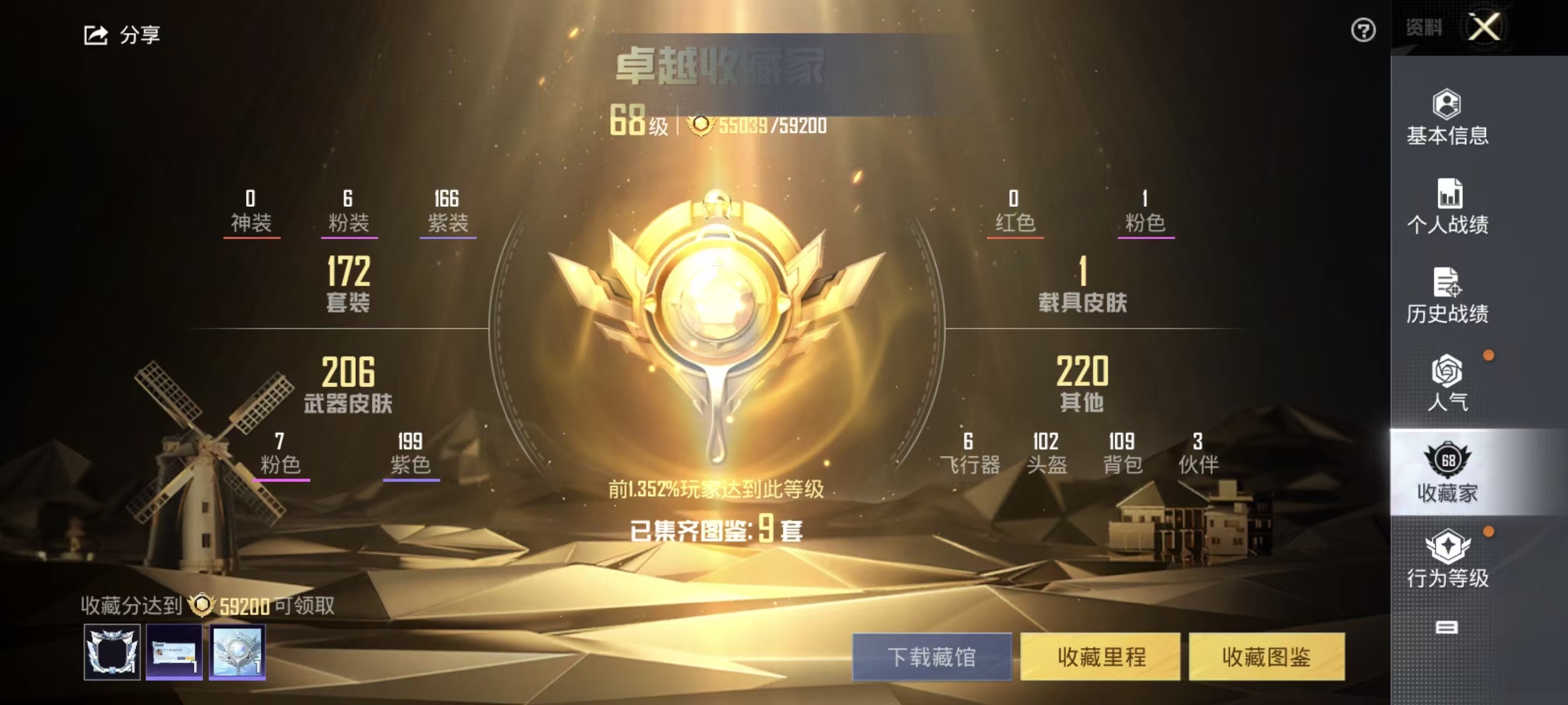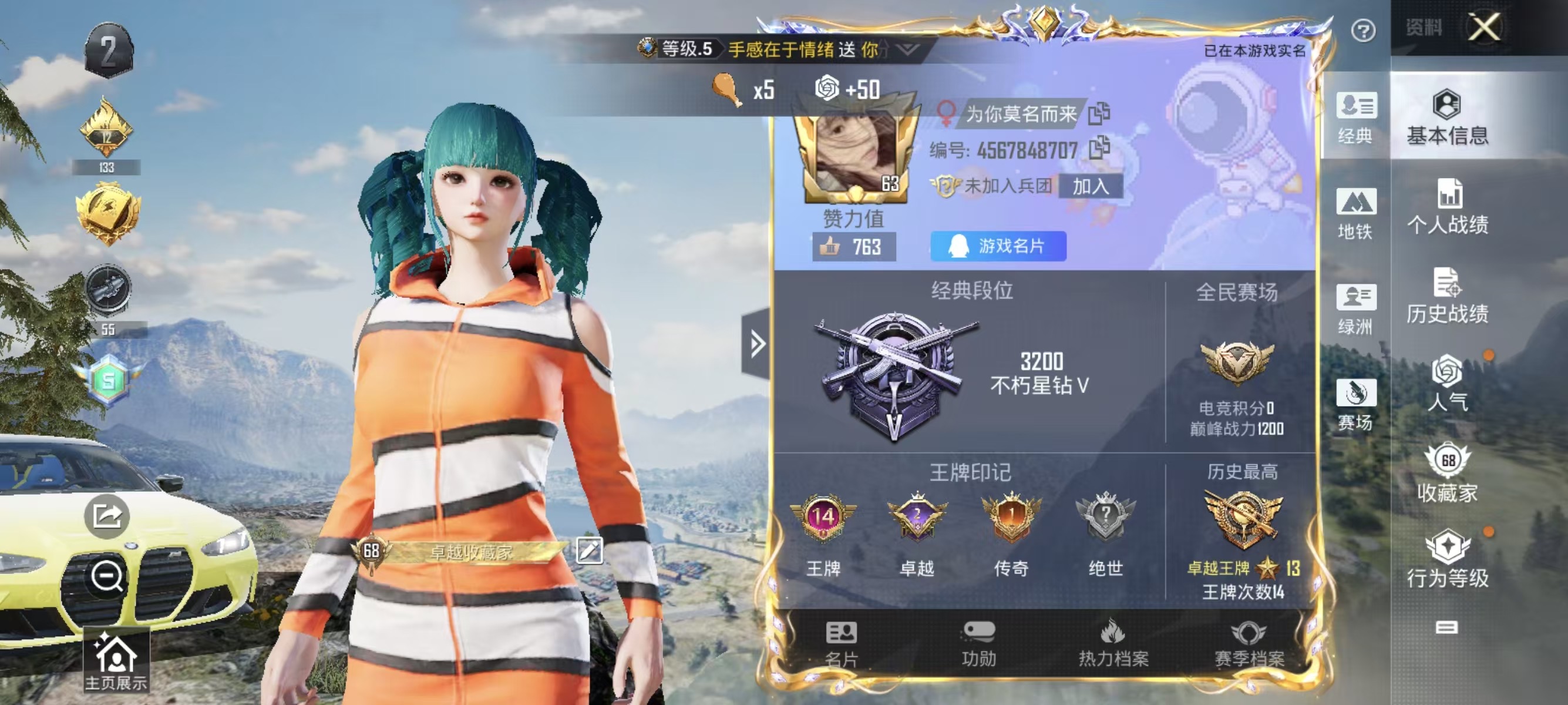 [12361448]实名: 可修改 时装数: 665 载具数: 1 枪械数: 218 战备数: 158 热门装扮: 奇异狩猎者,深海小丑鱼,鹰眼刺客,神秘黑猫,银红美神,未来歌姬,蜜语绒猫,雪月幻音,凤凰座 一辉,幻彩电音 载具: 宝马M4(圣保罗黄) 稀有枪皮: M24莲影清波,AKM绿萝繁花,M416电玩时刻,Kar98K-巳巳如意,AUG-暖羊咩咩,MK14-甜梦熊击,DP-28-豹影疾电