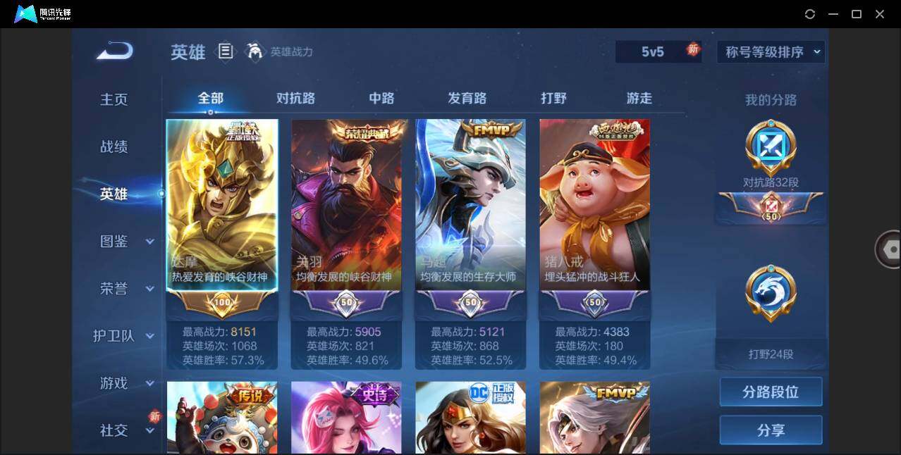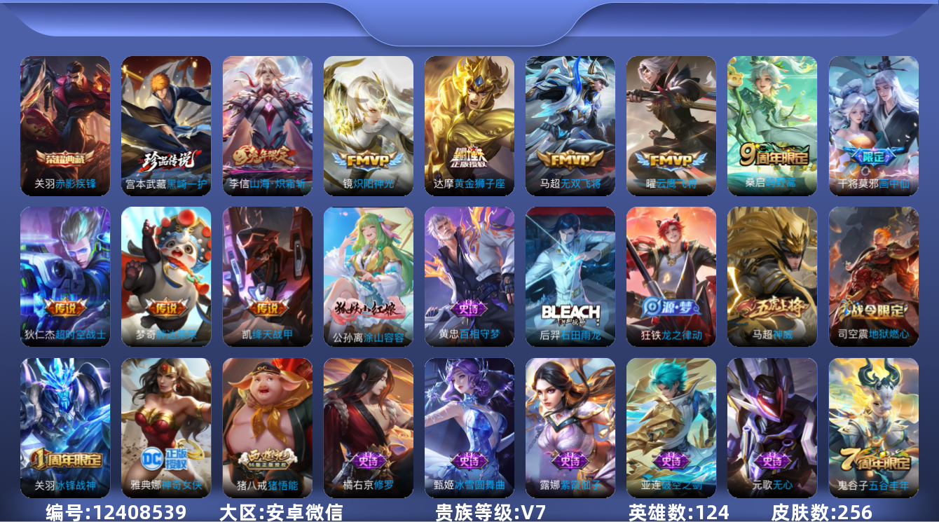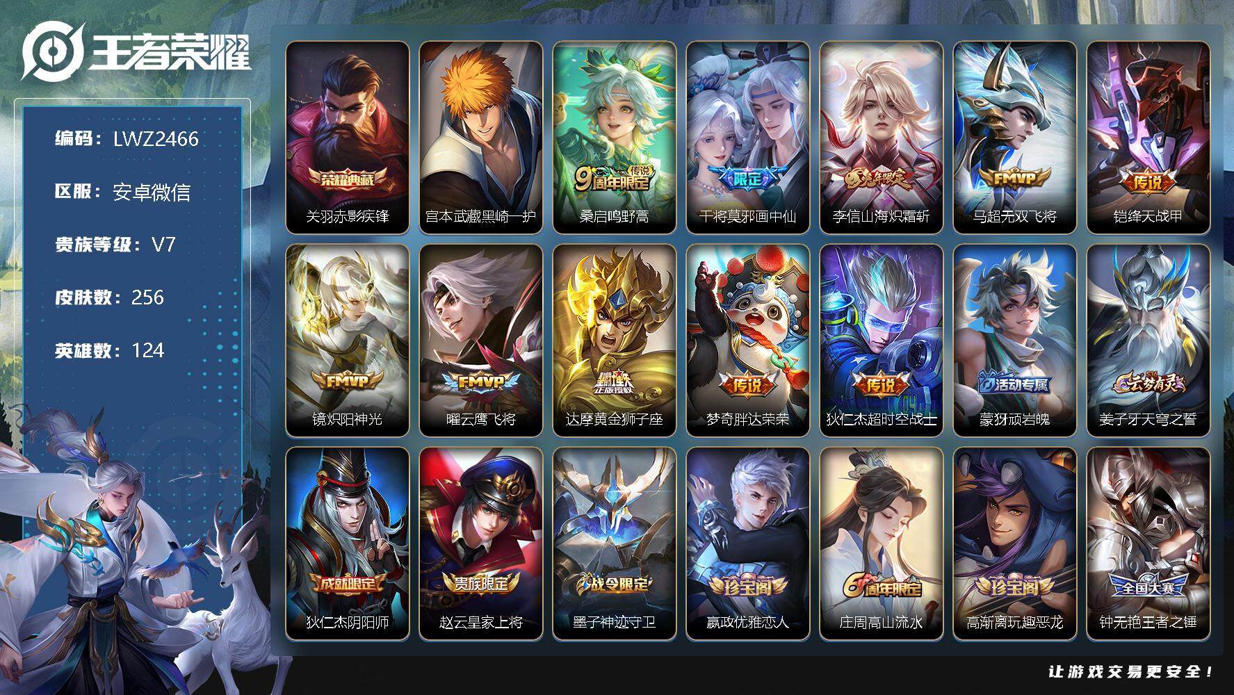[12408539]对抗路32段【特价急出/详情看图】:安卓WX-V7-至尊星耀V段位-124英雄-256皮肤-1典藏-1珍品传说-10传说-66史诗