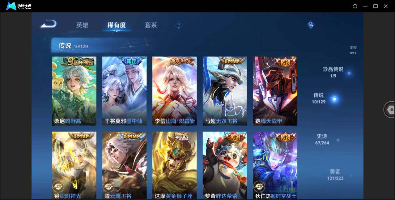 【传说皮肤】:桑启鸣野蒿,干将莫邪画中仙,李信山海炽霜斩,马超无双飞将,铠绛天战甲,镜炽阳神光,曜云鹰飞将,达摩黄金狮子座,梦奇胖达荣荣,狄仁杰超时空战士
