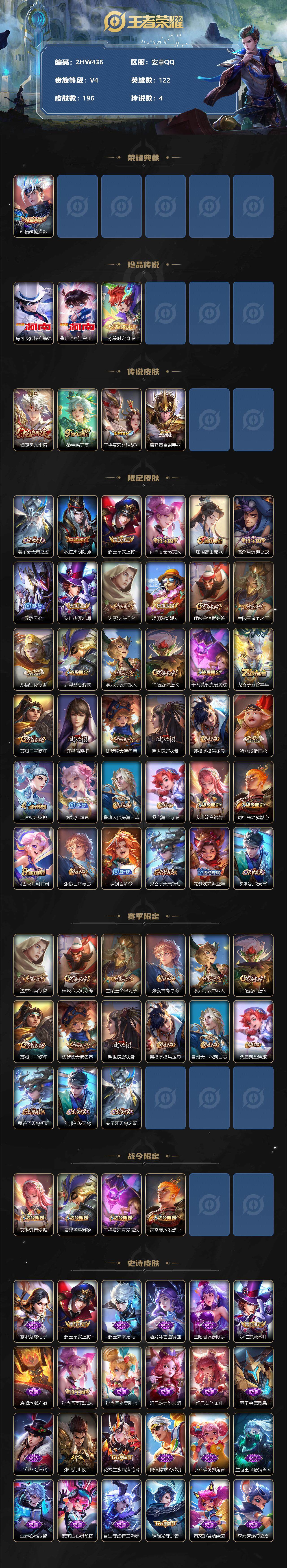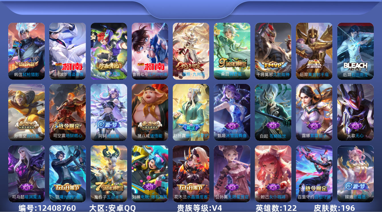 [12408760]【特价急出/详情看图】:安卓Q-V4-至尊星耀IV段位-122英雄-196皮肤-1典藏-3珍品传说-4传说-51史诗