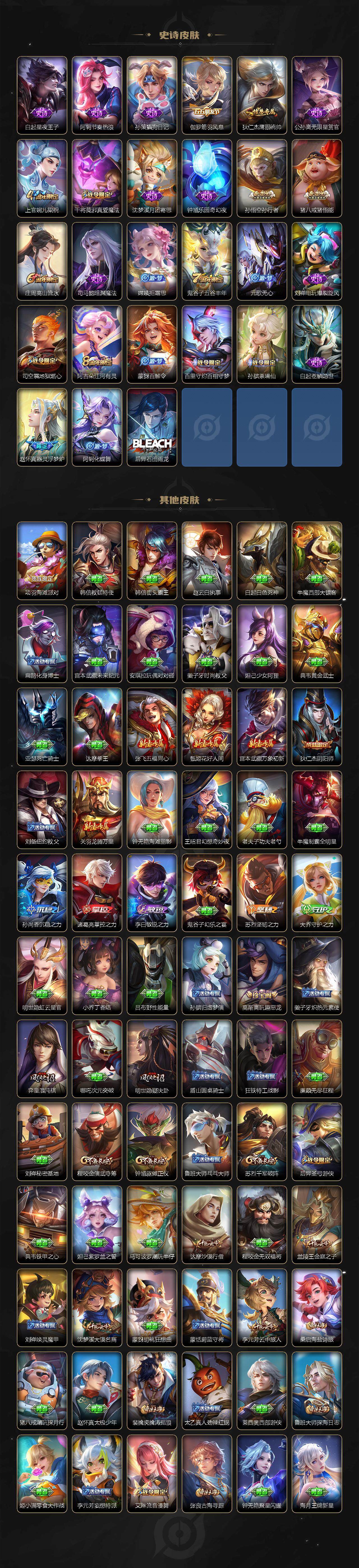 【史诗皮肤】:露娜紫霞仙子,赵云皇家上将,赵云未来纪元,甄姬冰雪圆舞曲,王昭君偶像歌手,狄仁杰魔术师,廉颇地狱岩魂,孙尚香蔷薇恋人,孙尚香水果甜心,妲己魅力维加斯,妲己女仆咖啡,墨子金属风暴,吕布圣诞狂欢,张飞乱世虎臣,花木兰水晶猎龙者,夏侯惇乘风破浪,小乔缤纷独角兽,兰陵王暗隐猎兽者,亚瑟心灵战警,安琪拉心灵骇客,百里守约特工魅影,铠曙光守护者,蔡文姬舞动绿茵,李元芳逐浪之夏,白起星夜王子,阿轲节奏热浪,孙策猫狗日记,伽罗箭羽风息,狄仁杰鹰眼统帅,公孙离无限星赏官,上官婉儿梁祝,干将莫邪真爱魔法,沈梦溪月团寄思,钟馗乐园奇幻夜,孙悟空孙行者,猪八戒猪悟能,庄周高山流水,司马懿暗渊魔法,嫦娥拒霜思,鬼谷子五谷丰年,元歌无心,刘禅电玩爆裂旋风,司空震地狱燃心,阿古朵江河有灵,蒙犽百解令,百里守约百相守梦,孙膑茶境仙,白起苍鳞隐世,赵怀真器灵浮梦炉,阿轲化蝶舞,后羿石田雨龙