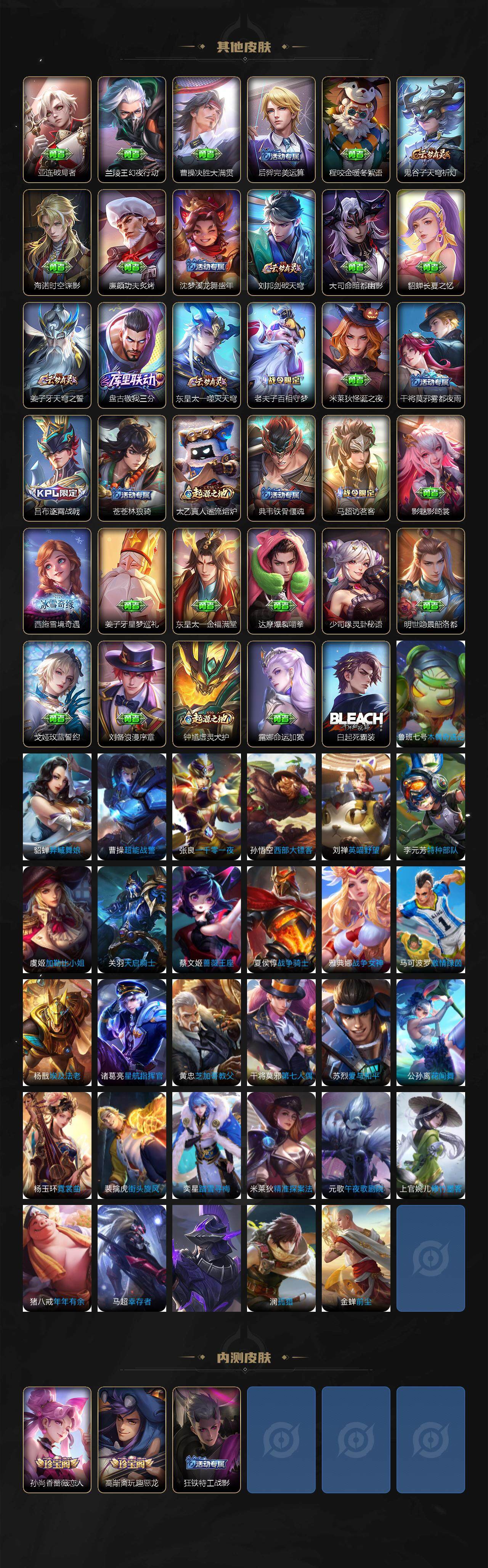【限定皮肤】:姜子牙天穹之誓,狄仁杰阴阳师,赵云皇家上将,孙尚香蔷薇恋人,庄周高山流水,高渐离玩趣恶龙,元歌无心,狄仁杰魔术师,达摩沙漠行僧,项羽海滩派对,程咬金演武夺筹,兰陵王金庭之子,孙悟空孙行者,后羿圣弓游侠,李元芳云中旅人,钟馗驱傩正仪,干将莫邪真爱魔法,鬼谷子五谷丰年,苏烈千军破阵,弈星混沌棋,沈梦溪大漠名商,明世隐疑决卦,裴擒虎擒涛扼浪,猪八戒猪悟能,上官婉儿梁祝,嫦娥拒霜思,鲁班大师探海日志,桑启海盐诗旅,艾琳流音漫舞,司空震地狱燃心,阿古朵江河有灵,张良古海寻踪,蒙犽百解令,鬼谷子天穹祈灯,沈梦溪龙舞盛年,刘邦剑破天穹