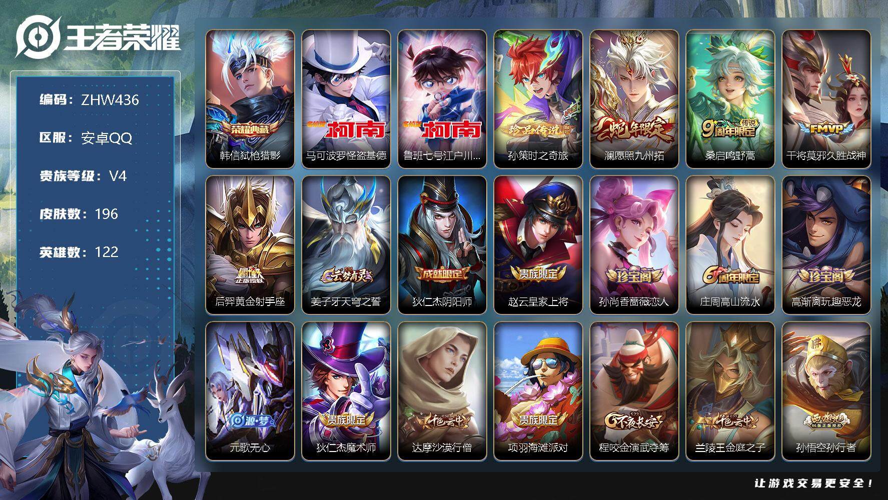 [12408760]【特价急出/详情看图】:安卓Q-V4-至尊星耀IV段位-122英雄-196皮肤-1典藏-3珍品传说-4传说-51史诗 【英雄全皮】:影全皮 【荣耀典藏】:韩信弑枪猎影 【珍品传说】:马可波罗怪盗基德,鲁班七号江户川柯南,孙策时之奇旅 【传说皮肤】:澜愿照九州拓,桑启鸣野蒿,干将莫邪久胜战神,后羿黄金射手座 【限定皮肤】:姜子牙天穹之誓,狄仁杰阴阳师,赵云皇家上将,孙尚香蔷薇恋人,庄周高山流水,高渐离玩趣恶龙,元歌无心,狄仁杰魔术师,达摩沙漠行僧,项羽海滩派对,程咬金演武夺筹,兰陵王金庭之子,孙悟空孙行者,后羿圣弓游侠,李元芳云中旅人,钟馗驱傩正仪,干将莫邪真爱魔法,鬼谷子五谷丰年,苏烈千军破阵,弈星混沌棋,沈梦溪大漠名商,明世隐疑决卦,裴擒虎擒涛扼浪,猪八戒猪悟能,上官婉儿梁祝,嫦娥拒霜思,鲁班大师探海日志,桑启海盐诗旅,艾琳流音漫舞,司空震地狱燃心,阿古朵江河有灵,张良古海寻踪,蒙犽百解令,鬼谷子天穹祈灯,沈梦溪龙舞盛年,刘邦剑破天穹 【赛季限定】:达摩沙漠行僧,程咬金演武夺筹,兰陵王金庭之子,张良古海寻踪,李元芳云中旅人,钟馗驱傩正仪,苏烈千军破阵,弈星混沌棋,沈梦溪大漠名商,明世隐疑决卦,裴擒虎擒涛扼浪,鲁班大师探海日志,桑启海盐诗旅,鬼谷子天穹祈灯,刘邦剑破天穹,姜子牙天穹之誓 【战令限定】:艾琳流音漫舞,后羿圣弓游侠,干将莫邪真爱魔法,司空震地狱燃心 【史诗皮肤】:露娜紫霞仙子,赵云皇家上将,赵云未来纪元,甄姬冰雪圆舞曲,王昭君偶像歌手,狄仁杰魔术师,廉颇地狱岩魂,孙尚香蔷薇恋人,孙尚香水果甜心,妲己魅力维加斯,妲己女仆咖啡,墨子金属风暴,吕布圣诞狂欢,张飞乱世虎臣,花木兰水晶猎龙者,夏侯惇乘风破浪,小乔缤纷独角兽,兰陵王暗隐猎兽者,亚瑟心灵战警,安琪拉心灵骇客,百里守约特工魅影,铠曙光守护者,蔡文姬舞动绿茵,李元芳逐浪之夏,白起星夜王子,阿轲节奏热浪,孙策猫狗日记,伽罗箭羽风息,狄仁杰鹰眼统帅,公孙离无限星赏官,上官婉儿梁祝,干将莫邪真爱魔法,沈梦溪月团寄思,钟馗乐园奇幻夜,孙悟空孙行者,猪八戒猪悟能,庄周高山流水,司马懿暗渊魔法,嫦娥拒霜思,鬼谷子五谷丰年,元歌无心,刘禅电玩爆裂旋风,司空震地狱燃心,阿古朵江河有灵,蒙犽百解令,百里守约百相守梦,孙膑茶境仙,白起苍鳞隐世,赵怀真器灵浮梦炉,阿轲化蝶舞,后羿石田雨龙 【其他皮肤】:项羽海滩派对,韩信教廷