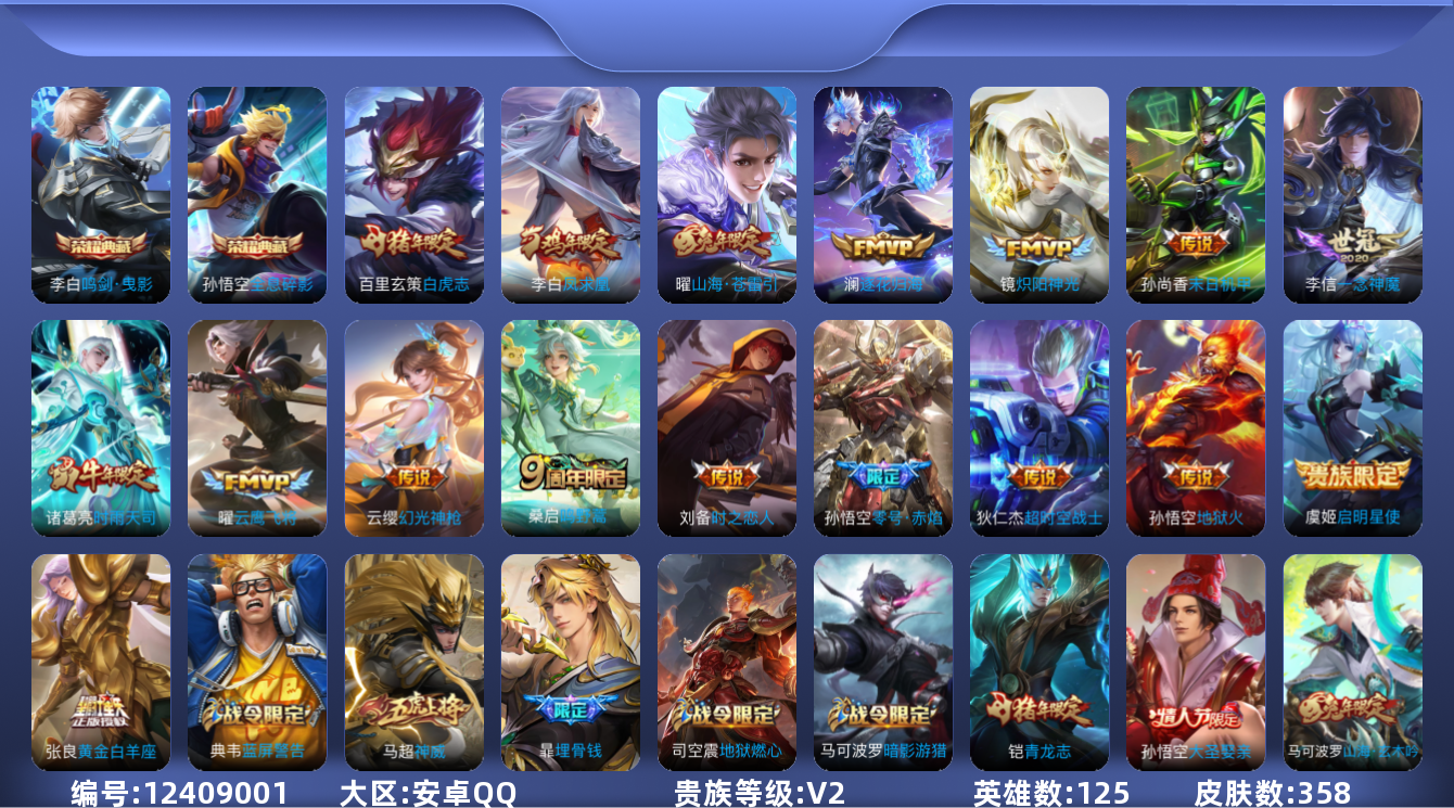 [12409001]【特价急出/详情看图】:安卓Q-V2-至尊星耀IV段位-125英雄-358皮肤-2典藏-17传说-108史诗