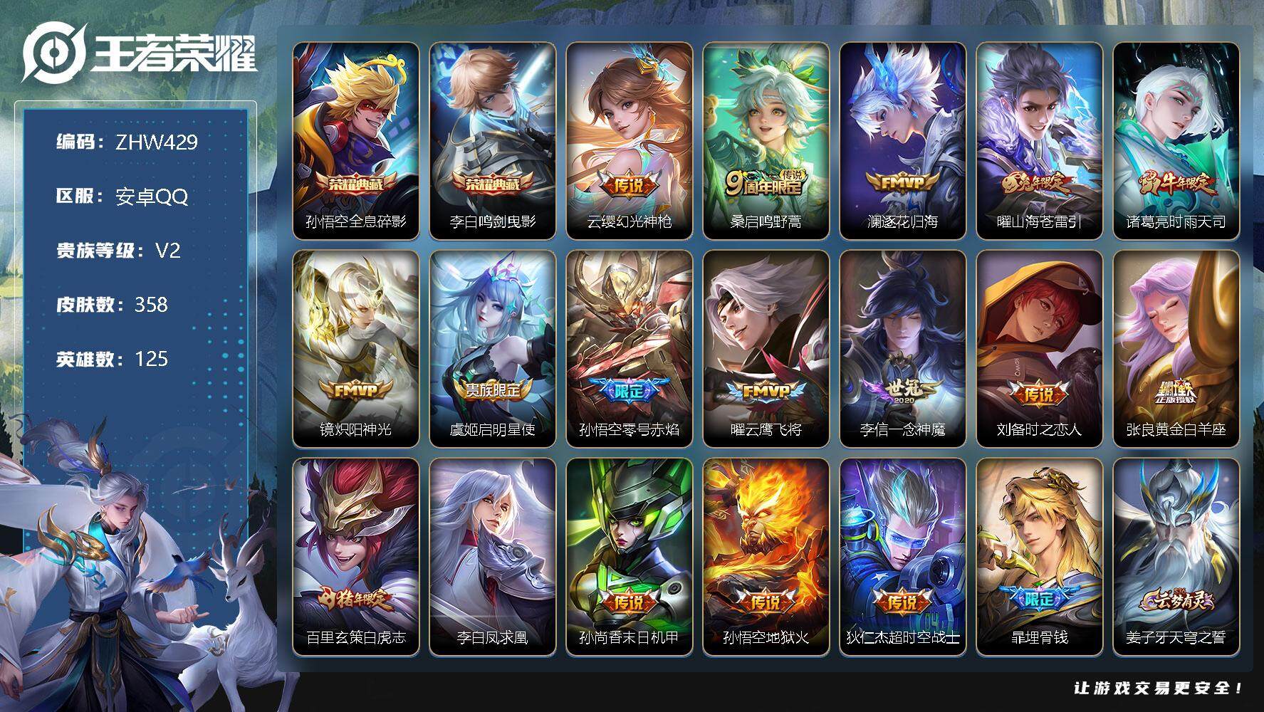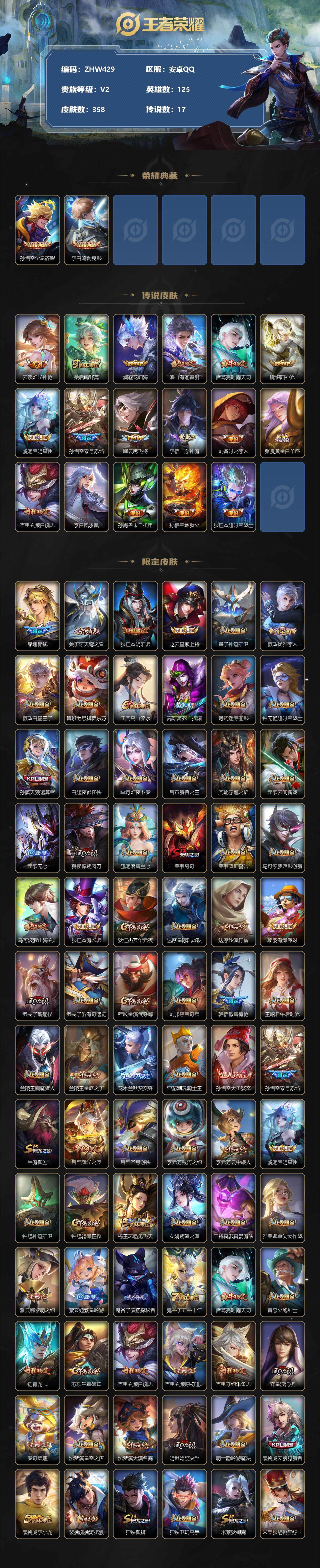 [12409001]【特价急出/详情看图】:安卓Q-V2-至尊星耀IV段位-125英雄-358皮肤-2典藏-17传说-108史诗 【英雄全皮】:刘邦全皮,猪八戒全皮,蒙恬全皮 【荣耀典藏】:孙悟空全息碎影,李白鸣剑曳影 【传说皮肤】:云缨幻光神枪,桑启鸣野蒿,澜逐花归海,曜山海苍雷引,诸葛亮时雨天司,镜炽阳神光,虞姬启明星使,孙悟空零号赤焰,曜云鹰飞将,李信一念神魔,刘备时之恋人,张良黄金白羊座,百里玄策白虎志,李白凤求凰,孙尚香末日机甲,孙悟空地狱火,狄仁杰超时空战士 【限定皮肤】:暃埋骨钱,姜子牙天穹之誓,狄仁杰阴阳师,赵云皇家上将,墨子神迹守卫,嬴政优雅恋人,嬴政白昼王子,鲁班七号狮舞东方,庄周高山流水,高渐离死亡摇滚,阿轲迷踪丽影,钟无艳超时空战士,孙膑天狼运算者,白起夜都怪侠,芈月幻夜卜梦,吕布猎兽之王,周瑜赤莲之焰,元歌云间偶戏,元歌无心,夏侯惇朔风刀,甄姬落雪兰心,典韦穷奇,典韦蓝屏警告,马可波罗暗影游猎,马可波罗山海玄木吟,狄仁杰魔术师,狄仁杰万华元夜,达摩星际陆战队,达摩沙漠行僧,项羽海滩派对,老夫子醍醐杖,老夫子航海奇遇记,程咬金演武夺筹,刘邦夺宝奇兵,韩信傲雪梅枪,王昭君午后时光,兰陵王驯魔猎人,兰陵王金庭之子,花木兰默契交锋,亚瑟潮玩骑士王,孙悟空大圣娶亲,孙悟空零号赤焰,牛魔御旌,后羿辉光之辰,后羿圣弓游侠,李元芳银河之约,李元芳云中旅人,虞姬启明星使,钟馗神迹守卫,钟馗驱傩正仪,杨玉环遇见飞天,女娲朔望之晖,干将莫邪真爱魔法,雅典娜单词大作战,雅典娜黎明之约,蔡文姬繁星吟游,鬼谷子原初探秘者,鬼谷子五谷丰年,诸葛亮时雨天司,黄忠火炮绅士,铠青龙志,苏烈千军破阵,百里玄策白虎志,百里玄策原初追逐者,百里守约朱雀志,弈星混沌棋,梦奇顽趣,沈梦溪星空之诺,沈梦溪大漠名商,明世隐疑决卦,明世隐吟游魔法,裴擒虎天狼狩猎者,裴擒虎李小龙,裴擒虎擒涛扼浪,狂铁御狮,狂铁电玩高手,米莱狄御霄,米莱狄胡桃异想国,云中君纤云弄巧,云中君时之祈愿,盾山御銮,猪八戒西部大镖客,猪八戒猪悟能,上官婉儿梁祝,上官婉儿天狼绘梦者,嫦娥拒霜思,嫦娥暖冬兔眠,曜山海苍雷引,西施玲珑珍味,蒙犽狂想玩偶喵,鲁班大师探海日志,桑启海盐诗旅,暃星界游侠,戈娅驭风魔法,艾琳女武神,艾琳流音漫舞,司空震地狱燃心,阿古朵江河有灵,张良古海寻踪,蒙犽百解令,蒙恬荣光圣徽,高渐离燃音魔法,妲己灵卜魔法,鬼谷