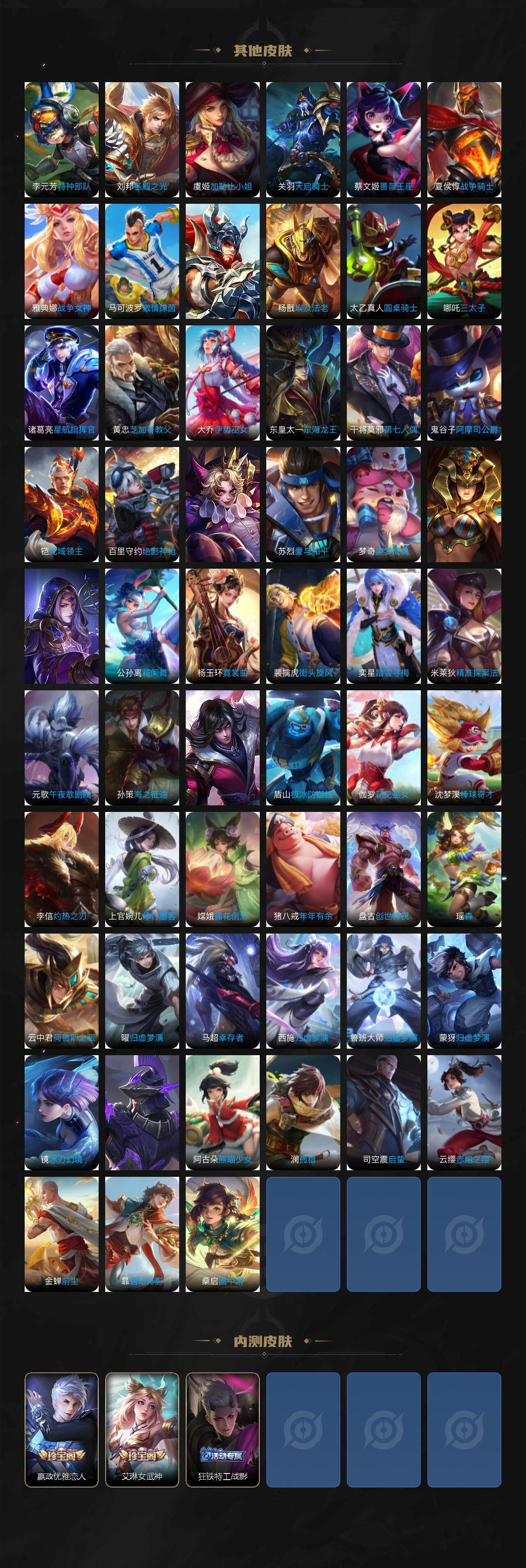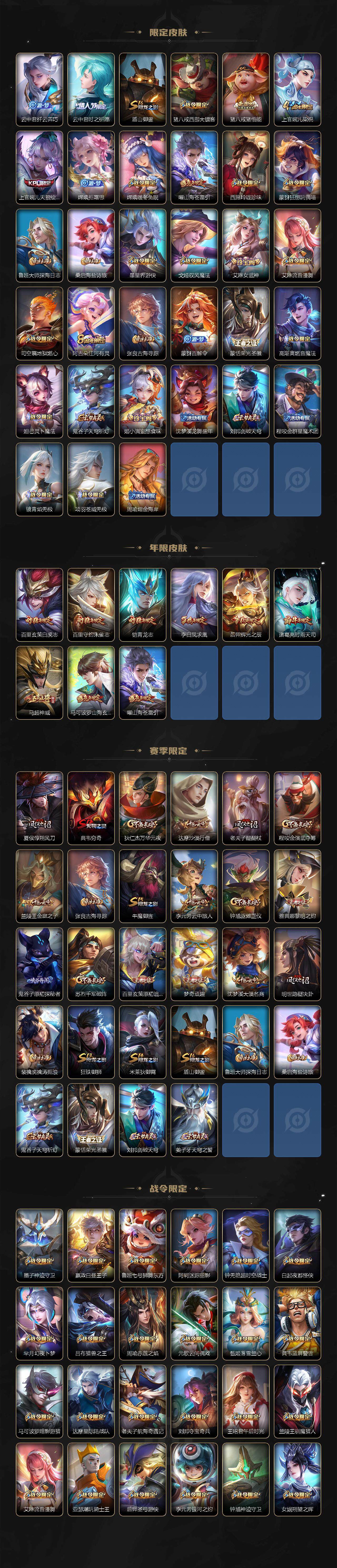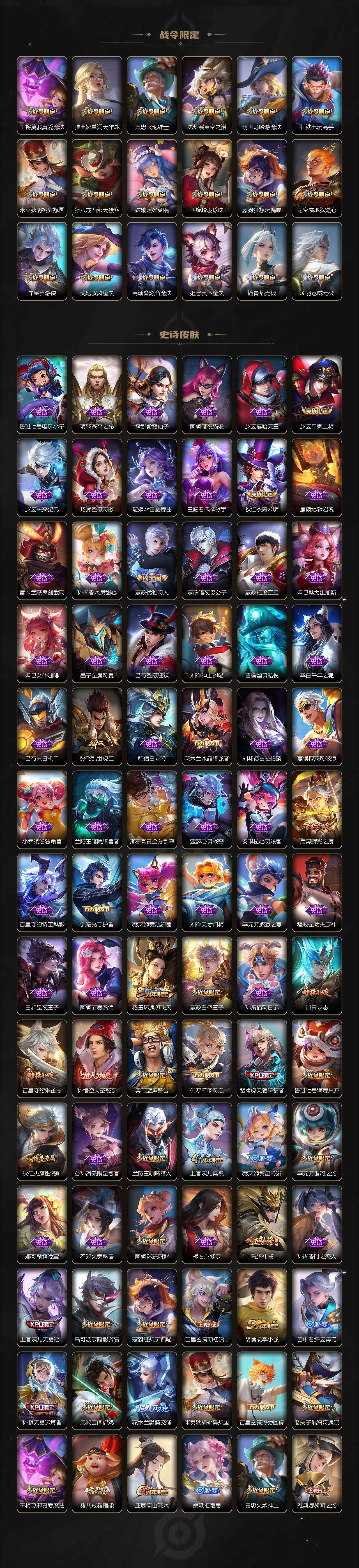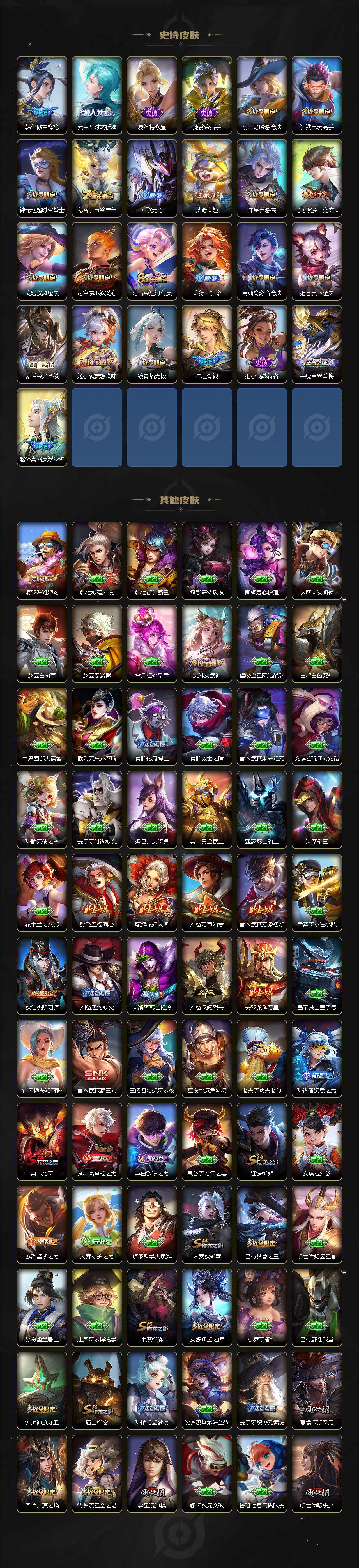 【限定皮肤】:暃埋骨钱,姜子牙天穹之誓,狄仁杰阴阳师,赵云皇家上将,墨子神迹守卫,嬴政优雅恋人,嬴政白昼王子,鲁班七号狮舞东方,庄周高山流水,高渐离死亡摇滚,阿轲迷踪丽影,钟无艳超时空战士,孙膑天狼运算者,白起夜都怪侠,芈月幻夜卜梦,吕布猎兽之王,周瑜赤莲之焰,元歌云间偶戏,元歌无心,夏侯惇朔风刀,甄姬落雪兰心,典韦穷奇,典韦蓝屏警告,马可波罗暗影游猎,马可波罗山海玄木吟,狄仁杰魔术师,狄仁杰万华元夜,达摩星际陆战队,达摩沙漠行僧,项羽海滩派对,老夫子醍醐杖,老夫子航海奇遇记,程咬金演武夺筹,刘邦夺宝奇兵,韩信傲雪梅枪,王昭君午后时光,兰陵王驯魔猎人,兰陵王金庭之子,花木兰默契交锋,亚瑟潮玩骑士王,孙悟空大圣娶亲,孙悟空零号赤焰,牛魔御旌,后羿辉光之辰,后羿圣弓游侠,李元芳银河之约,李元芳云中旅人,虞姬启明星使,钟馗神迹守卫,钟馗驱傩正仪,杨玉环遇见飞天,女娲朔望之晖,干将莫邪真爱魔法,雅典娜单词大作战,雅典娜黎明之约,蔡文姬繁星吟游,鬼谷子原初探秘者,鬼谷子五谷丰年,诸葛亮时雨天司,黄忠火炮绅士,铠青龙志,苏烈千军破阵,百里玄策白虎志,百里玄策原初追逐者,百里守约朱雀志,弈星混沌棋,梦奇顽趣,沈梦溪星空之诺,沈梦溪大漠名商,明世隐疑决卦,明世隐吟游魔法,裴擒虎天狼狩猎者,裴擒虎李小龙,裴擒虎擒涛扼浪,狂铁御狮,狂铁电玩高手,米莱狄御霄,米莱狄胡桃异想国,云中君纤云弄巧,云中君时之祈愿,盾山御銮,猪八戒西部大镖客,猪八戒猪悟能,上官婉儿梁祝,上官婉儿天狼绘梦者,嫦娥拒霜思,嫦娥暖冬兔眠,曜山海苍雷引,西施玲珑珍味,蒙犽狂想玩偶喵,鲁班大师探海日志,桑启海盐诗旅,暃星界游侠,戈娅驭风魔法,艾琳女武神,艾琳流音漫舞,司空震地狱燃心,阿古朵江河有灵,张良古海寻踪,蒙犽百解令,蒙恬荣光圣徽,高渐离燃音魔法,妲己灵卜魔法,鬼谷