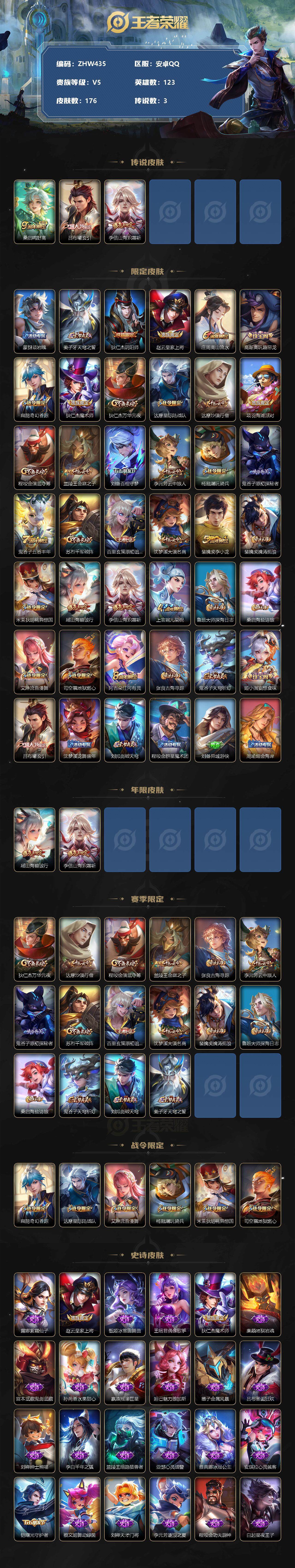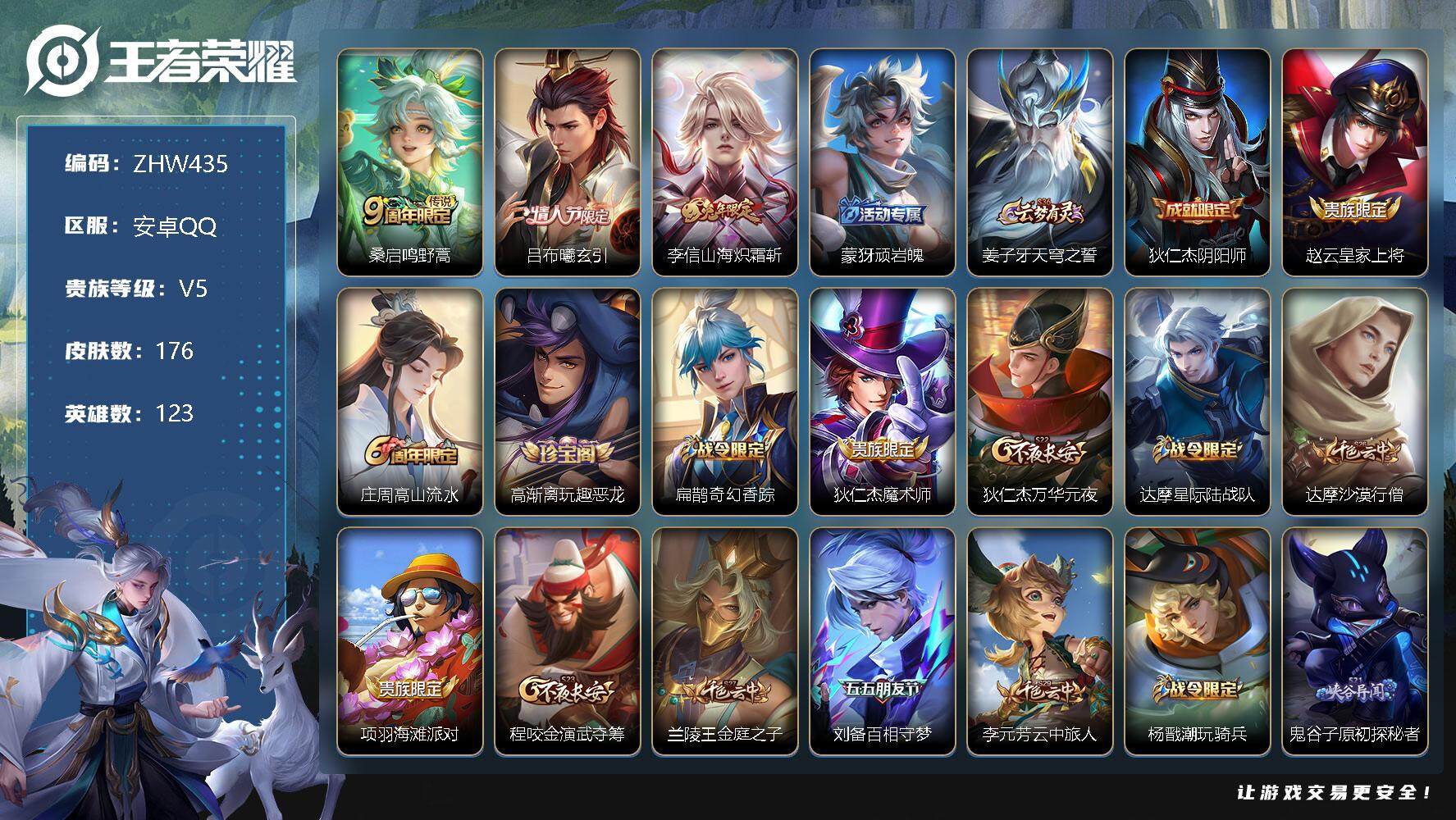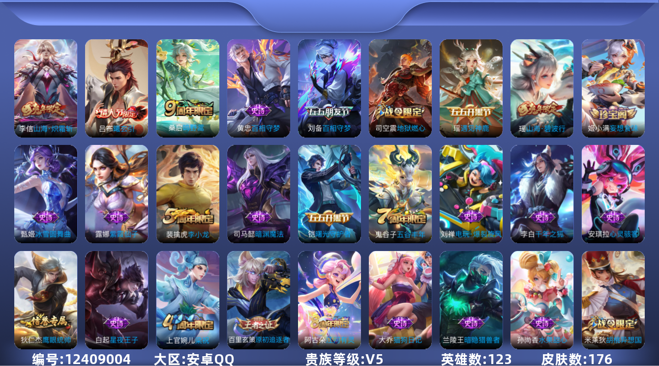 [12409004]【特价急出/详情看图】:安卓Q-V5-尊贵铂金I段位-123英雄-176皮肤-3传说-43史诗