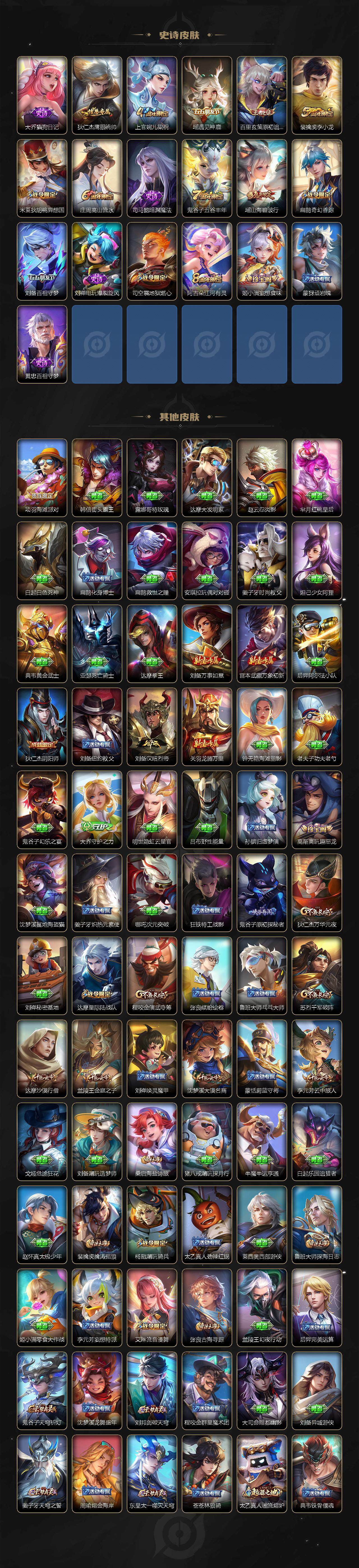 【史诗皮肤】:露娜紫霞仙子,赵云皇家上将,甄姬冰雪圆舞曲,王昭君偶像歌手,狄仁杰魔术师,廉颇地狱岩魂,宫本武藏鬼剑武藏,孙尚香水果甜心,嬴政摇滚巨星,妲己魅力维加斯,墨子金属风暴,吕布圣诞狂欢,刘禅绅士熊喵,李白千年之狐,兰陵王暗隐猎兽者,亚瑟心灵战警,雅典娜冰冠公主,安琪拉心灵骇客,铠曙光守护者,蔡文姬舞动绿茵,刘禅天才门将,李元芳逐浪之夏,程咬金功夫厨神,白起星夜王子,大乔猫狗日记,狄仁杰鹰眼统帅,上官婉儿梁祝,瑶遇见神鹿,百里玄策原初追逐者,裴擒虎李小龙,米莱狄胡桃异想国,庄周高山流水,司马懿暗渊魔法,鬼谷子五谷丰年,瑶山海碧波行,扁鹊奇幻香踪,刘备百相守梦,刘禅电玩爆裂旋风,司空震地狱燃心,阿古朵江河有灵,姬小满妄想食味,蒙犽顽岩魄,黄忠百相守梦
