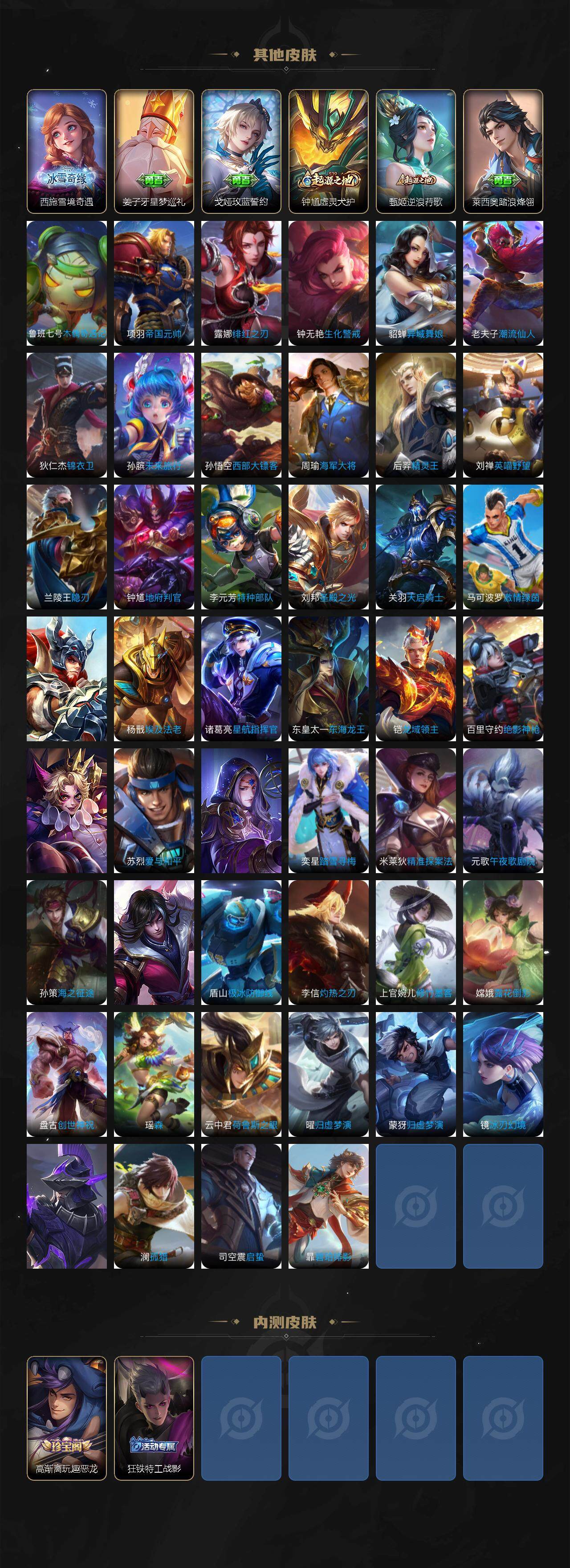 【限定皮肤】:蒙犽顽岩魄,姜子牙天穹之誓,狄仁杰阴阳师,赵云皇家上将,庄周高山流水,高渐离玩趣恶龙,扁鹊奇幻香踪,狄仁杰魔术师,狄仁杰万华元夜,达摩星际陆战队,达摩沙漠行僧,项羽海滩派对,程咬金演武夺筹,兰陵王金庭之子,刘备百相守梦,李元芳云中旅人,杨戬潮玩骑兵,鬼谷子原初探秘者,鬼谷子五谷丰年,苏烈千军破阵,百里玄策原初追逐者,沈梦溪大漠名商,裴擒虎李小龙,裴擒虎擒涛扼浪,米莱狄胡桃异想国,瑶山海碧波行,李信山海炽霜斩,上官婉儿梁祝,鲁班大师探海日志,桑启海盐诗旅,艾琳流音漫舞,司空震地狱燃心,阿古朵江河有灵,张良古海寻踪,鬼谷子天穹祈灯,姬小满妄想食味,吕布曦玄引,沈梦溪龙舞盛年,刘邦剑破天穹,程咬金群星魔术团,刘备异域游侠,周瑜熔金海岸