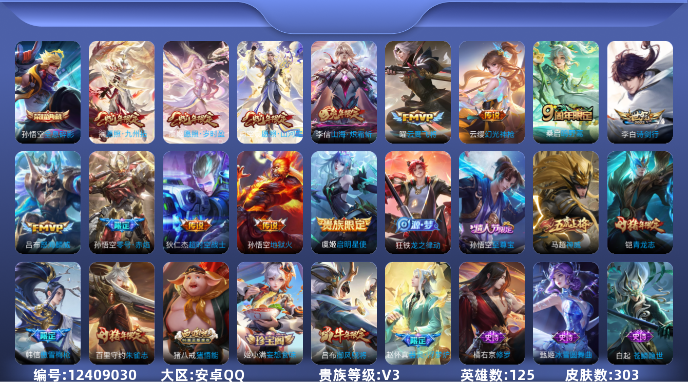 [12409030]【特价急出/详情看图】:安卓Q-V3-永恒钻石II段位-125英雄-303皮肤-1典藏-13传说-79史诗