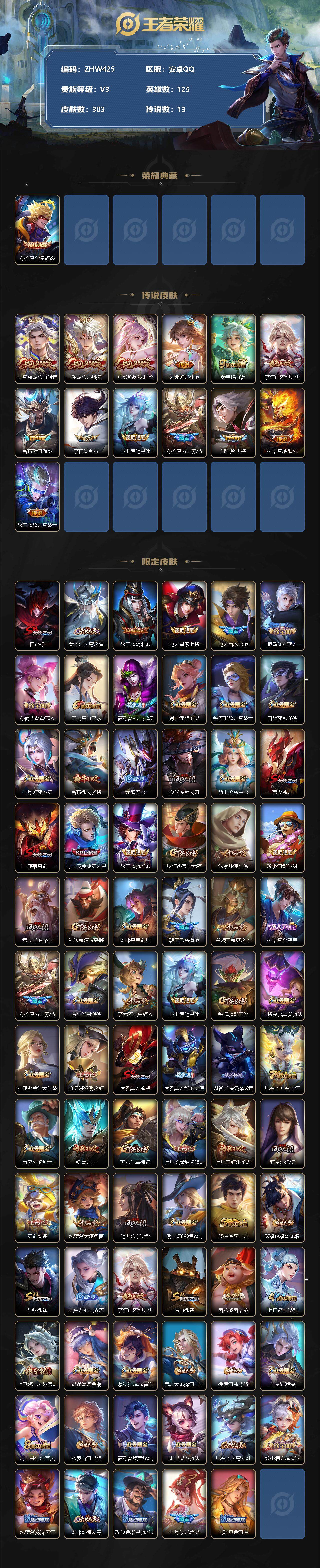 - [11597565]V8 2典藏 4珍品传说 24传说 125英雄 309皮肤 可修改实名 优质装备:鸣剑·曳影,幻阙歌(貂蝉典藏),怪盗基德,器灵·落星盏,朽木白哉,黑崎一护,黄金射手座,冠军飞将,云鹰飞将(小将军),黄金白羊座,久胜战神,炽阳神光,地狱火,游龙清影(小青龙),淬星耀世,无双飞将,碎云,山海·炽霜斩(李信年限),山海·苍雷引(电光曜子),燃星之曲,电玩·雷克斯,琥珀纪元铠,琥珀纪元马超 传说皮:幻光神枪 珍宝阁皮:妄想食味,女武神 限定皮:愿照·千秋盛(女娲年限),逐霄战戟,陌上桑,鸣野蒿,神威(电光马子),高山流水,齐天大圣,五谷丰年,梁祝,岱宗(典韦年限),启示之音,枫霜尽,山海·玄木吟(马可年限) 史诗皮:鸭鸭历险记-刘禅,器灵·浮梦炉,化蝶舞,星界战将,龙之律动,石田雨龙,百相守梦-周瑜,茶境仙,海诺心动手记,破空之剑,战舞者,涂山红红,东方月初,蒙犽顽岩魄,埋骨钱,芈月浮光幕影,怒海争锋,谪仙醉月,上官婉儿群星魔术团,蔬乡物语(鲁班七号),琥珀纪元伽罗,百相守梦-百里守约,炽弈燎原,紫霞仙子,苍穹之光,电玩小子(小书包),黄金分割率,特工魅影,千年之狐,永昼,匿光破解者,江河有灵,雪夜绮愿(周瑜),百解令(蒙犽),高渐离燃音魔法,蒙恬荣光圣徽,偶像歌手,龙骑士(小龙虾),白蛇,暗夜猫娘,无限星赏官,晚萤,青蛇,末日机甲-吕布,猫狗日记-孙策,猫狗日记-大乔,节奏热浪,修罗,女仆咖啡,摇滚巨星,水果甜心,天才门将,星夜王子,心灵骇客,功夫厨神,德古拉伯爵,暗隐猎兽者,幽灵船长,鬼剑武藏,心灵战警,乐园奇幻夜,舞动绿茵,纤云弄巧,拒霜思,缤纷独角兽,乘风破浪,逐浪之夏,龙鼓争鸣,水晶猎龙者,曙光守护者,箭羽风息,金属风暴,原初追逐者,圣诞狂欢,圣诞恋歌,鹰眼统帅,暗夜贵公子,魅力维加斯,黎明之约,无心