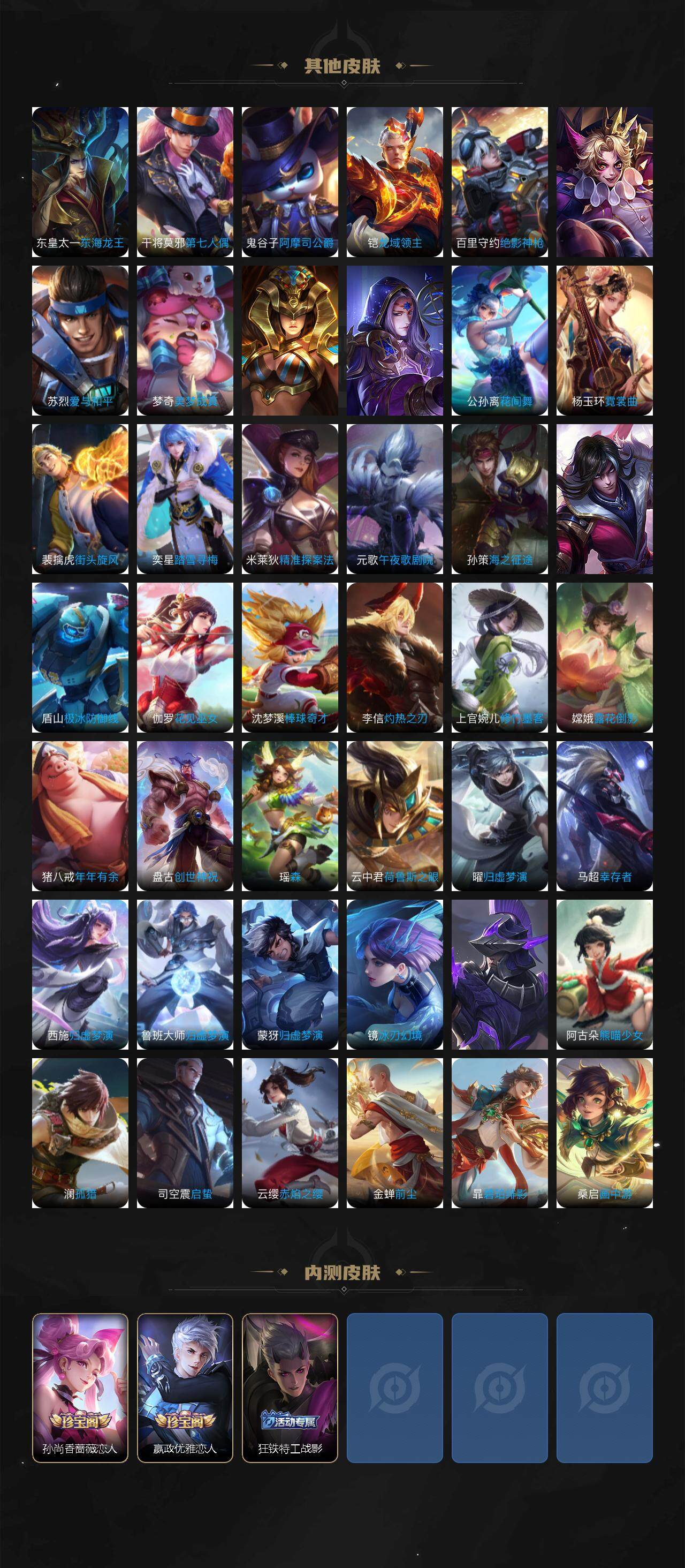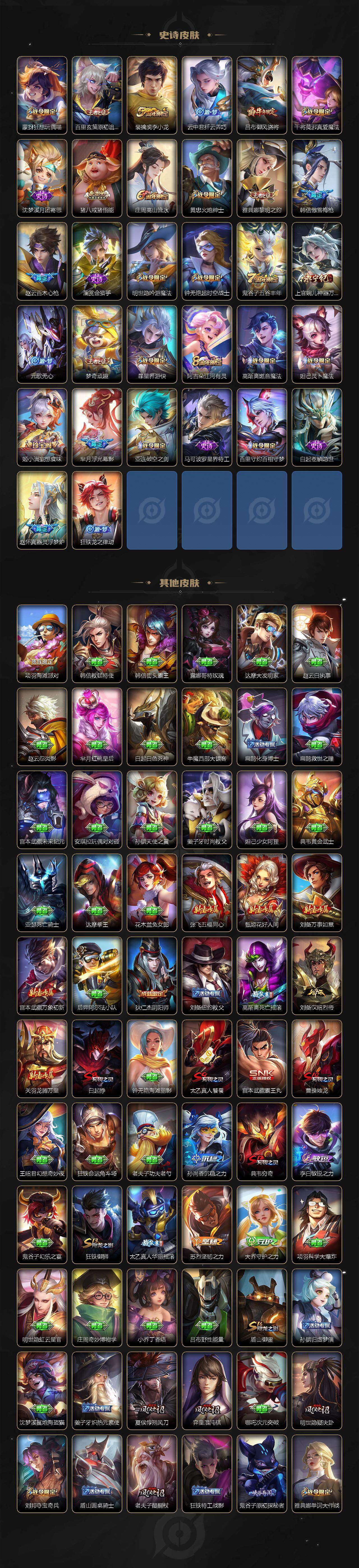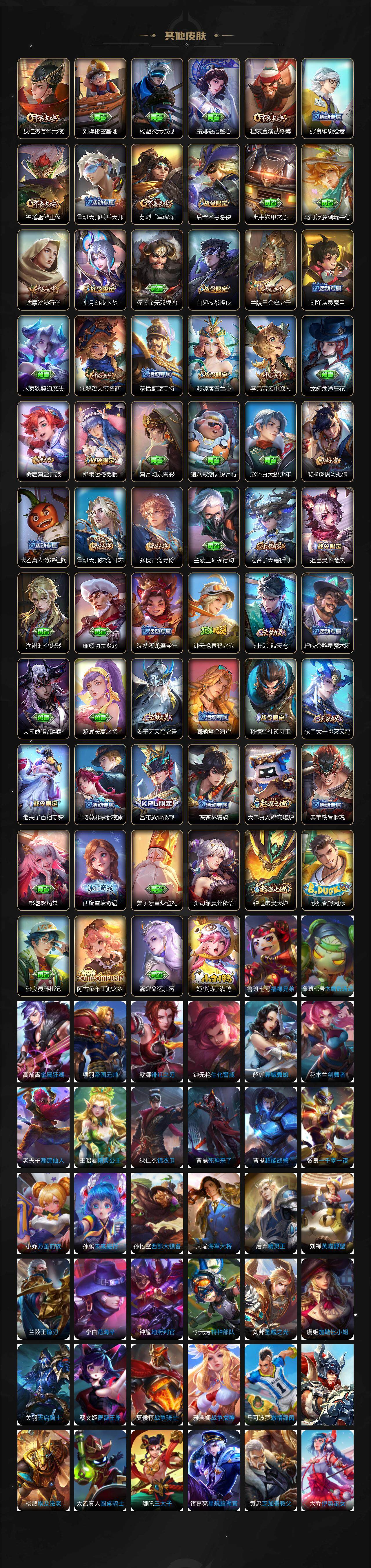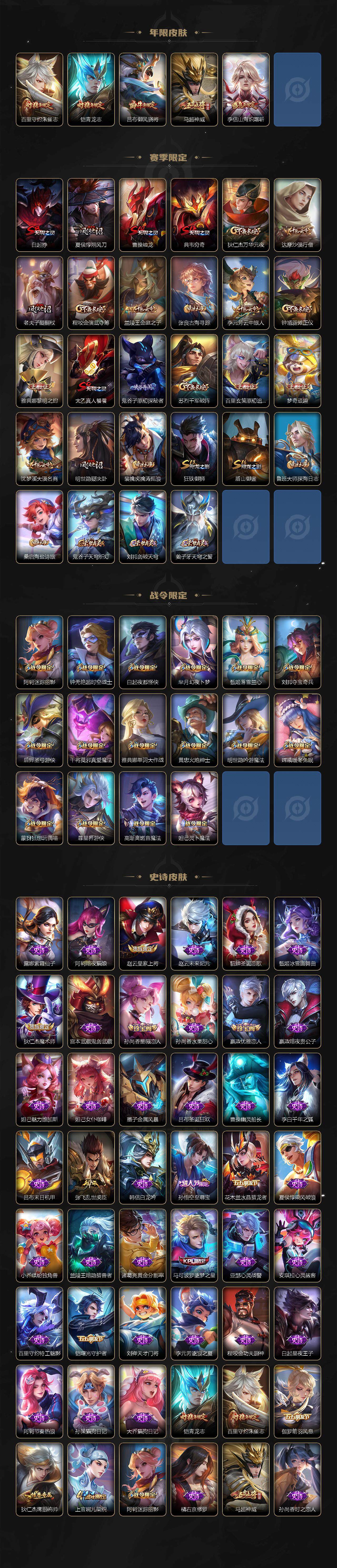 【限定皮肤】:白起狰,姜子牙天穹之誓,狄仁杰阴阳师,赵云皇家上将,赵云百木心枪,嬴政优雅恋人,孙尚香蔷薇恋人,庄周高山流水,高渐离死亡摇滚,阿轲迷踪丽影,钟无艳超时空战士,白起夜都怪侠,芈月幻夜卜梦,吕布御风骁将,元歌无心,夏侯惇朔风刀,甄姬落雪兰心,曹操烛龙,典韦穷奇,马可波罗逐梦之星,狄仁杰魔术师,狄仁杰万华元夜,达摩沙漠行僧,项羽海滩派对,老夫子醍醐杖,程咬金演武夺筹,刘邦夺宝奇兵,韩信傲雪梅枪,兰陵王金庭之子,孙悟空至尊宝,孙悟空零号赤焰,后羿圣弓游侠,李元芳云中旅人,虞姬启明星使,钟馗驱傩正仪,干将莫邪真爱魔法,雅典娜单词大作战,雅典娜黎明之约,太乙真人饕餮,太乙真人华丽摇滚,鬼谷子原初探秘者,鬼谷子五谷丰年,黄忠火炮绅士,铠青龙志,苏烈千军破阵,百里玄策原初追逐者,百里守约朱雀志,弈星混沌棋,梦奇顽趣,沈梦溪大漠名商,明世隐疑决卦,明世隐吟游魔法,裴擒虎李小龙,裴擒虎擒涛扼浪,狂铁御狮,云中君纤云弄巧,李信山海炽霜斩,盾山御銮,猪八戒猪悟能,上官婉儿梁祝,上官婉儿神器万象笔,嫦娥暖冬兔眠,蒙犽狂想玩偶喵,鲁班大师探海日志,桑启海盐诗旅,暃星界游侠,阿古朵江河有灵,张良古海寻踪,高渐离燃音魔法,妲己灵卜魔法,鬼谷子天穹祈灯,姬小满妄想食味,沈梦溪龙舞盛年,刘邦剑破天穹,程咬金群星魔术团,芈月浮光幕影,周瑜熔金海岸