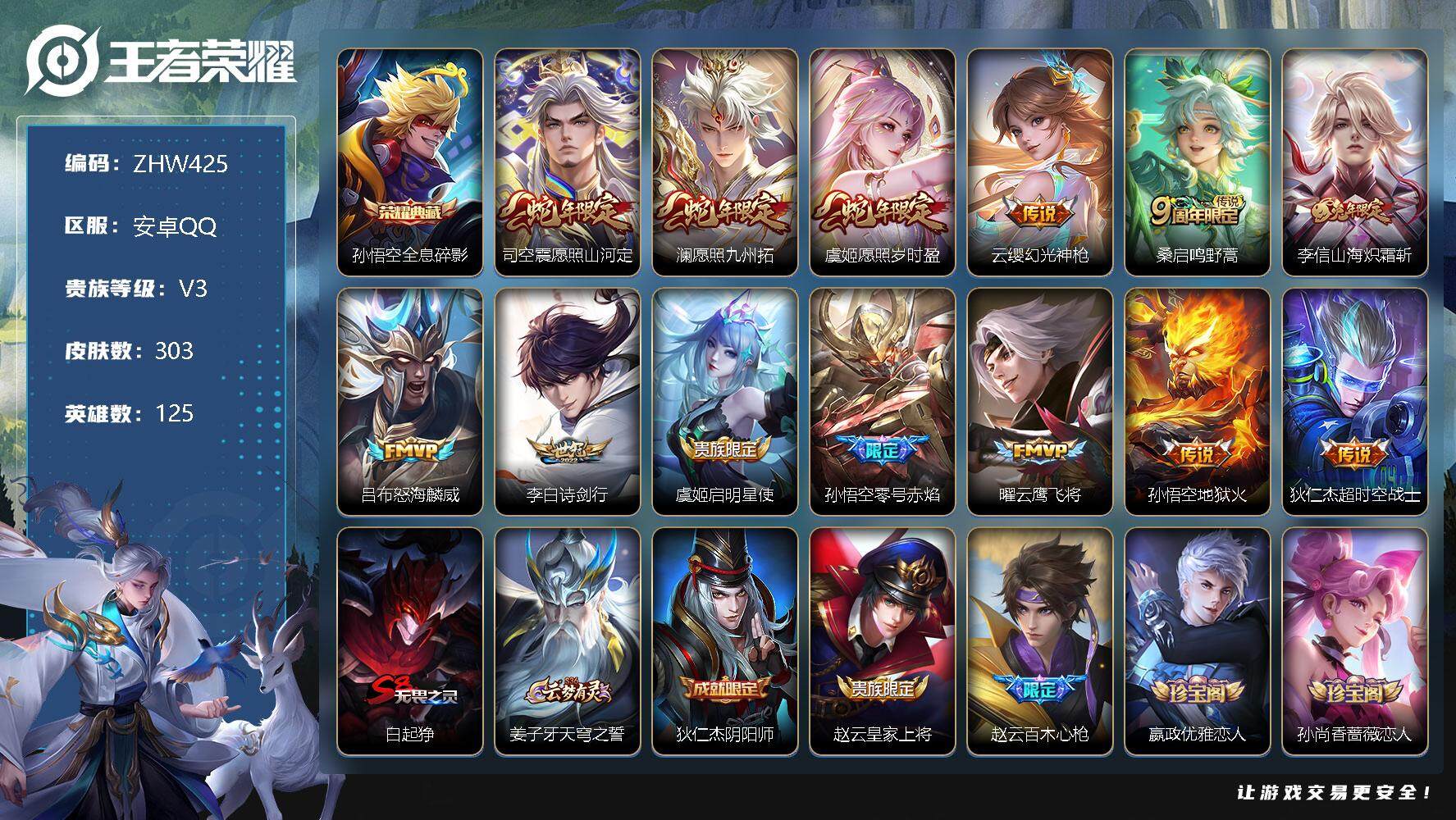 [12409030]【特价急出/详情看图】:安卓Q-V3-永恒钻石II段位-125英雄-303皮肤-1典藏-13传说-79史诗 【英雄全皮】:太乙真人全皮,影全皮 【荣耀典藏】:孙悟空全息碎影 【传说皮肤】:司空震愿照山河定,澜愿照九州拓,虞姬愿照岁时盈,云缨幻光神枪,桑启鸣野蒿,李信山海炽霜斩,吕布怒海麟威,李白诗剑行,虞姬启明星使,孙悟空零号赤焰,曜云鹰飞将,孙悟空地狱火,狄仁杰超时空战士 【限定皮肤】:白起狰,姜子牙天穹之誓,狄仁杰阴阳师,赵云皇家上将,赵云百木心枪,嬴政优雅恋人,孙尚香蔷薇恋人,庄周高山流水,高渐离死亡摇滚,阿轲迷踪丽影,钟无艳超时空战士,白起夜都怪侠,芈月幻夜卜梦,吕布御风骁将,元歌无心,夏侯惇朔风刀,甄姬落雪兰心,曹操烛龙,典韦穷奇,马可波罗逐梦之星,狄仁杰魔术师,狄仁杰万华元夜,达摩沙漠行僧,项羽海滩派对,老夫子醍醐杖,程咬金演武夺筹,刘邦夺宝奇兵,韩信傲雪梅枪,兰陵王金庭之子,孙悟空至尊宝,孙悟空零号赤焰,后羿圣弓游侠,李元芳云中旅人,虞姬启明星使,钟馗驱傩正仪,干将莫邪真爱魔法,雅典娜单词大作战,雅典娜黎明之约,太乙真人饕餮,太乙真人华丽摇滚,鬼谷子原初探秘者,鬼谷子五谷丰年,黄忠火炮绅士,铠青龙志,苏烈千军破阵,百里玄策原初追逐者,百里守约朱雀志,弈星混沌棋,梦奇顽趣,沈梦溪大漠名商,明世隐疑决卦,明世隐吟游魔法,裴擒虎李小龙,裴擒虎擒涛扼浪,狂铁御狮,云中君纤云弄巧,李信山海炽霜斩,盾山御銮,猪八戒猪悟能,上官婉儿梁祝,上官婉儿神器万象笔,嫦娥暖冬兔眠,蒙犽狂想玩偶喵,鲁班大师探海日志,桑启海盐诗旅,暃星界游侠,阿古朵江河有灵,张良古海寻踪,高渐离燃音魔法,妲己灵卜魔法,鬼谷子天穹祈灯,姬小满妄想食味,沈梦溪龙舞盛年,刘邦剑破天穹,程咬金群星魔术团,芈月浮光幕影,周瑜熔金海岸 【年限皮肤】:百里守约朱雀志,铠青龙志,吕布御风骁将,马超神威,李信山海炽霜斩 【赛季限定】:白起狰,夏侯惇朔风刀,曹操烛龙,典韦穷奇,狄仁杰万华元夜,达摩沙漠行僧,老夫子醍醐杖,程咬金演武夺筹,兰陵王金庭之子,张良古海寻踪,李元芳云中旅人,钟馗驱傩正仪,雅典娜黎明之约,太乙真人饕餮,鬼谷子原初探秘者,苏烈千军破阵,百里玄策原初追逐者,弈星混沌棋,梦奇顽趣,沈梦溪大漠名商,明世隐疑决卦,裴擒虎擒涛扼浪,狂铁御狮,盾山御銮,鲁班大师探海日志,桑启海盐诗旅,鬼谷子天穹祈灯,刘邦