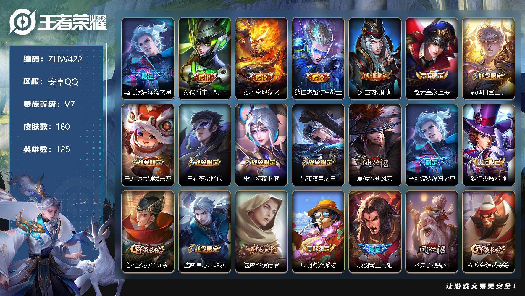 [12409076]【商品标题】:安卓Q-V7-尊贵铂金I段位-125英雄-180皮肤-4传说-41史诗