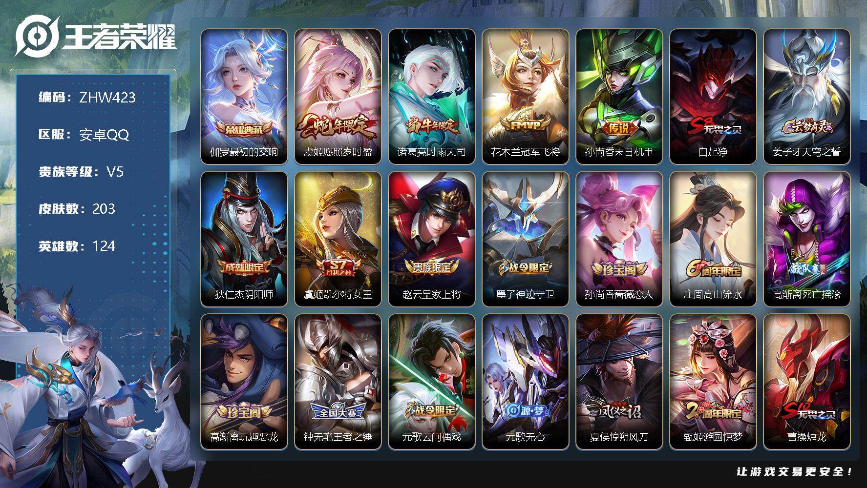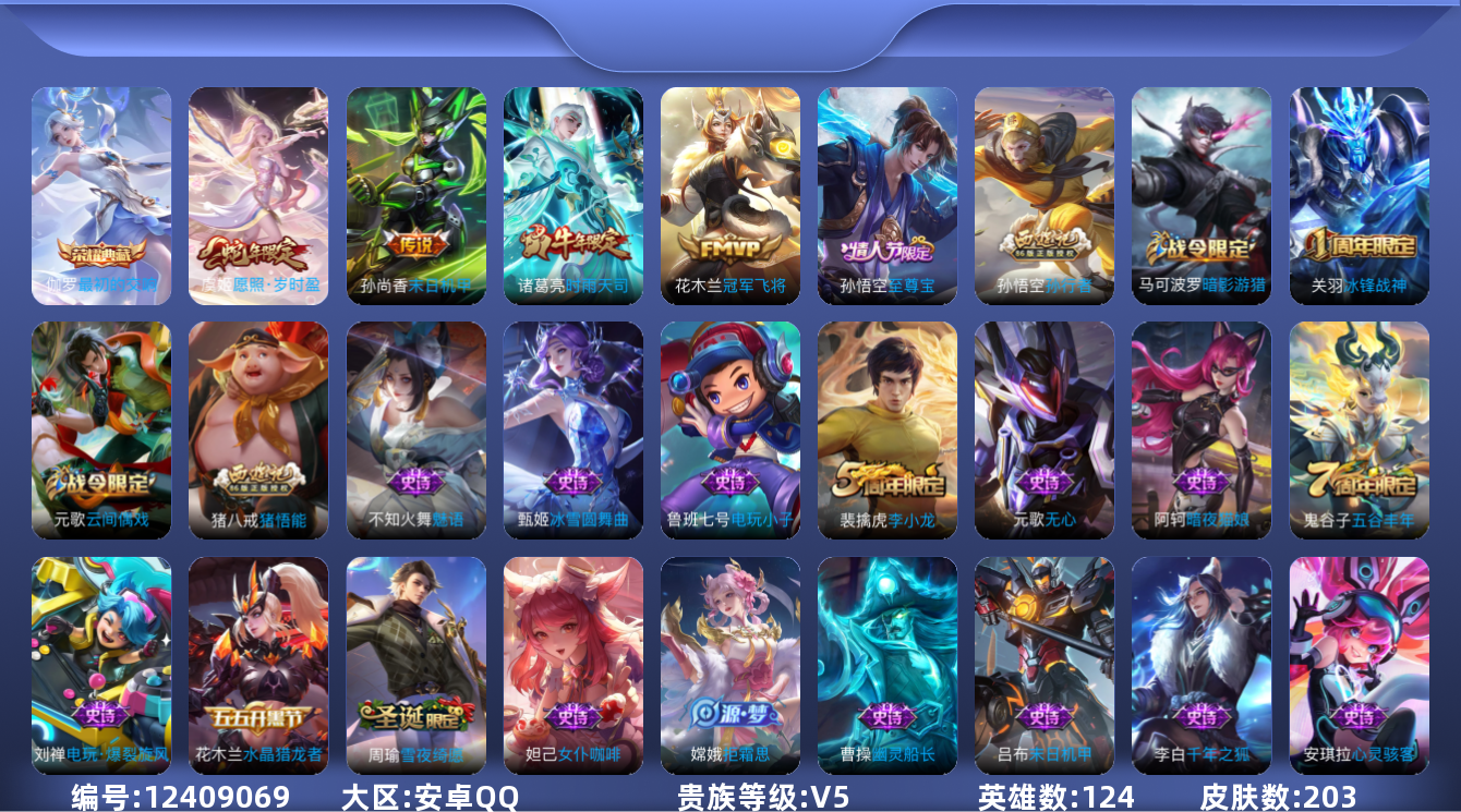 [12409069]【商品标题】:安卓Q-V5-尊贵铂金II段位-124英雄-203皮肤-1典藏-4传说-57史诗