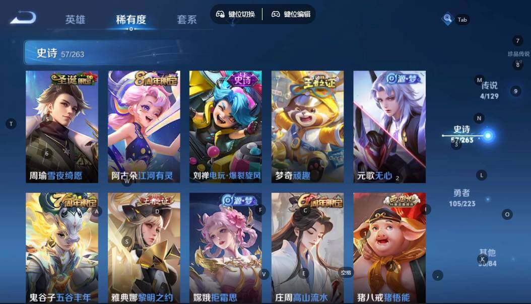 【史诗皮肤】:鲁班七号电玩小子,阿轲暗夜猫娘,钟无艳王者之锤,赵云皇家上将,赵云未来纪元,甄姬冰雪圆舞曲,王昭君偶像歌手,狄仁杰魔术师,廉颇地狱岩魂,宫本武藏鬼剑武藏,孙