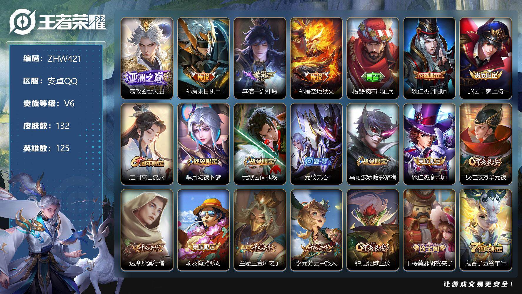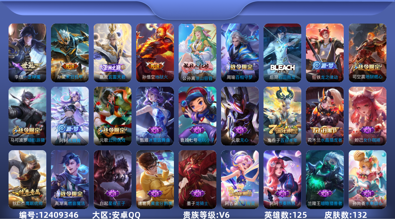 [12409346]【商品标题】:安卓Q-V6-永恒钻石IV段位-125英雄-132皮肤-4传说-36史诗