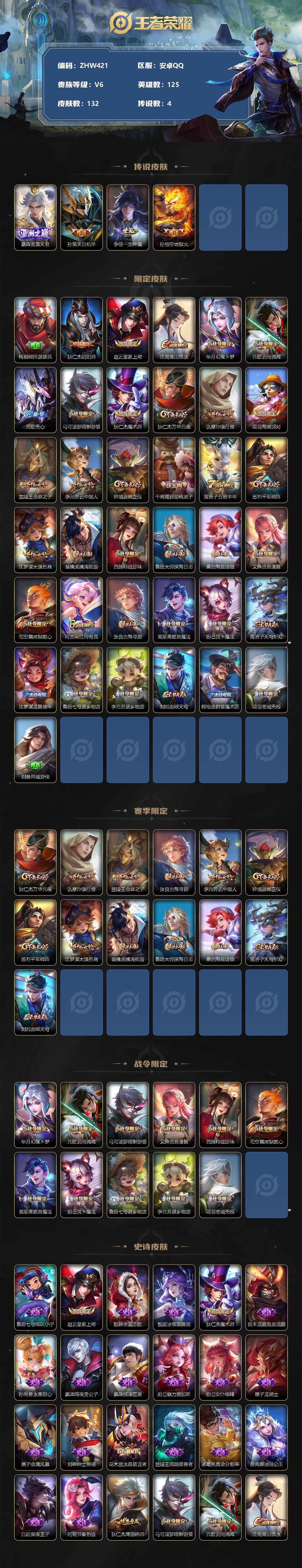 [12409346]【商品标题】:安卓Q-V6-永恒钻石IV段位-125英雄-132皮肤-4传说-36史诗 【英雄全皮】:空空儿全皮 【传说皮肤】:嬴政玄雷天君,孙策末日机甲,李信一念神魔,孙悟空地狱火 【限定皮肤】:杨戬破阵退雄兵,狄仁杰阴阳师,赵云皇家上将,庄周高山流水,芈月幻夜卜梦,元歌云间偶戏,元歌无心,马可波罗暗影游猎,狄仁杰魔术师,狄仁杰万华元夜,达摩沙漠行僧,项羽海滩派对,兰陵王金庭之子,李元芳云中旅人,钟馗驱傩正仪,干将莫邪胡桃夹子,鬼谷子五谷丰年,苏烈千军破阵,沈梦溪大漠名商,裴擒虎擒涛扼浪,西施玲珑珍味,鲁班大师探海日志,桑启海盐诗旅,艾琳流音漫舞,司空震地狱燃心,阿古朵江河有灵,张良古海寻踪,高渐离燃音魔法,妲己灵卜魔法,鬼谷子天穹祈灯,沈梦溪龙舞盛年,鲁班七号蔬乡物语,李元芳蔬乡物语,刘邦剑破天穹,程咬金群星魔术团,项羽苍威无极,刘备异域游侠 【赛季限定】:狄仁杰万华元夜,达摩沙漠行僧,兰陵王金庭之子,张良古海寻踪,李元芳云中旅人,钟馗驱傩正仪,苏烈千军破阵,沈梦溪大漠名商,裴擒虎擒涛扼浪,鲁班大师探海日志,桑启海盐诗旅,鬼谷子天穹祈灯,刘邦剑破天穹 【战令限定】:芈月幻夜卜梦,元歌云间偶戏,马可波罗暗影游猎,艾琳流音漫舞,西施玲珑珍味,司空震地狱燃心,高渐离燃音魔法,妲己灵卜魔法,鲁班七号蔬乡物语,李元芳蔬乡物语,项羽苍威无极 【史诗皮肤】:鲁班七号电玩小子,赵云皇家上将,貂蝉圣诞恋歌,甄姬冰雪圆舞曲,狄仁杰魔术师,宫本武藏鬼剑武藏,孙尚香水果甜心,嬴政暗夜贵公子,嬴政摇滚巨星,妲己魅力维加斯,妲己女仆咖啡,墨子龙骑士,墨子金属风暴,刘禅绅士熊喵,花木兰水晶猎龙者,兰陵王暗隐猎兽者,诸葛亮黄金分割率,雅典娜冰冠公主,白起星夜王子,阿轲节奏热浪,狄仁杰鹰眼统帅,马可波罗暗影游猎,元歌云间偶戏,庄周高山流水,鬼谷子五谷丰年,元歌无心,司空震地狱燃心,阿古朵江河有灵,妲己灵卜魔法,高渐离燃音魔法,鲁班七号蔬乡物语,孙膑茶境仙,阿轲化蝶舞,狂铁龙之律动,后羿石田雨龙,周瑜百相守梦,公孙离涂山容容 【其他皮肤】:项羽海滩派对,韩信教廷特使,露娜哥特玫瑰,赵云白执事,赵云忍炎影,程咬金星际陆战队,白起白色死神,牛魔西部大镖客,宫本武藏未来纪元,安琪拉玩偶对对碰,妲己少女阿狸,亚瑟死亡骑士,达摩拳王,张飞五福同心,狄仁杰阴阳师,刘备汉昭烈帝,宫本武藏霸王丸,王昭君幻想奇妙
