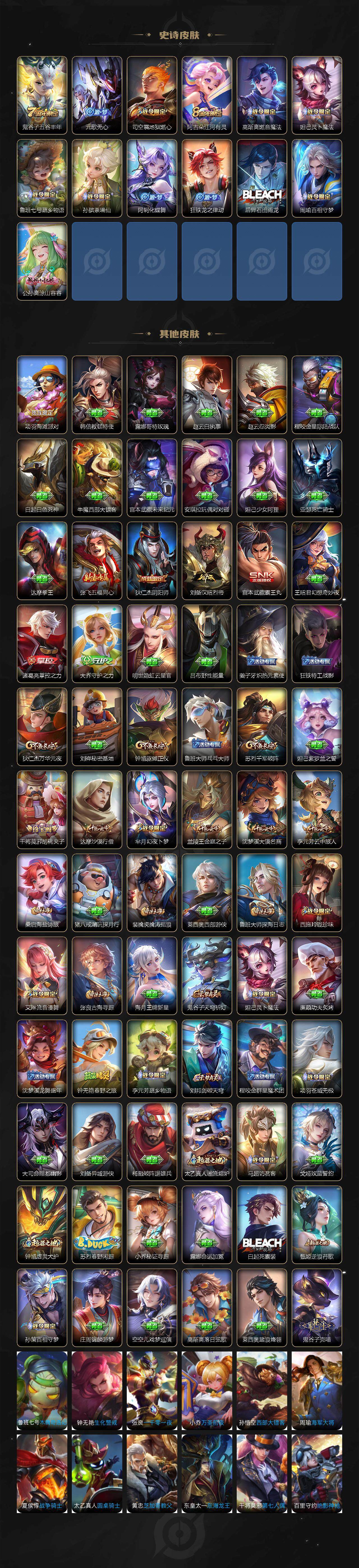 【史诗皮肤】:鲁班七号电玩小子,赵云皇家上将,貂蝉圣诞恋歌,甄姬冰雪圆舞曲,狄仁杰魔术师,宫本武藏鬼剑武藏,孙尚香水果甜心,嬴政暗夜贵公子,嬴政摇滚巨星,妲己魅力维加斯,妲己女仆咖啡,墨子龙骑士,墨子金属风暴,刘禅绅士熊喵,花木兰水晶猎龙者,兰陵王暗隐猎兽者,诸葛亮黄金分割率,雅典娜冰冠公主,白起星夜王子,阿轲节奏热浪,狄仁杰鹰眼统帅,马可波罗暗影游猎,元歌云间偶戏,庄周高山流水,鬼谷子五谷丰年,元歌无心,司空震地狱燃心,阿古朵江河有灵,妲己灵卜魔法,高渐离燃音魔法,鲁班七号蔬乡物语,孙膑茶境仙,阿轲化蝶舞,狂铁龙之律动,后羿石田雨龙,周瑜百相守梦,公孙离涂山容容