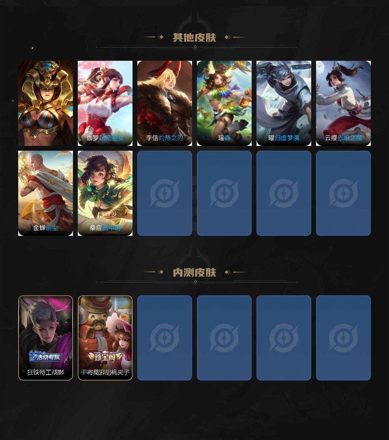 【赛季限定】:狄仁杰万华元夜,达摩沙漠行僧,兰陵王金庭之子,张良古海寻踪,李元芳云中旅人,钟馗驱傩正仪,苏烈千军破阵,沈梦溪大漠名商,裴擒虎擒涛扼浪,鲁班大师探海日志,桑启海盐诗旅,鬼谷子天穹祈灯,刘邦剑破天穹