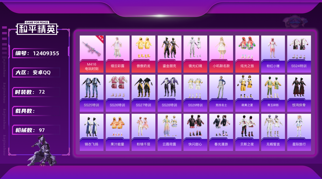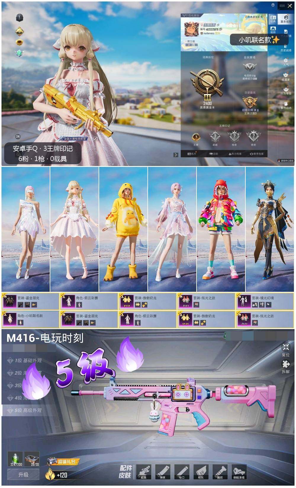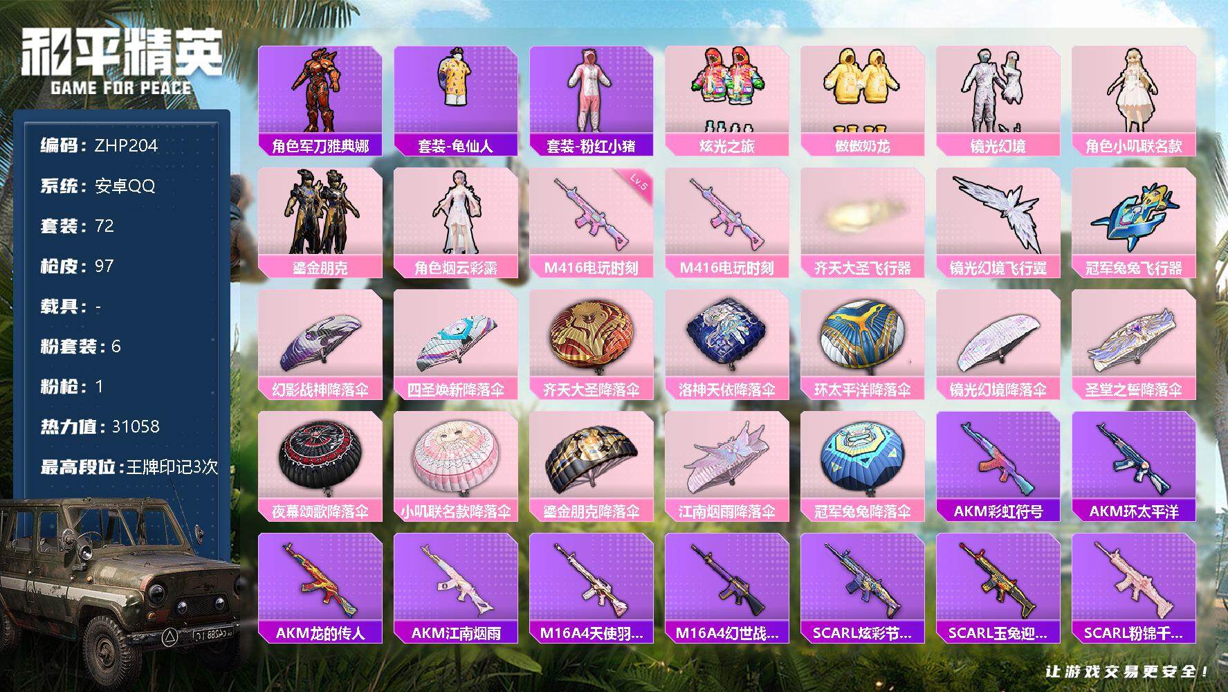 [12409355]【特价急出/详情看图】:安卓 手Q-6粉装-1特效枪-3粉色飞行器-3.1w热力值-3王牌印记-72套装-97枪皮【热门品类】:角色-军刀雅典娜,套装-龟仙人,套装-粉红小猪【粉色套装】:粉装-炫光之旅,粉装-傲傲奶龙,粉装-镜光幻境,角色-小叽联名款,粉装-鎏金朋克,角色-烟云彩露【粉色枪皮等级】:M416-电玩时刻(五级)【粉色飞行器】:齐天大圣飞行器,镜光幻境飞行翼,冠军兔兔飞行器