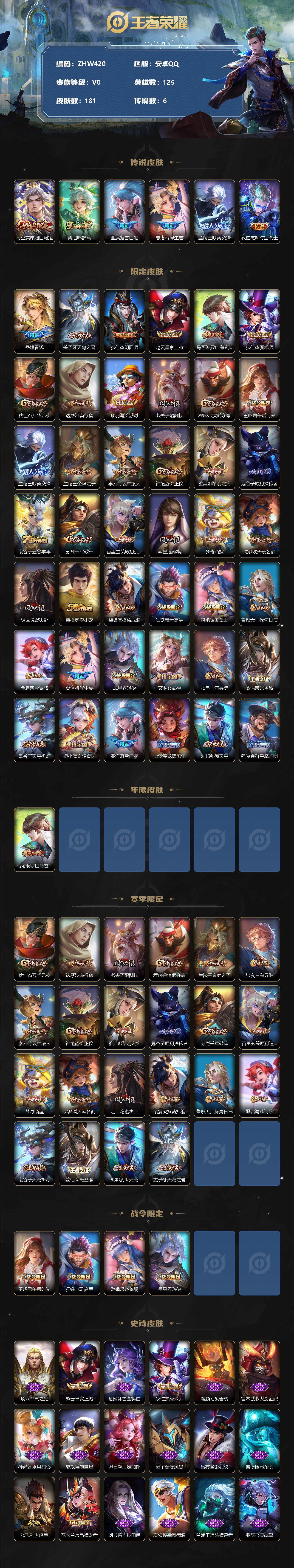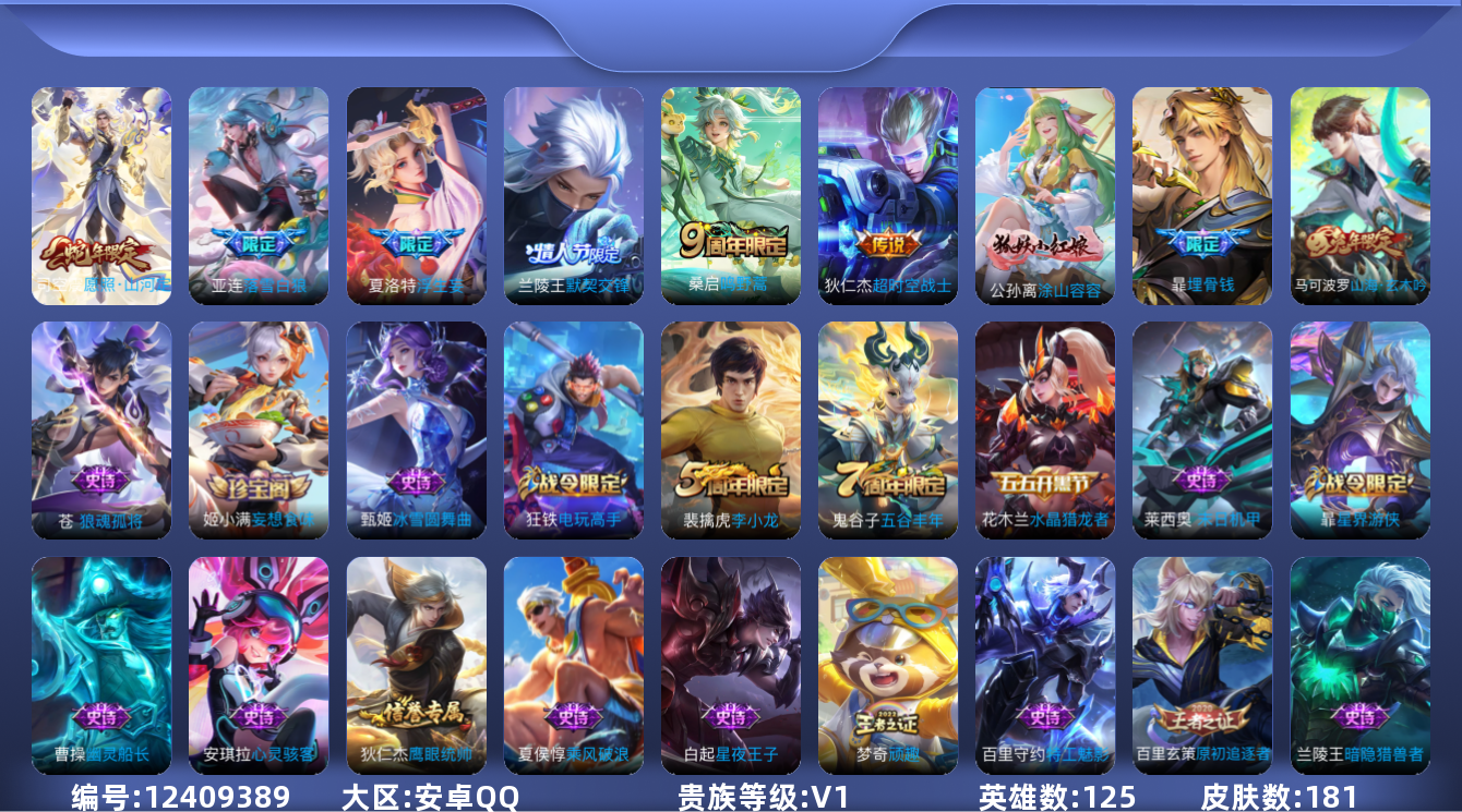[12409389]【特价急出/详情看图】:安卓Q-V0-最强王者段位-125英雄-181皮肤-6传说-40史诗