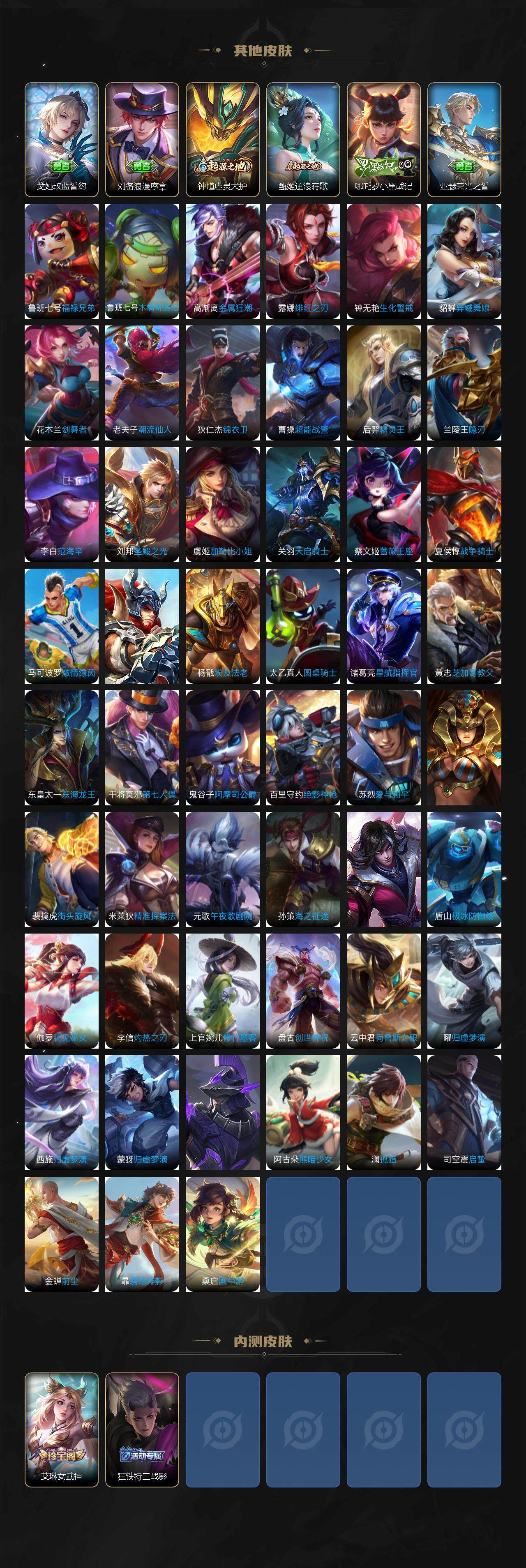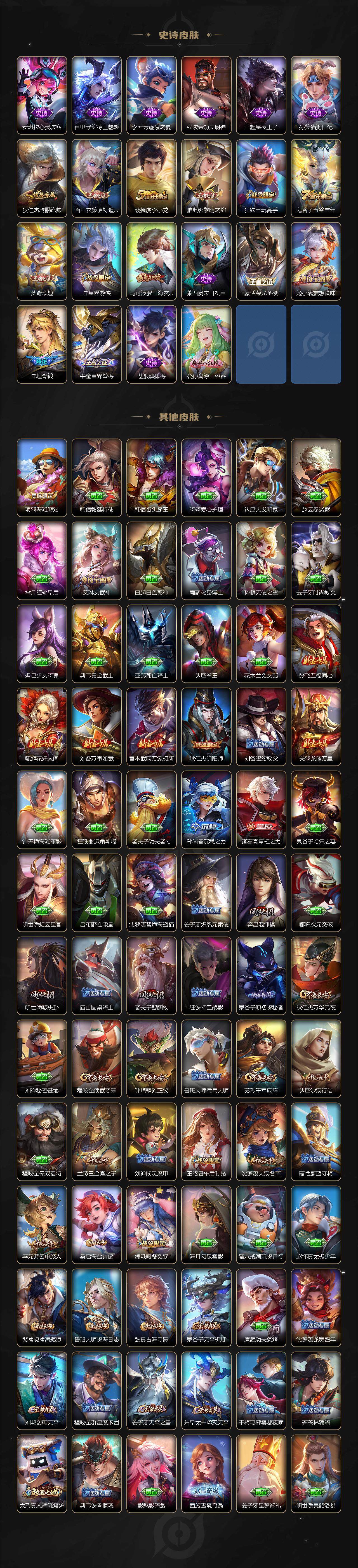 【史诗皮肤】:项羽苍穹之光,赵云皇家上将,甄姬冰雪圆舞曲,狄仁杰魔术师,廉颇地狱岩魂,宫本武藏鬼剑武藏,孙尚香水果甜心,嬴政摇滚巨星,妲己魅力维加斯,墨子金属风暴,吕布圣诞狂欢,曹操幽灵船长,张飞乱世虎臣,花木兰水晶猎龙者,刘邦德古拉伯爵,夏侯惇乘风破浪,兰陵王暗隐猎兽者,亚瑟心灵战警,安琪拉心灵骇客,百里守约特工魅影,李元芳逐浪之夏,程咬金功夫厨神,白起星夜王子,孙策猫狗日记,狄仁杰鹰眼统帅,百里玄策原初追逐者,裴擒虎李小龙,雅典娜黎明之约,狂铁电玩高手,鬼谷子五谷丰年,梦奇顽趣,暃星界游侠,马可波罗山海玄木吟,莱西奥末日机甲,蒙恬荣光圣徽,姬小满妄想食味,暃埋骨钱,牛魔星界战将,苍狼魂孤将,公孙离涂山容容