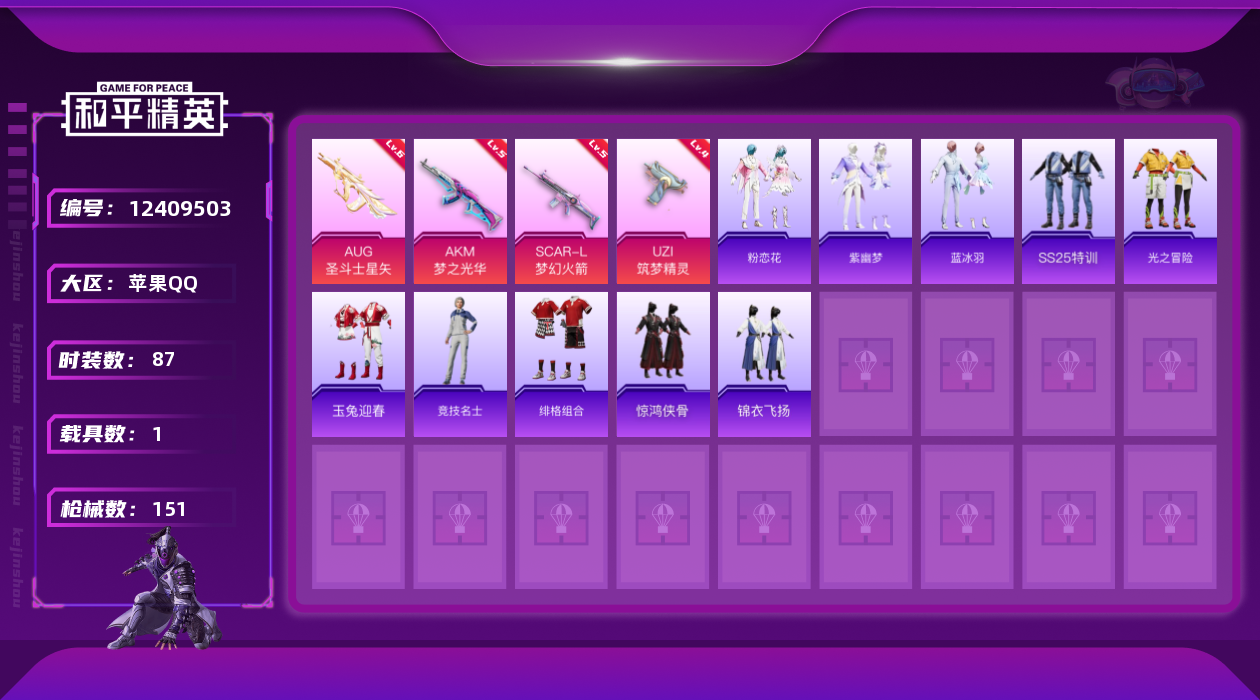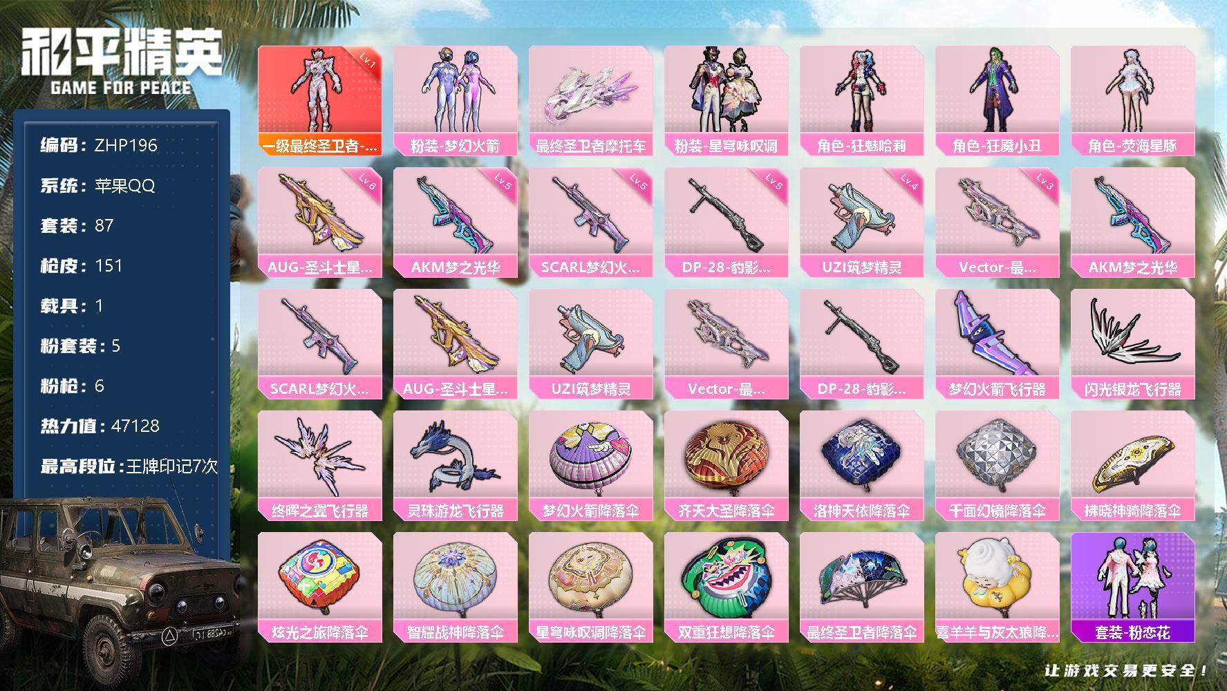 [12409503]【商品标题】:帕修斯!梦幻火箭!苹果 手Q-1神装-5粉装-6特效枪-1载具-4粉色飞行器-47128热力值-7王牌印记-87套装-151枪皮