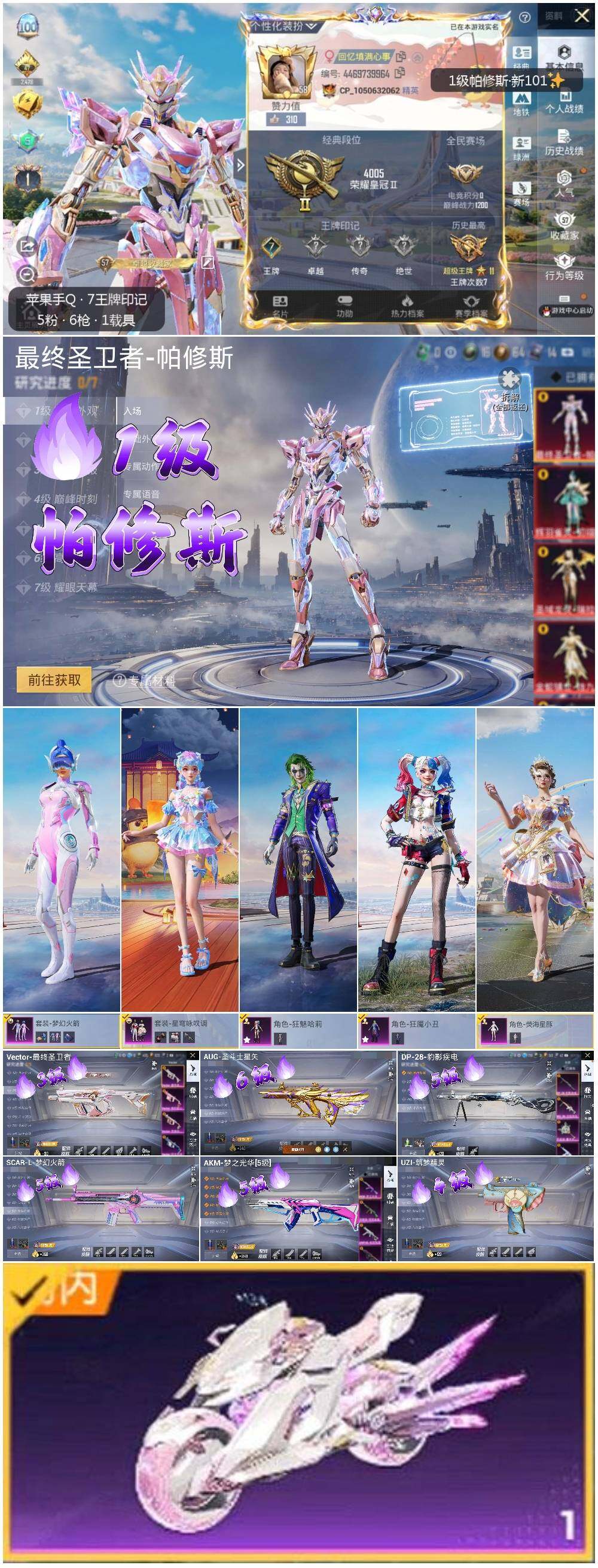 [12409503]【商品标题】:帕修斯!梦幻火箭!苹果 手Q-1神装-5粉装-6特效枪-1载具-4粉色飞行器-47128热力值-7王牌印记-87套装-151枪皮 【红色神装等级】:最终圣卫者-帕修斯(一级) 【红色角色神装】:最终圣卫者-帕修斯 【热门品类】:粉装-梦幻火箭 【粉色载具】:最终圣卫者摩托车 【粉色套装】:粉装-梦幻火箭,粉装-星穹咏叹调,角色-狂魅哈莉,角色-狂魇小丑,角色-荧海星豚 【粉色枪皮等级】:AKM-梦之光华(五级),SCAR-L-梦幻火箭(五级),AUG-圣斗士星矢(六级),UZI-筑梦精灵(四级),Vector-最终圣卫者(三级),DP-28-豹影疾电(五级) 【粉色枪皮】:AKM-梦之光华,SCAR-L-梦幻火箭,AUG-圣斗士星矢,UZI-筑梦精灵,Vector-最终圣卫者,DP-28-豹影疾电 【粉色飞行器】:梦幻火箭飞行器,闪光银龙飞行器,终晖之翼飞行器,灵珠游龙飞行器 【粉色降落伞】:梦幻火箭降落伞,齐天大圣降落伞,洛神天依降落伞,千面幻镜降落伞,拂晓神骑降落伞,炫光之旅降落伞,智耀战神降落伞,星穹咏叹调降落伞,双重狂想降落伞,最终圣卫者降落伞,喜羊羊与灰太狼降落伞 【稀有套装】:套装-粉恋花,套装-紫幽梦,套装-蓝冰羽,套装-星渊小夜曲,套装-霓虹热舞,套装-彩虹兔,套装-云朵鹅,套装-雪绒豹,套装-诡诞巡游,套装-混沌火种,角色-乐音,套装-朱霞炽焰,套装-凌霄紫焰,套装-擎苍青焰,玩偶服-美羊羊,玩偶服-喜羊羊 【稀有枪皮】:AKM-2P战斗服款,AKM-冰凉西瓜,AKM-生命誓言,AKM-虎虎生威,AKM-霓虹街区,AKM-龙的传人,M16A4-幻世战舞者,M16A4-甜心亚梦,M16A4-最终圣卫者,SCAR-L-炫彩节奏,SCAR-L-玉兔迎春,SCAR-L-红色方程式,SCAR-L-黄金龙骨,M416-红色方程式,GROZA-异彩先驱,GROZA-恐龙拽拽,GROZA-春暖花开,GROZA-紫翼圣骑,AUG-幻影战神,QBZ-飞驰魅影,M762-彩虹符号,M762-瑞龙福将,M762-云朵鹅,G36C-星穹咏叹调,AC-VAL-天降萌叽,AC-VAL-甜心亚梦,蜜獾-天降萌叽,蜜獾-娇憨猪猪,ARX-凌霄紫焰,UZI-天降萌叽,UZI-娇憨猪猪,UZI-红色方程式,UMP45-蓝色火焰,Vector-彩虹符号,Vector-生命