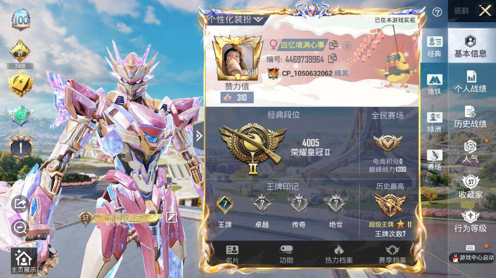 - PX_2056810- 安卓手Q-4王牌印记-1粉装-3特效枪-1载具-24812热力值-58套装-92枪皮-0卓越印记-0传奇印记 【1粉装】,星穹咏叹调 【3特效枪】AKM-绿萝繁花-5级 SCAR-L-锦绣绵绵-5级 Kar98K-巳巳如意-5级 【1稀有紫装】,龟仙人, 【1稀有载具】,宾利BATTUR(极速紫), 【58稀有时装】,SS31特训,SS33特训,SS32特训,蓝冰羽,极速