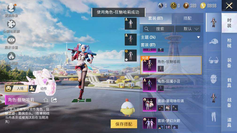 【粉色套装】:粉装-梦幻火箭,粉装-星穹咏叹调,角色-狂魅哈莉,角色-狂魇小丑,角色-荧海星豚