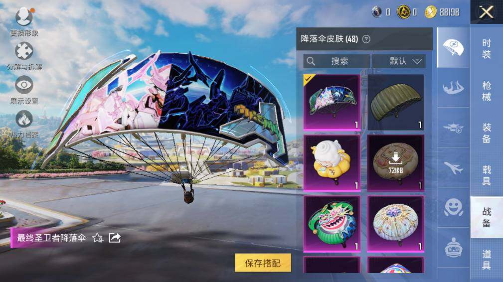 【粉色降落伞】:梦幻火箭降落伞,齐天大圣降落伞,洛神天依降落伞,千面幻镜降落伞,拂晓神骑降落伞,炫光之旅降落伞,智耀战神降落伞,星穹咏叹调降落伞,双重狂想降落伞,最终圣卫者降落伞,喜羊羊与灰太狼降落伞